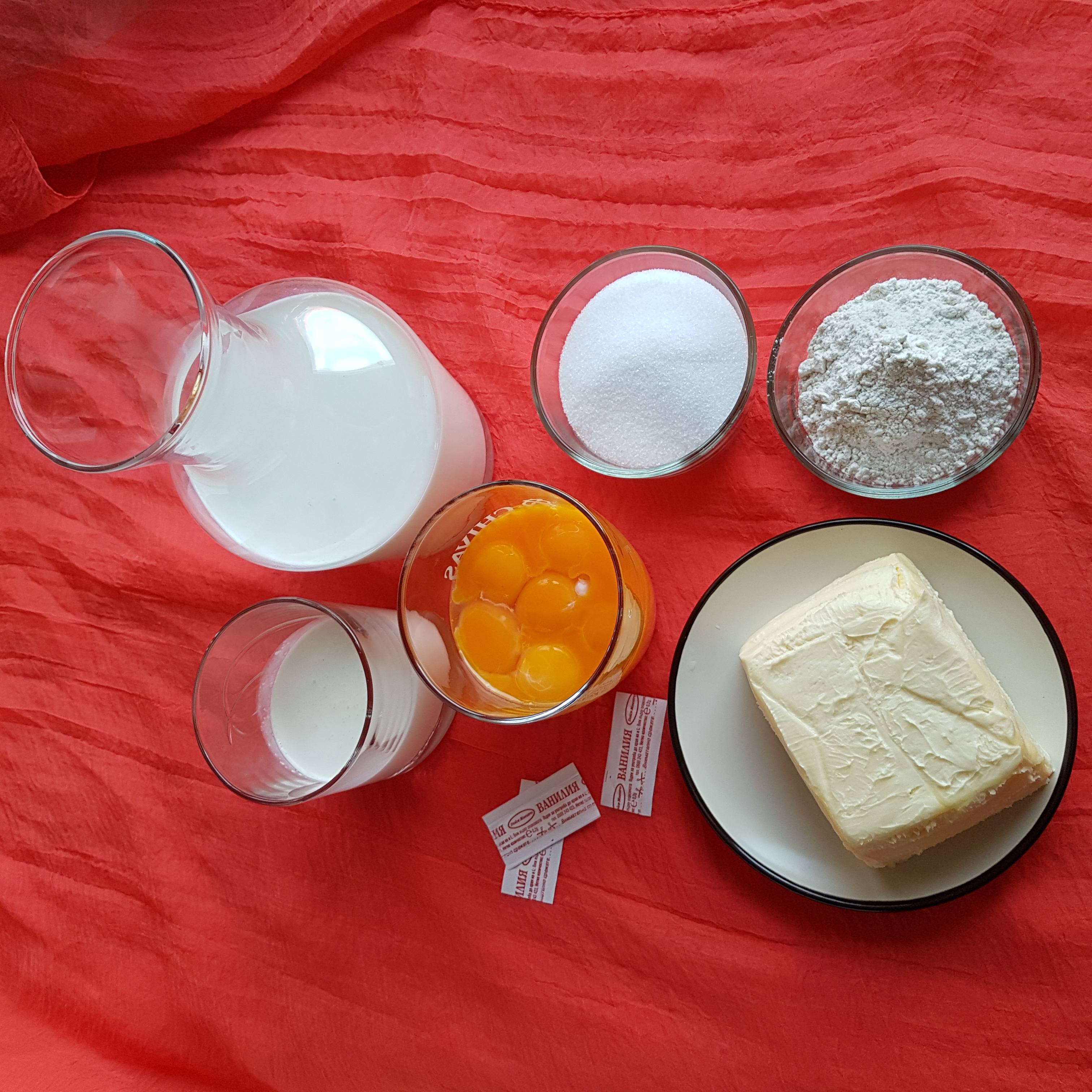 Сега да приготвим крема. В половината прясно мляко разбийте с миксер много добре жълтъците, брашното и захарта. Другата половина от млякото сложете на котлона да загрее. Когато това се случи го махнете и на тънка струйка добавете яйчената смес в него. Намалете силата на котлона наполовина и го върнете да се свари бавно. Тук вече е нужно голямо търпение. Не спирайте да разбърквате. Когато кремът стане много гъст го махнете от котлона и прибавете ванилиите. Оставете го да изстине. Разбийте маслото да стане пухкаво и после прибавете към него яйчения крем. Разбийте много добре с миксер, докато кремът стане гладък. Оставете го в хладилника, за да стегне, покрит с фолио, за да не изсъхва отгоре.