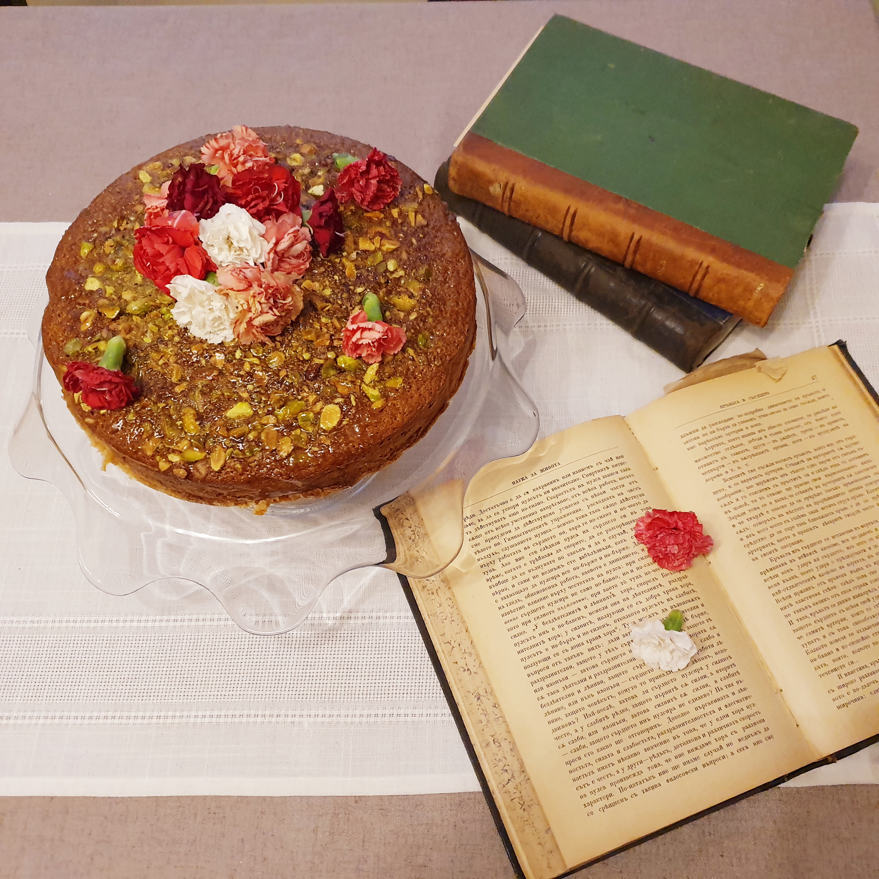 Когато тортата е готова я извадете от фурната и я оставете да се охлади. През това време загрейте на слаб котлон меда и с помощта на четка го намажете върху тортата. Накрая поръсете / украсете с ядивни цветя. Моите бяха карамфилчета. Но освен тях може да ползвате рози (свежи, сухи, захаросани), теменужки, невен…Каквото ви се иска и с каквото разполагате. А може и да пропуснете цветята, ако не сте фен. Украсата е преди всичко за душата. А всяка душа се радва на различни неща. 🙂