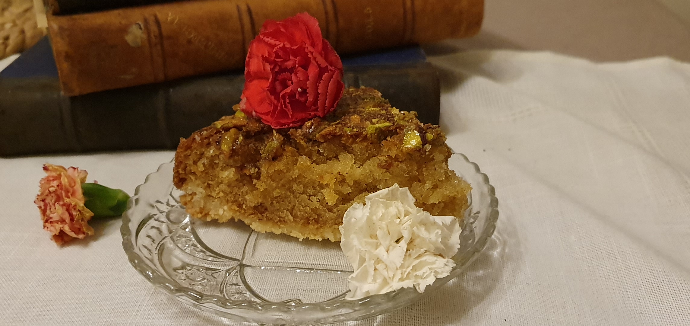 Избрах за вас “Nutmeg cake” – лакомство с индийско орехче, което много ме притесняваше да не е натрапчиво на вкус. Когато бях дете, у нас се намираше винаги от тази подправка. Баба ми явно го е ползвала, но нямам спомени за какво. Едва сега аз го ползвам за първи път в живота си и то с доста резерви. Този десерт е сравнително лесен, а се оказа доста вкусен. Отнема малко време за приготвяне, но накрая се получава десерт с три слоя. Най-отдолу е маслената и ронлива основа (като маслена бисквитка). Следва мека и сочна средна част. И накрая е хрупкавият пласт от шам фъстък, полят с дъхав мед и украсен с ядивни цветя. Почувствахте ли се съблазнени да опитате този десерт? Ето и необходимите продукти: