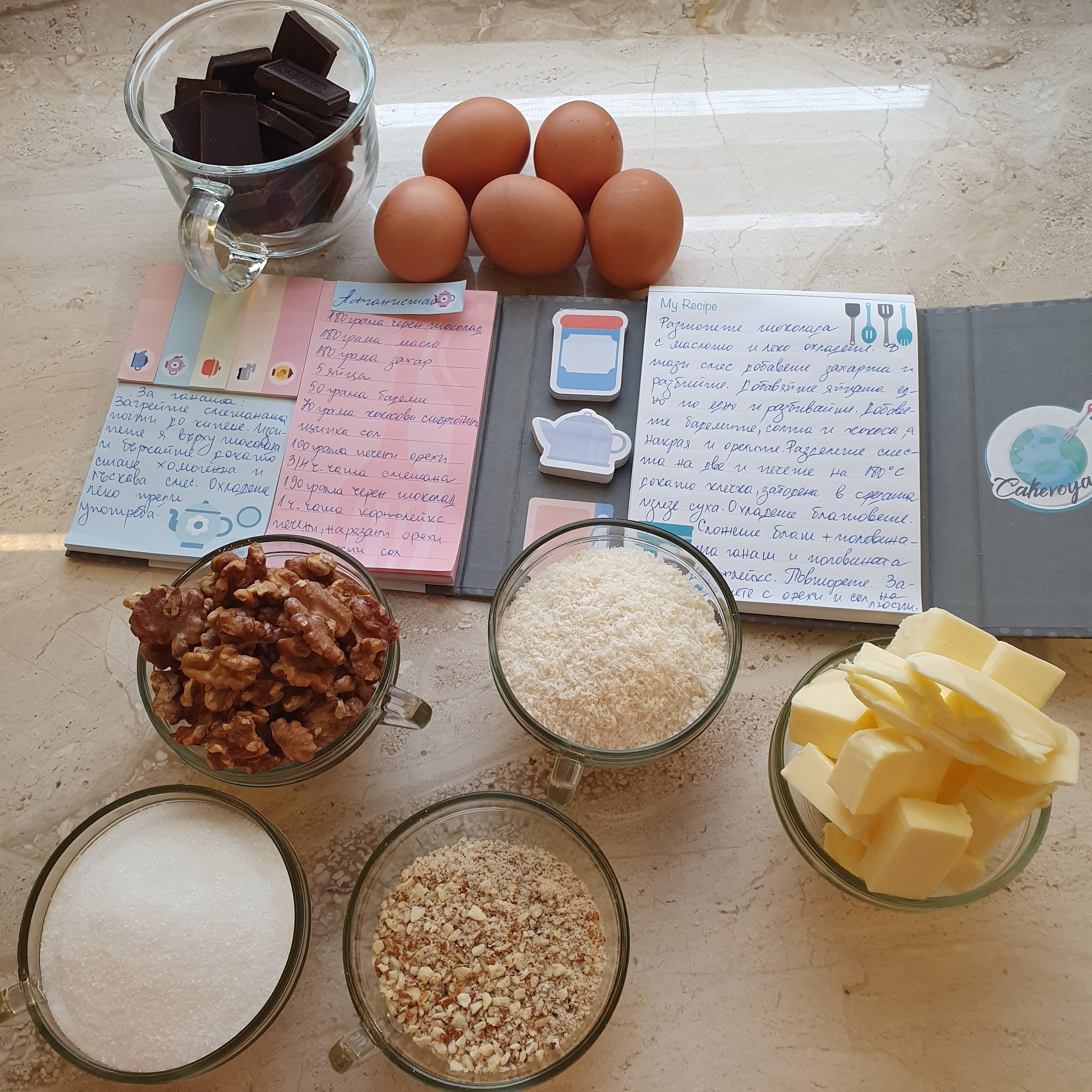 Загрейте фурната на 180 ° C . Разтопете на слаб котлон шоколада и маслото. Охладете леко и прибавете захарта. Разбийте до хомогенност. Добавете яйцата едно по едно като не спирате да разбивате с миксера. Накрая едно след друго  в сместа прибавете бадемите, кокосовите стърготини, орехите и солта.