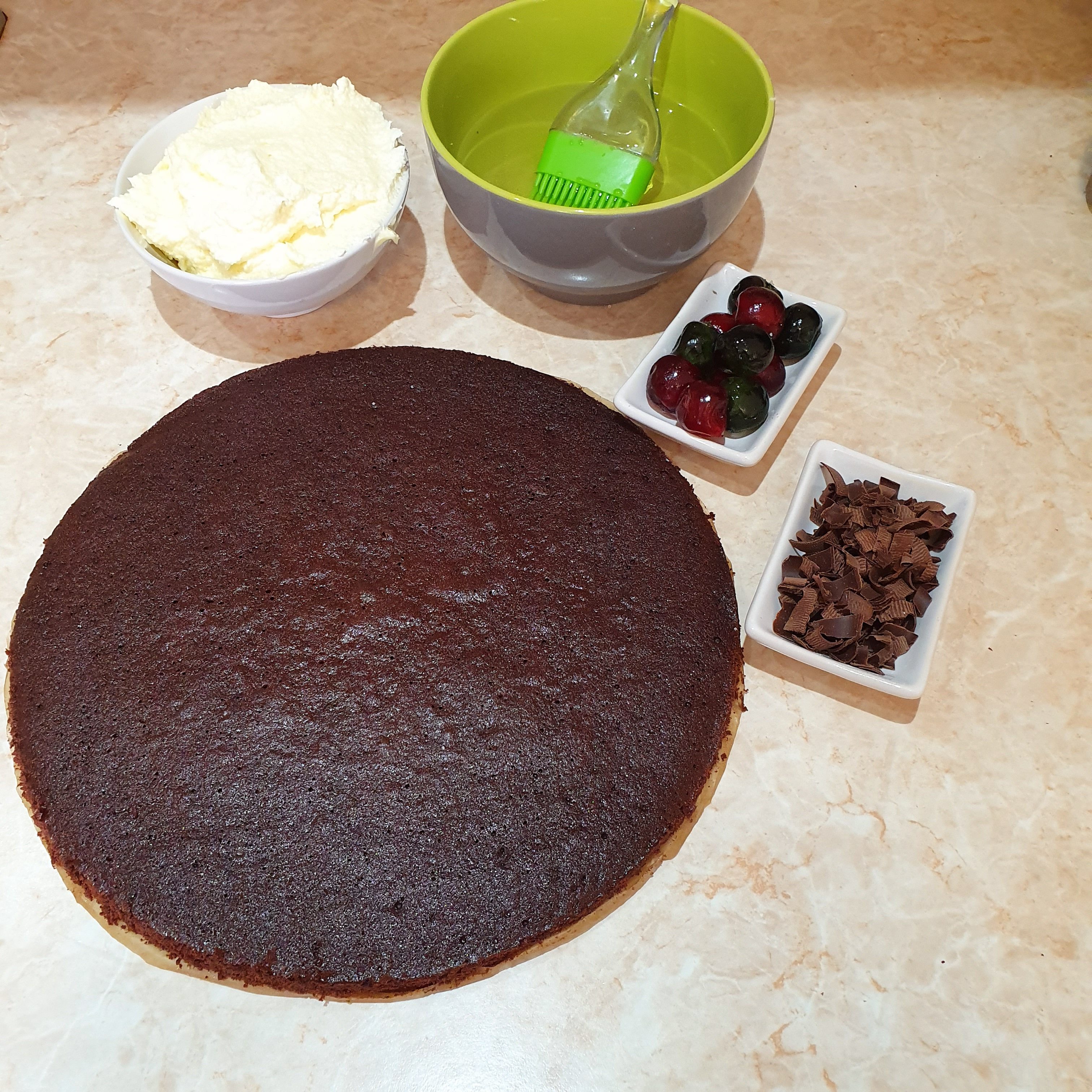 Отворете консервата череши и източете течността (черешовия сироп). Измерете 1 чаша сироп и добавете ¼ чаша захар. Разбъркайте докато се разтвори захарта. Ако не използвате консервирани череши направете сироп от чаша захар и чаша вода както направих аз. Поставете първия блат. Полейте го с 2 супени лъжици сироп. С помощта на шпатула разстелете част от битата сметана или масления крем. Ако правите “Шварцвалд” сложете няколко череши. Процедирайте така и с другите два блата. Накрая декорирайте с череши и настърган шоколад. Поставете тортата в хладилника поне за час .
