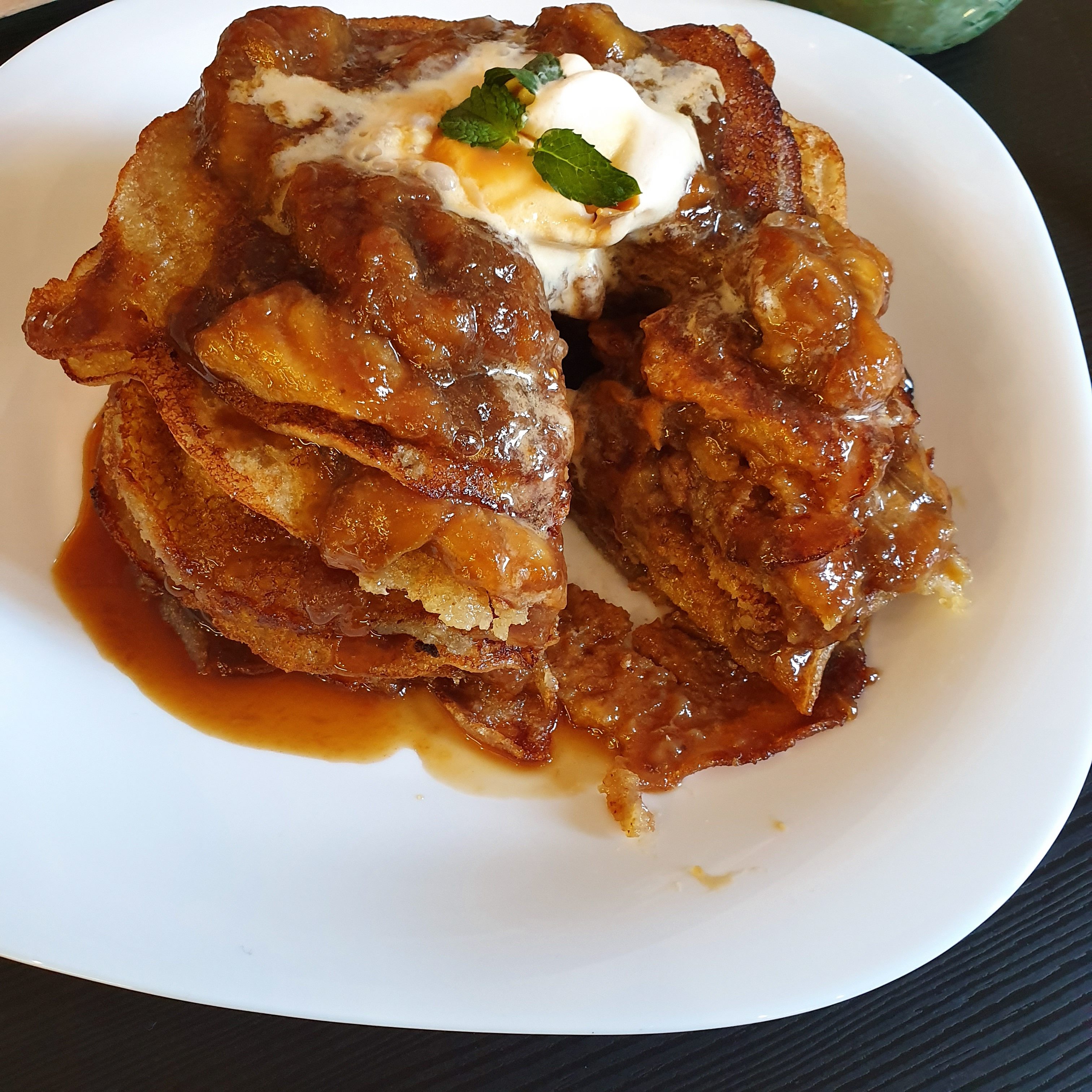 Аз сглобих тортата като редувах палачинка и смес от банани и сироп до изчерпване на количествата. Накрая за разкош сложих малко карамелен сладолед отгоре и опитах лакомството още докато беше топло. И тъй като сега са т.нар. “горещници” реших да добавя към следобедното сладко разточителство бананов шейк с бадемово мляко и сладолед. Стана страхотна комбинация. А и аз много обичам банани. Техният вкус беше доминиращ във всеки един компонент от приключението Бенин.