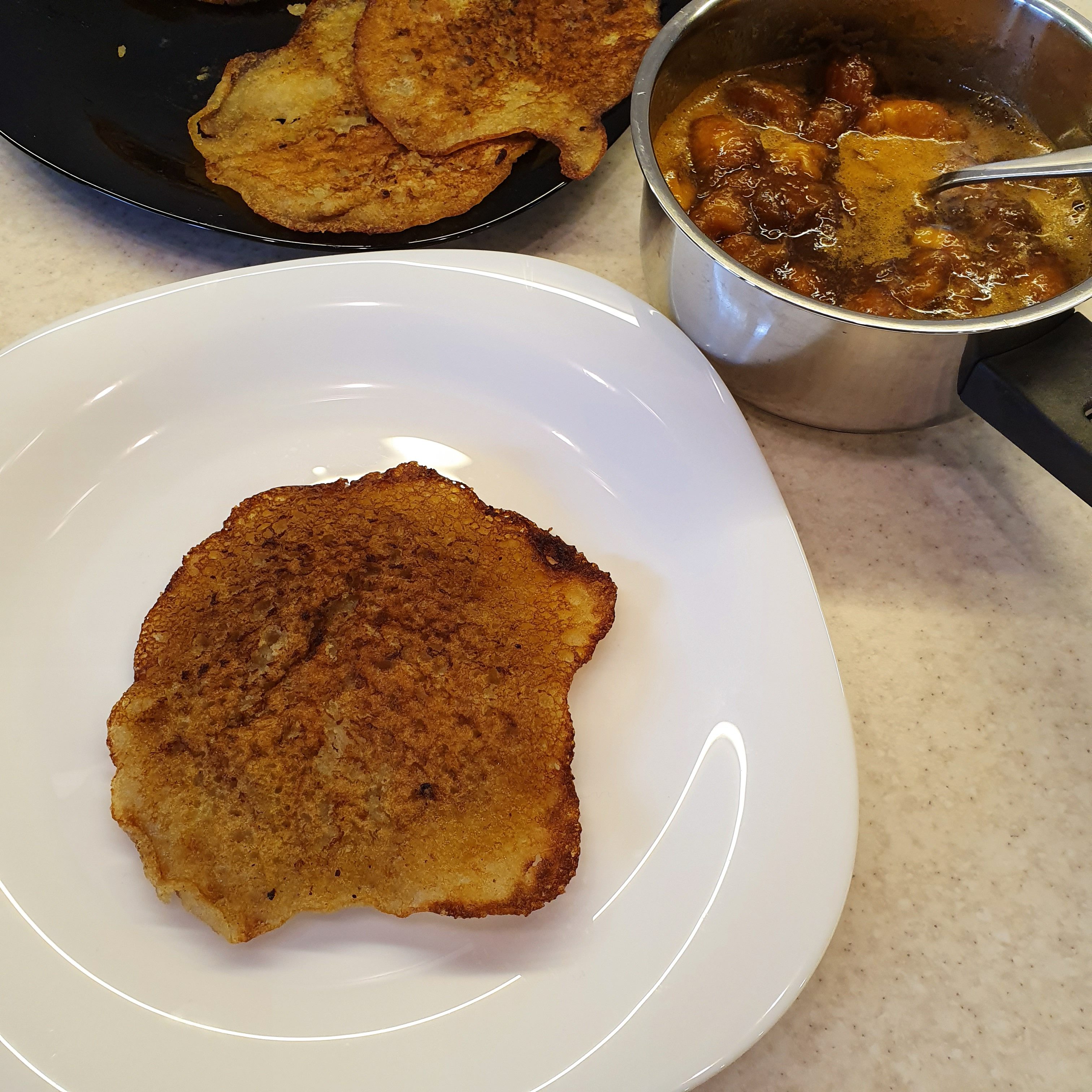 Смесете брашното от просо с вода докато можете от сместа да оформите топка. Оставете тестото, завито във фолио за свежо съхранение в хладилника за 8 часа. След това в блендер добавете вода, за да стане на гъстота една идея по-гъсто от стандартна смес за палачинки. Сварете добре ориза, изцедете го и го смесете до кремообразна смес в блендера със сместа от просо и вода. Оставете го за около 15 минути. Накрая добавете захарта и смачкания банан и миксирайте всичко до гладка смес. Добавете още вода, за да направите сместа на гъстота като за обикновените палачинки. Пържете в тиган по обичайния начин както, когато правите палачинки. Малко е трудно обръщането, защото заради захарта в тестото палачинките се карамелизират, но с две шпатули все пак се обръщат. 🙂