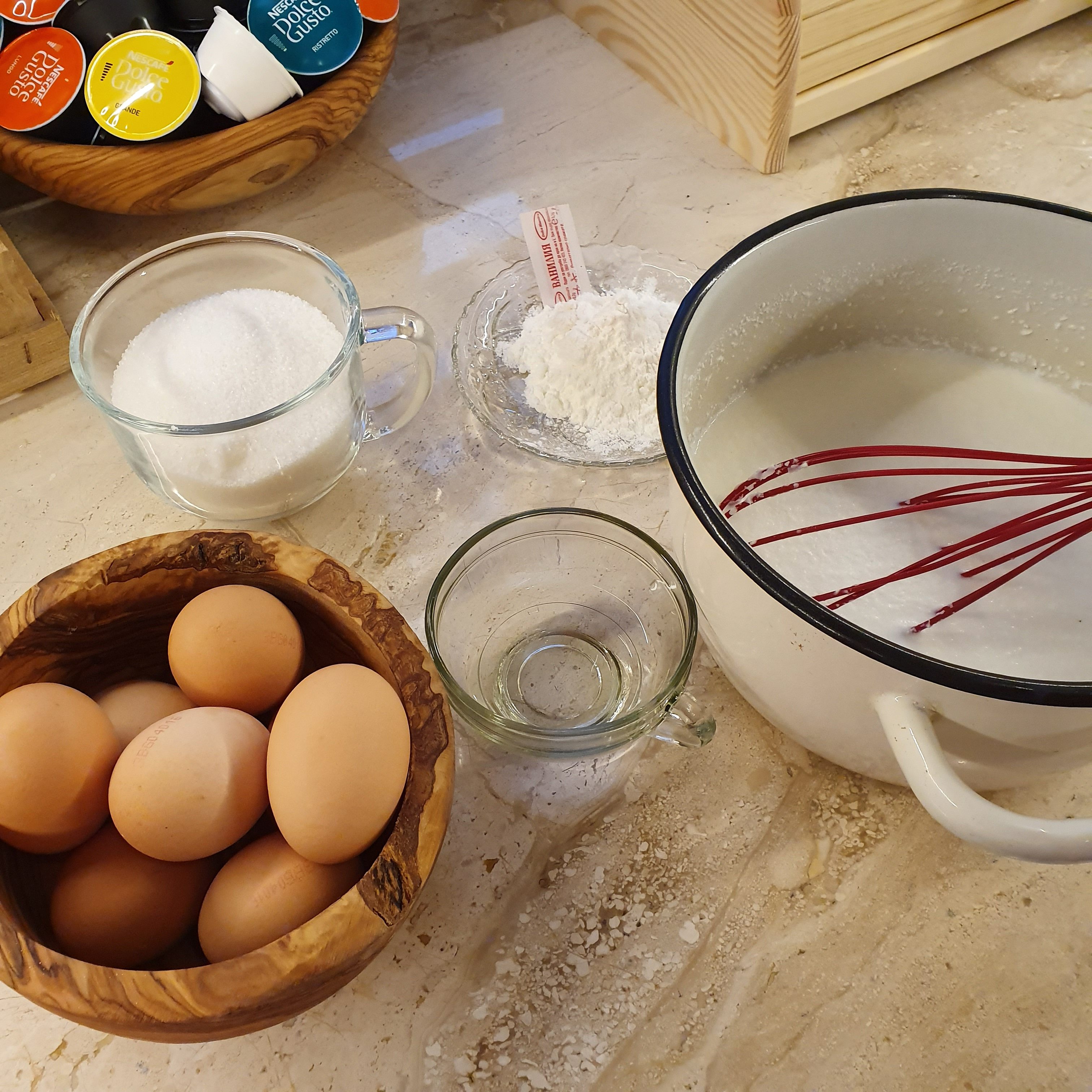 След това го дръпнете настрана да постои малко. Разбийте жълтъците със захарта до бяло. Смесете царевичното нишесте с водата докато се разтвори и течността добавете към жълтъците. Разбийте добре. На тънка струя добавете прецеденото прясно мляко. Добавете солта.