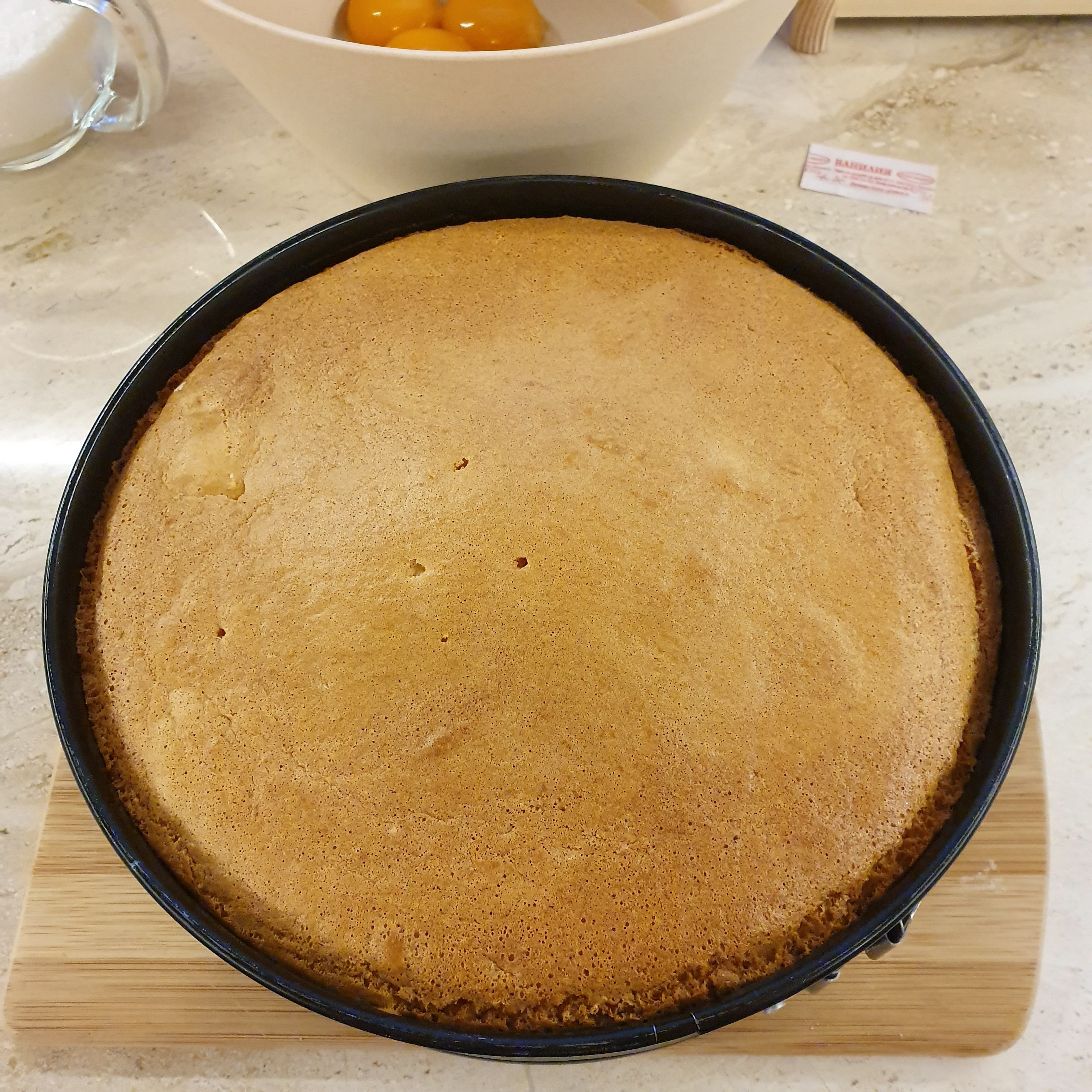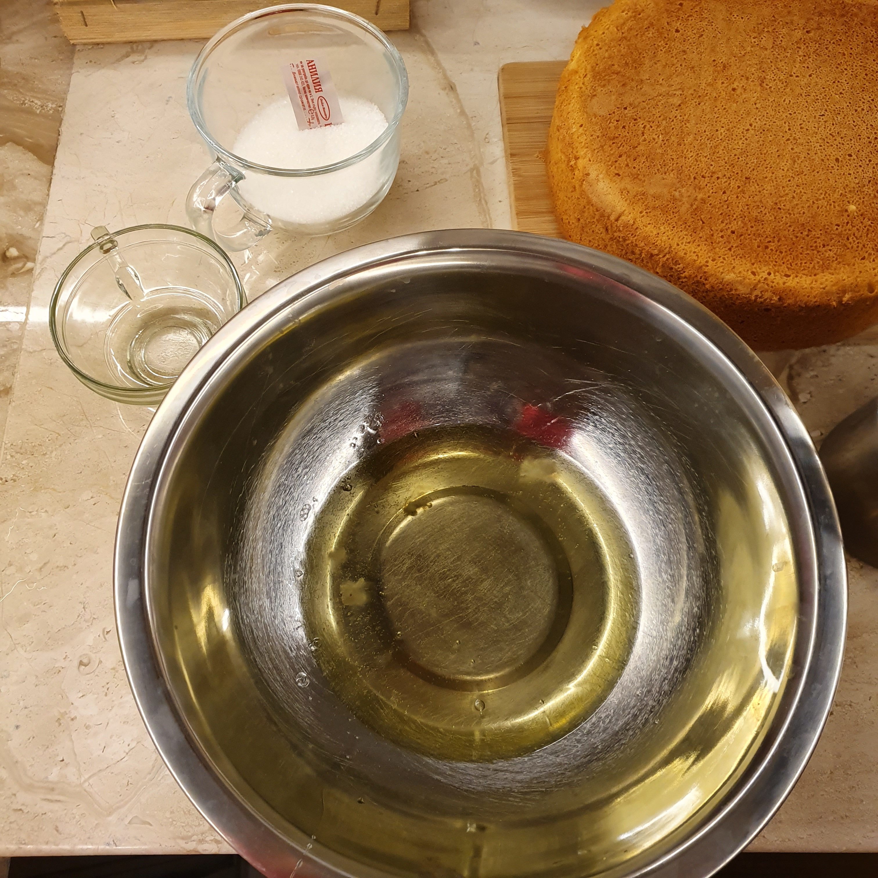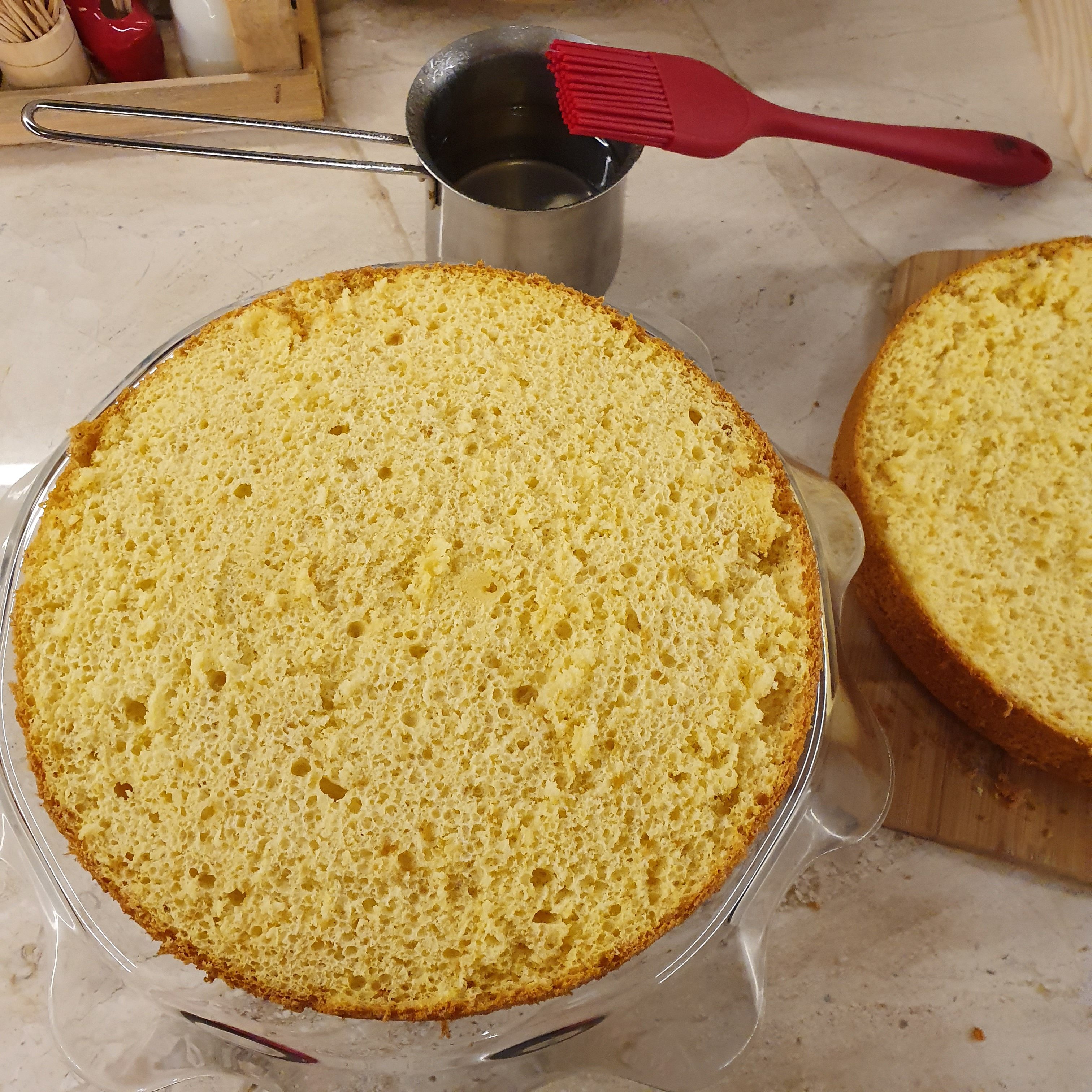 Сега да сглобяваме тази вкуснотия. С помощта на назъбен нож или конец разрежете блата на три блата. Има и специални сладкарски приспособления за помощ в такива случаи, но аз нямам, защото място не остана в кухнята от моите сладкарски пособия. 🙂 Поставете в чиния за сервиране единия блат. С помощта на четка го напойте със сироп без да прекалявате. Не правим реване все пак.