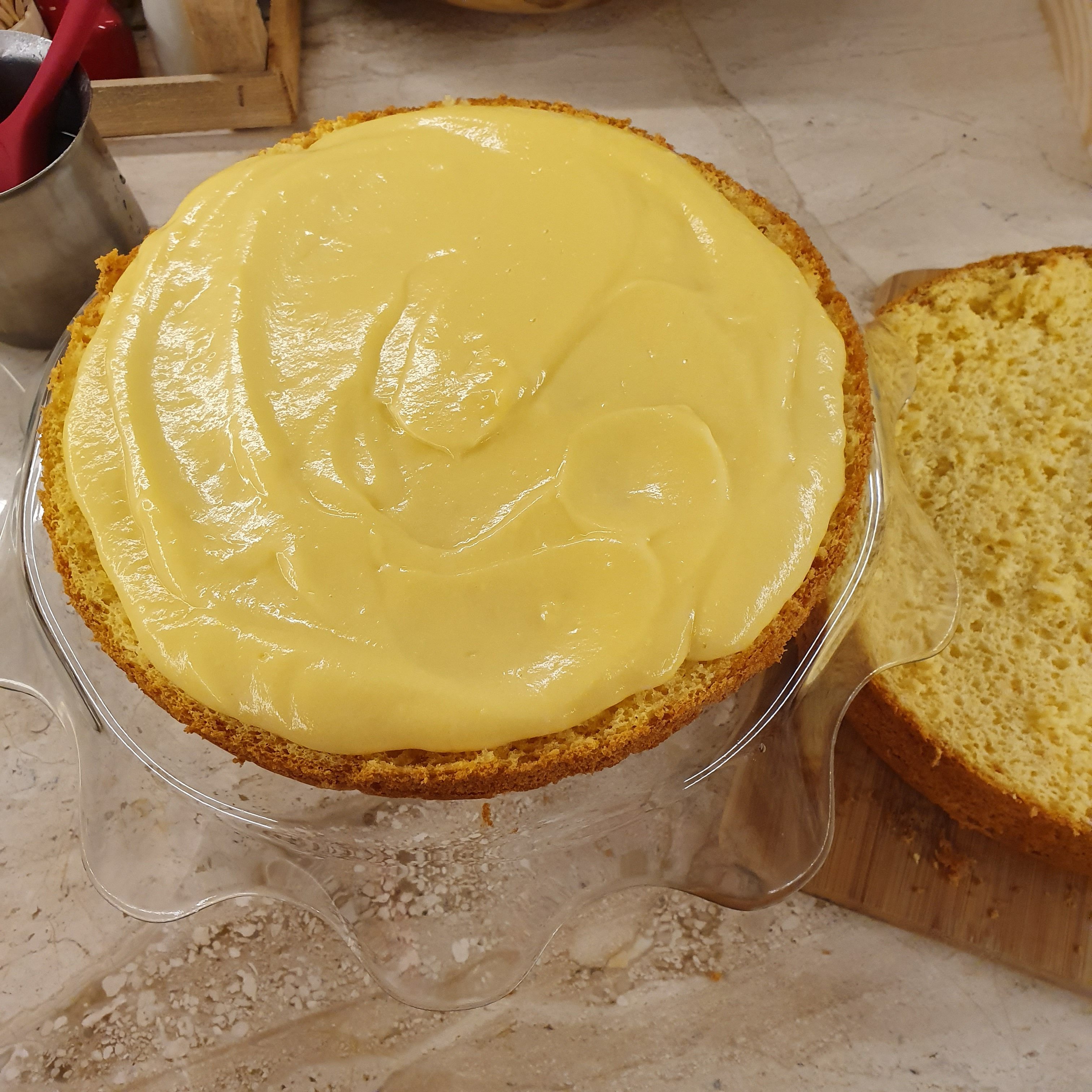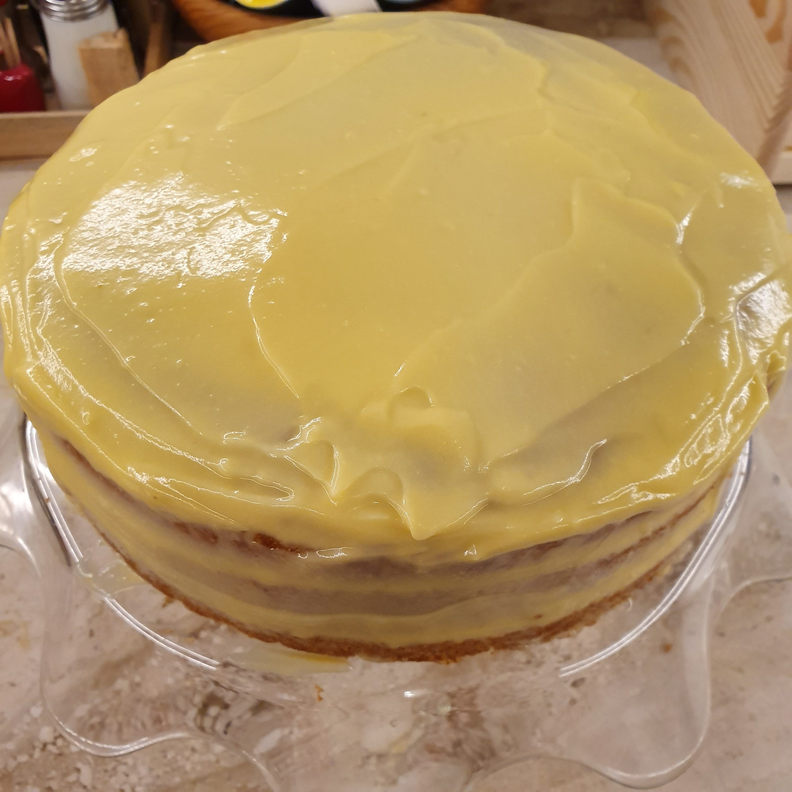 Махнете го от котлона и го покрийте с фолио за свежо съхранение, за да не хване коричка. Охладете го напълно преди да сглобите тортата.