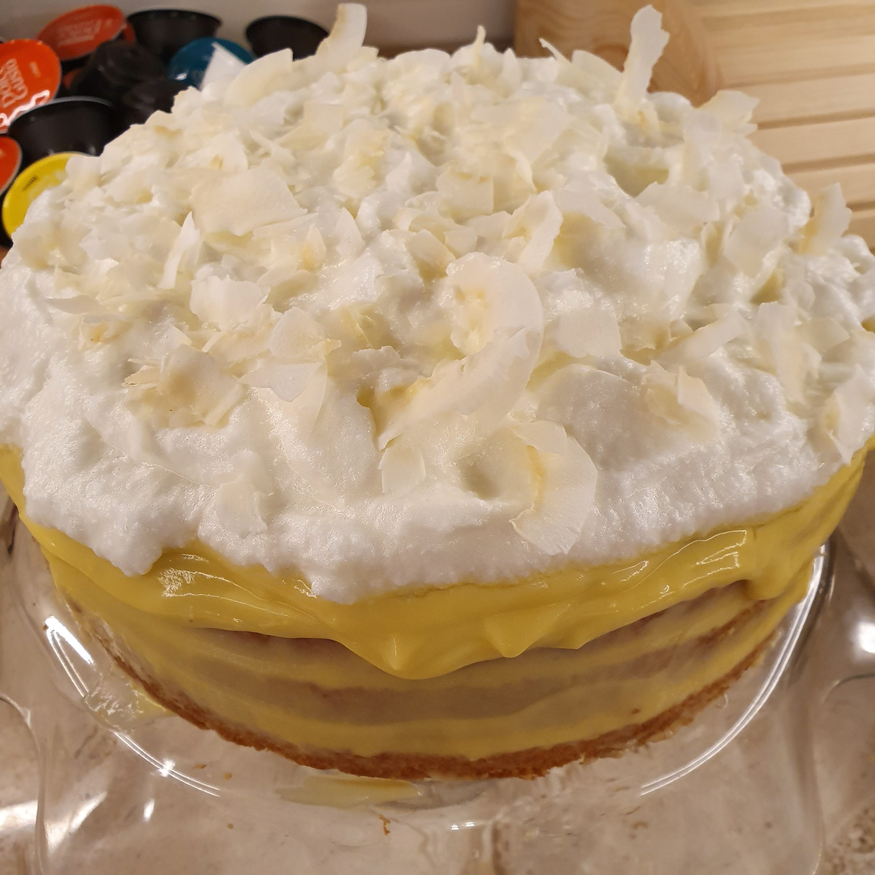 С останалите два блата повторете процедурата. Най-отгоре разпределете меренга върху крема и украсете по ваш вкус. Аз използвах люспи кокос заради кокосовия крем, но не мисля, че ще е лоша идея да се добавят някакви ядки или шоколад. 😉