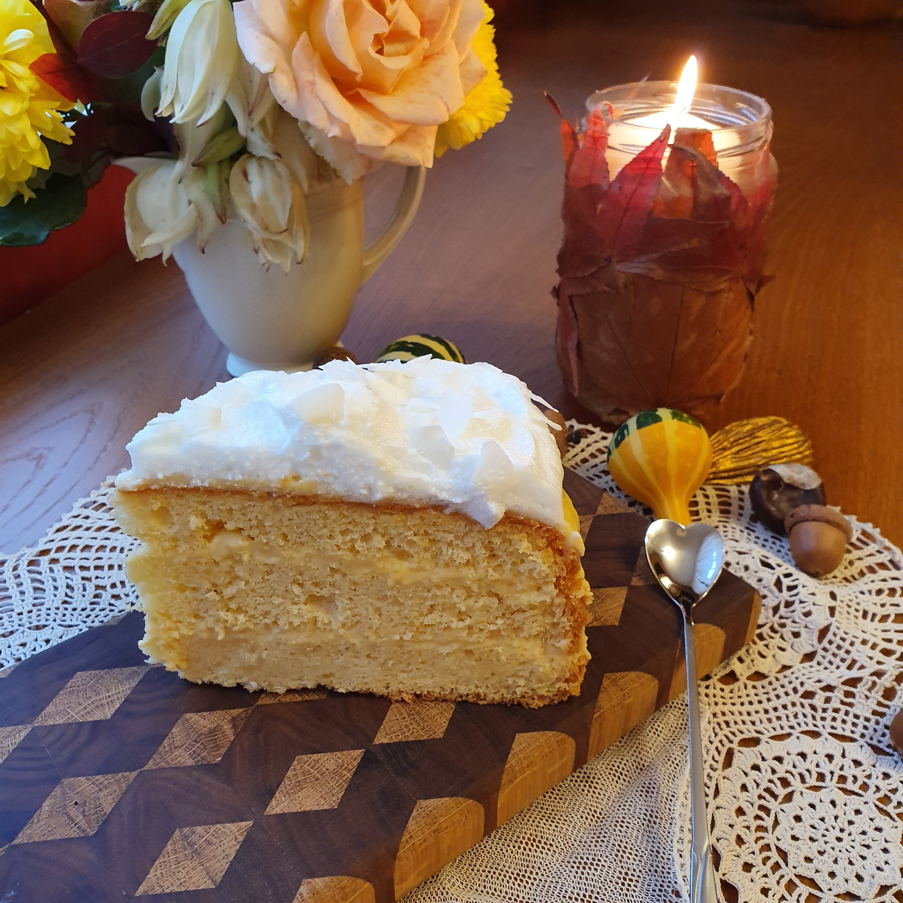 Оставете поне за няколко часа в хладилника , за да поемат блатовете крема преди да сервирате. Като изключим използването на кокос в рецептата тортата е доста класическа като вкус, което в никакъв случай не означава нещо лошо. Лично аз много харесвам торти с такъв класически тортен крем. Напомнят ми за детството, когато майка ми правеше такива. Вкусът е балансиран и тортата е лека. По скалата ми на трудност е около 4. Нищо кой знае колко сложно за изпълнение. Макар, че навън е много депресарски сезон, мъглата се стеле от два дни, а влагата и студа направо те пронизват до кости, в моята кухня звучи италианска музика и мирише на ванилия. Това успява да компенсира околната сивота. Като добавим и букетче с последните цъфнали цветя в градината и ароматна свещ и може би ще оцелея. 🙂