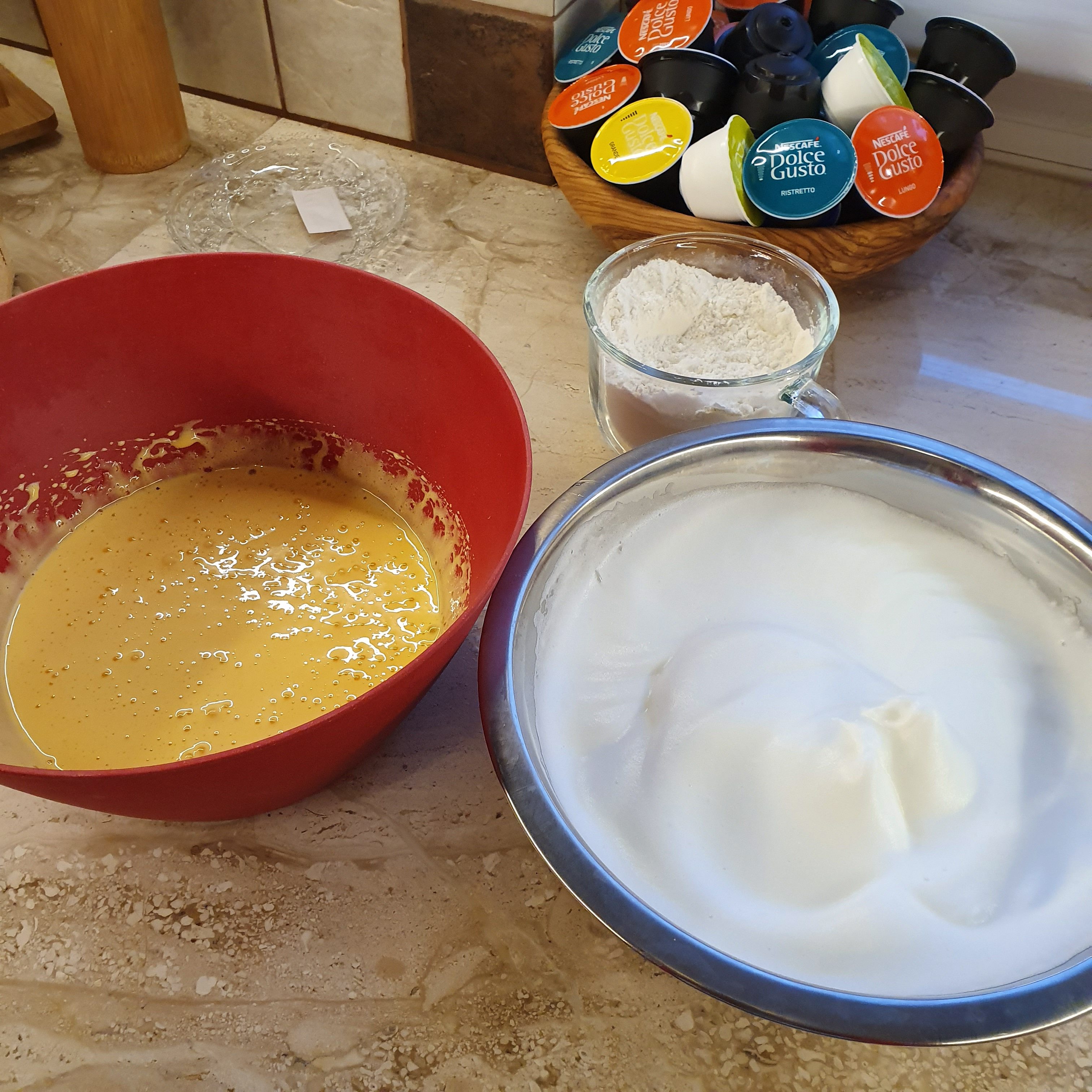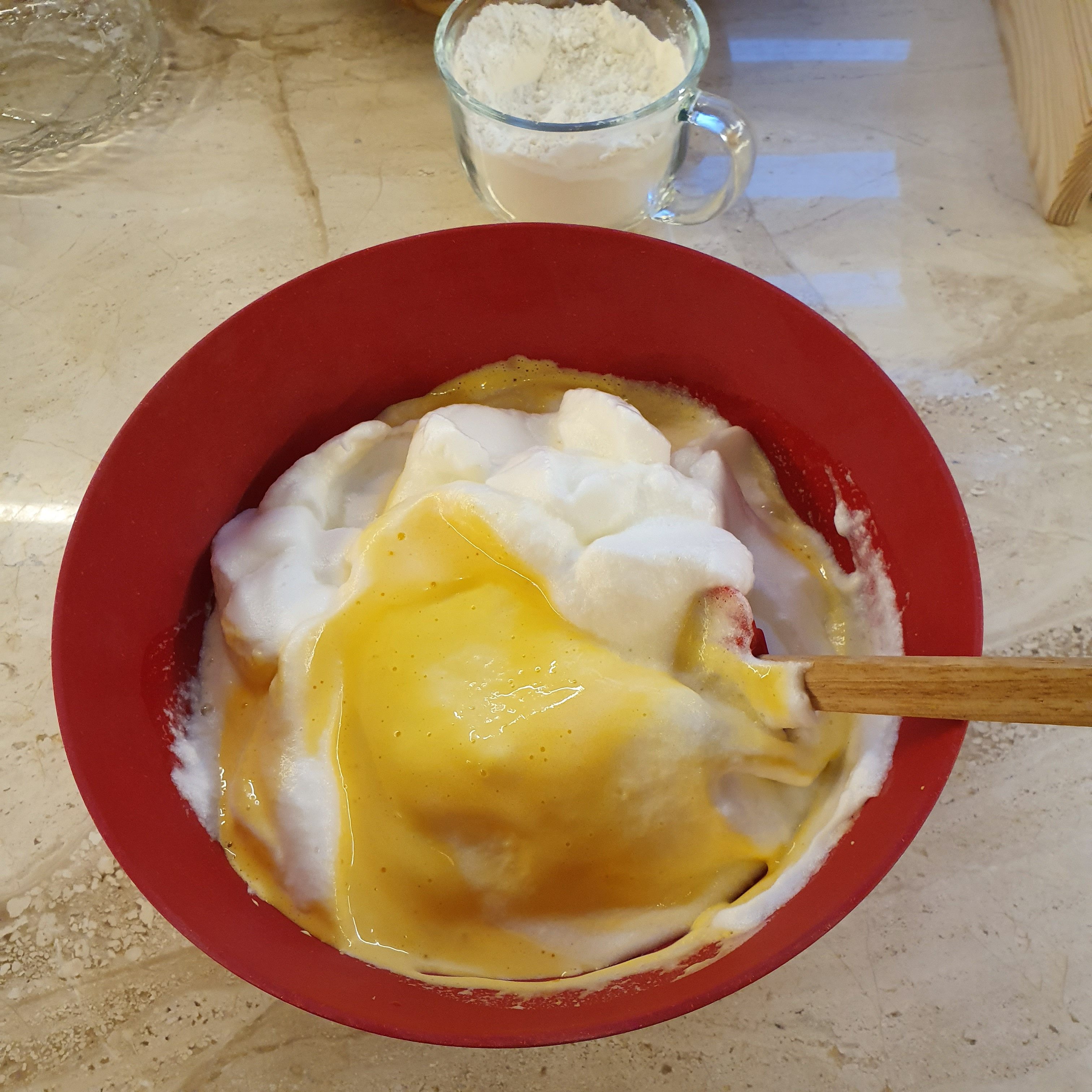 Разделете яйцата на жълтъци и белтъци. Разбийте белтъците с 5 супени лъжици захар и солта до меки връхчета. Отделно разбийте жълтъците с останалите 5 лъжици захар докато побелеят и удвоят обема си.
