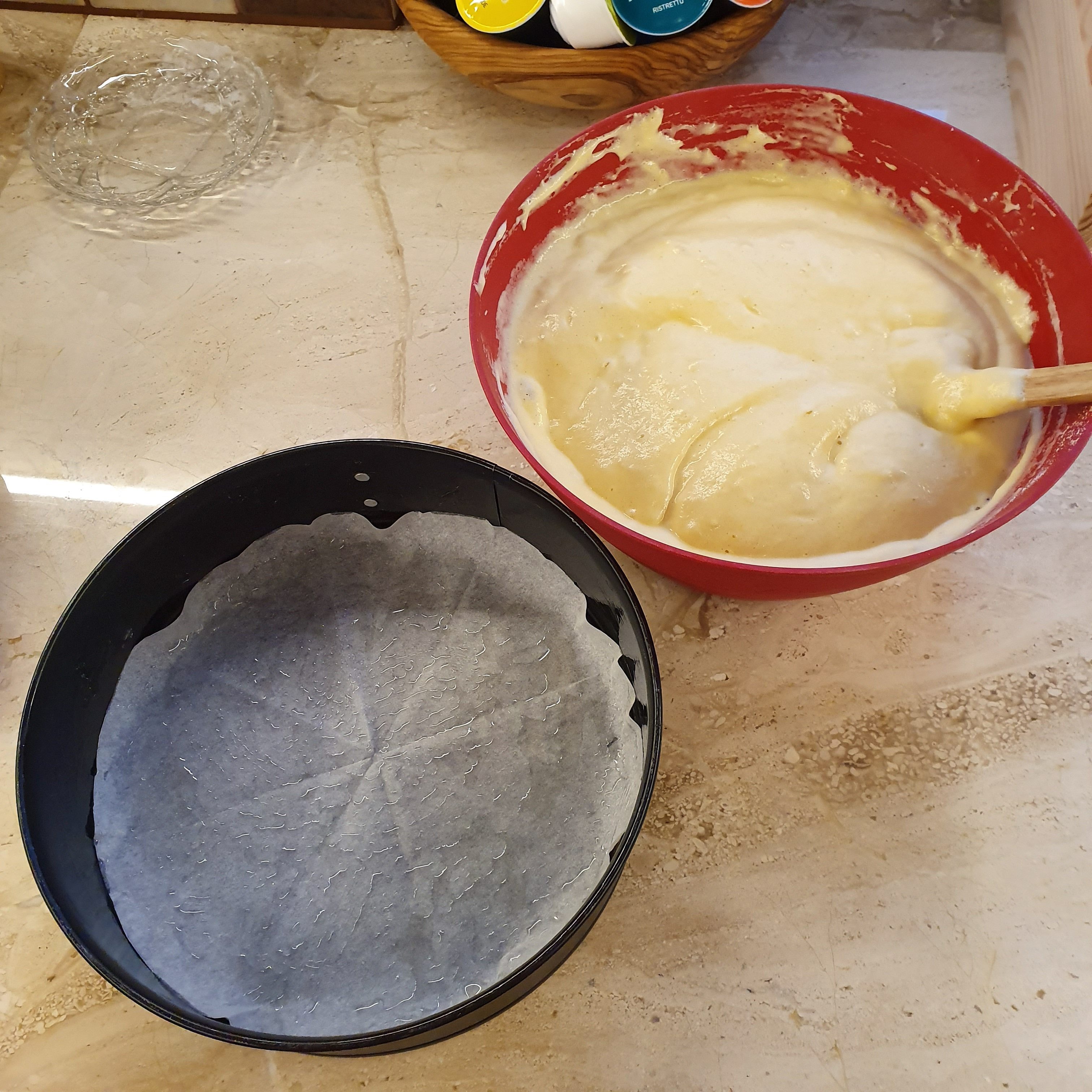 Бавно добавете смесените брашно и бакплувер и разбъркайте не много енергично до хомогенност. Застелете с хартия за печене тава с диаметър около 23 см. Намаслете хартията и стените на формата и изсипете сместа.