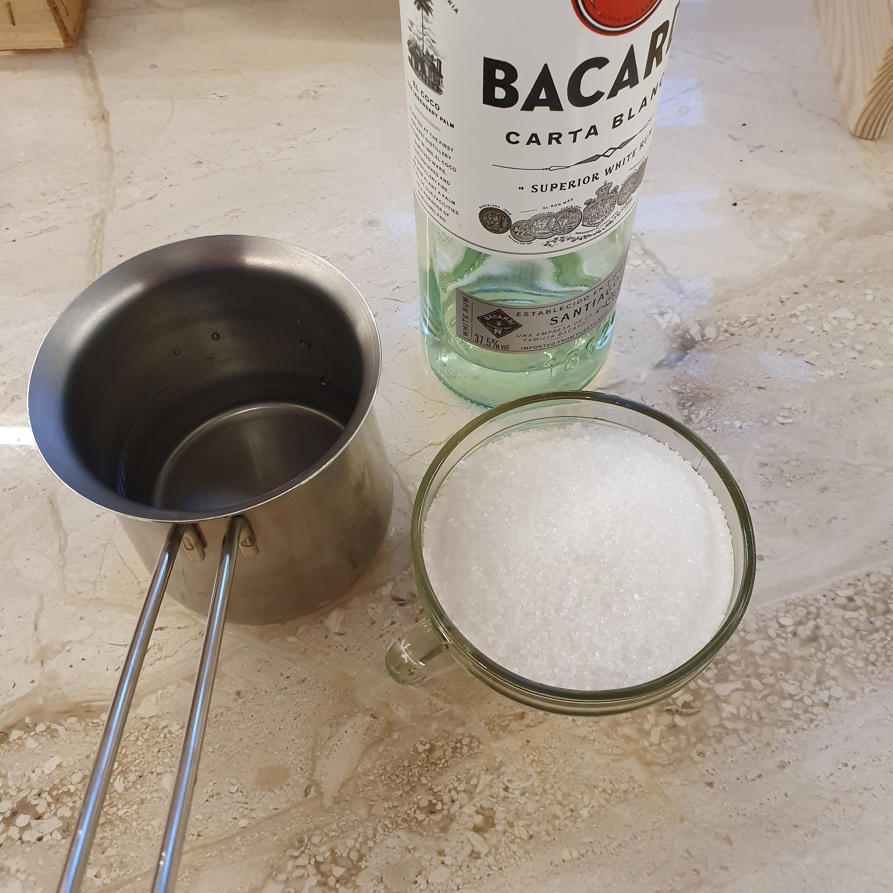Да направим сега сиропа. Сложете водата и захарта на котлона и варете докато сместа се сгъсти. Дръпнете го да изстине и прибавете рома.