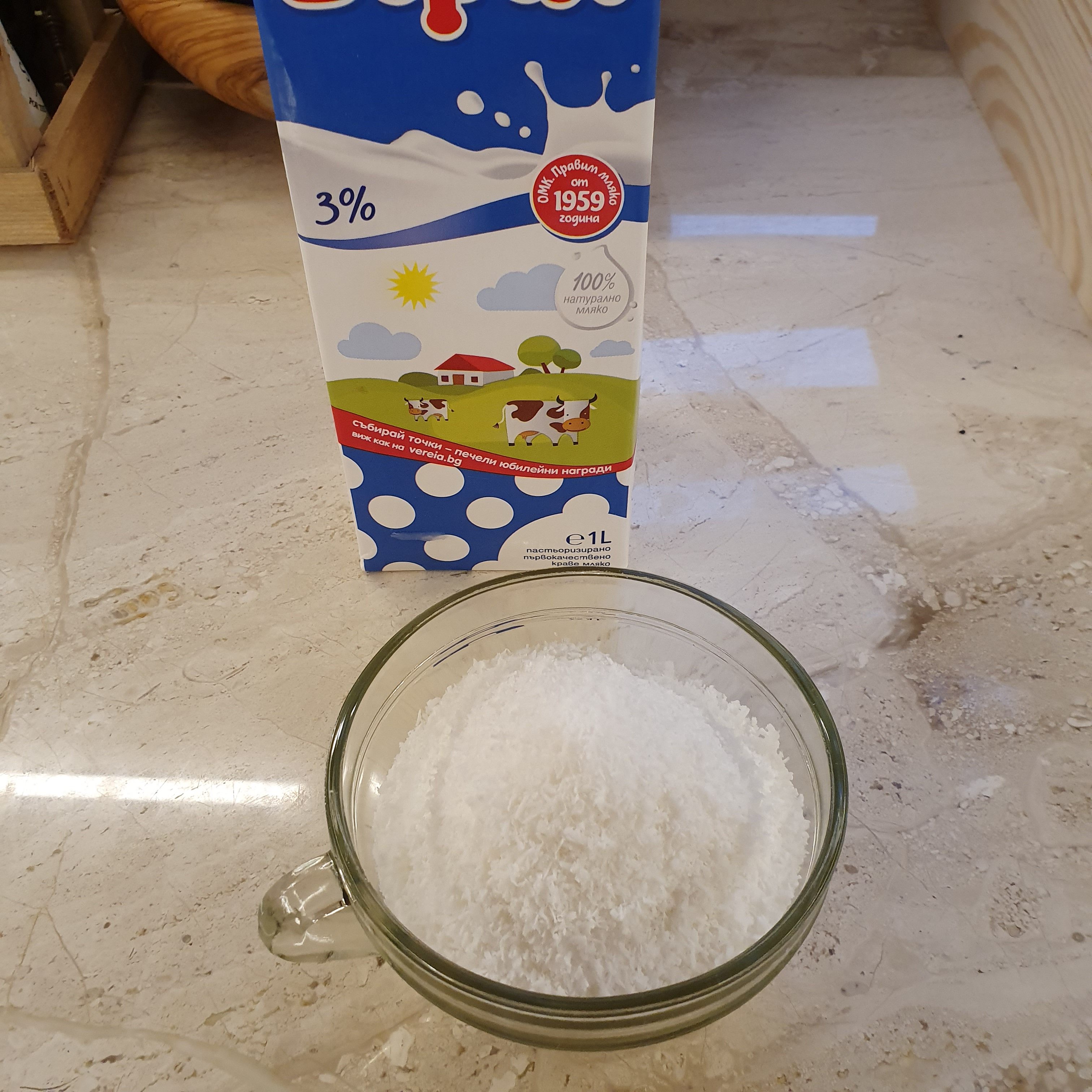 Време е да се заемем с крема . Изсипете млякото заедно с кокоса в тенджера и го затоплете до кипене на котлона.