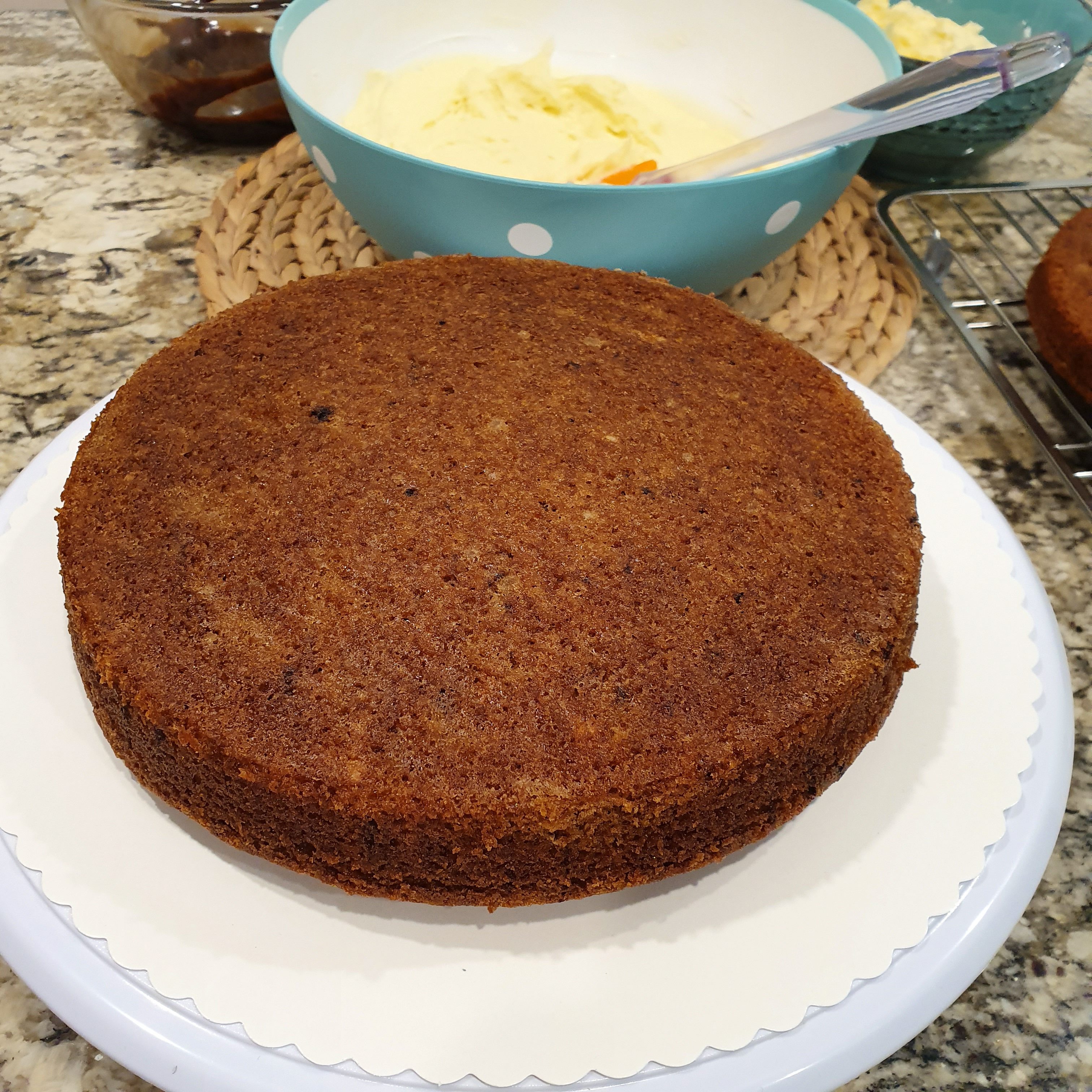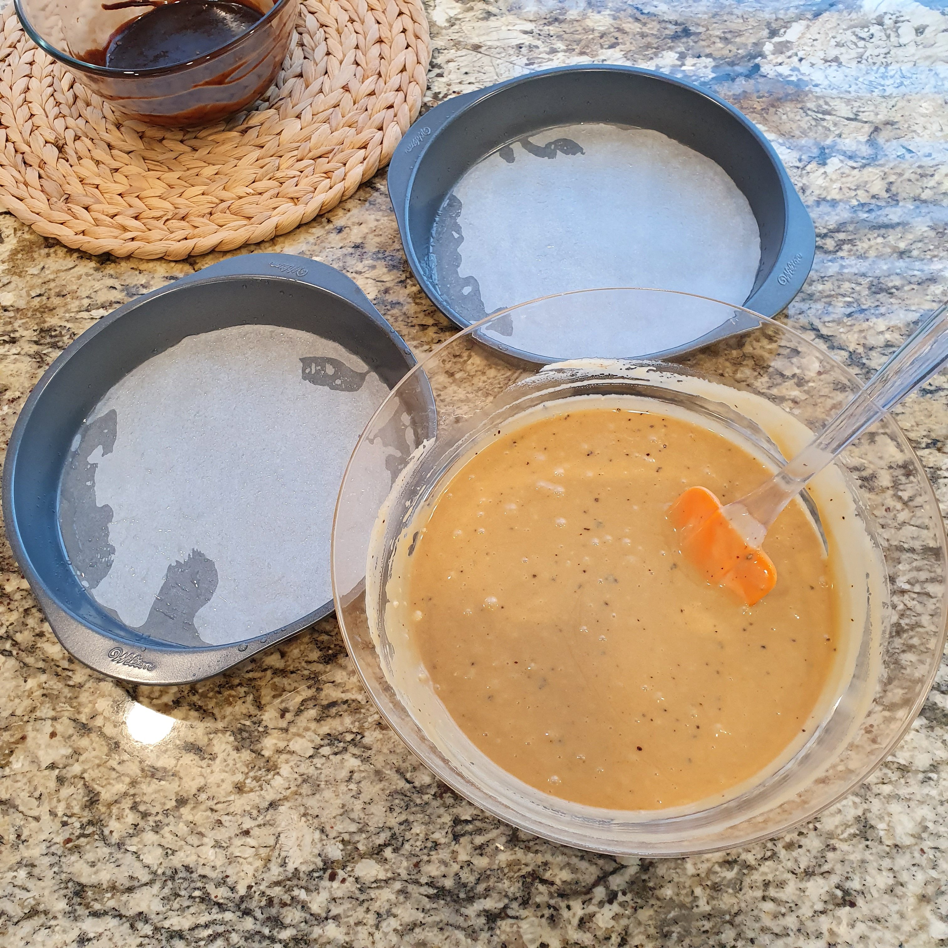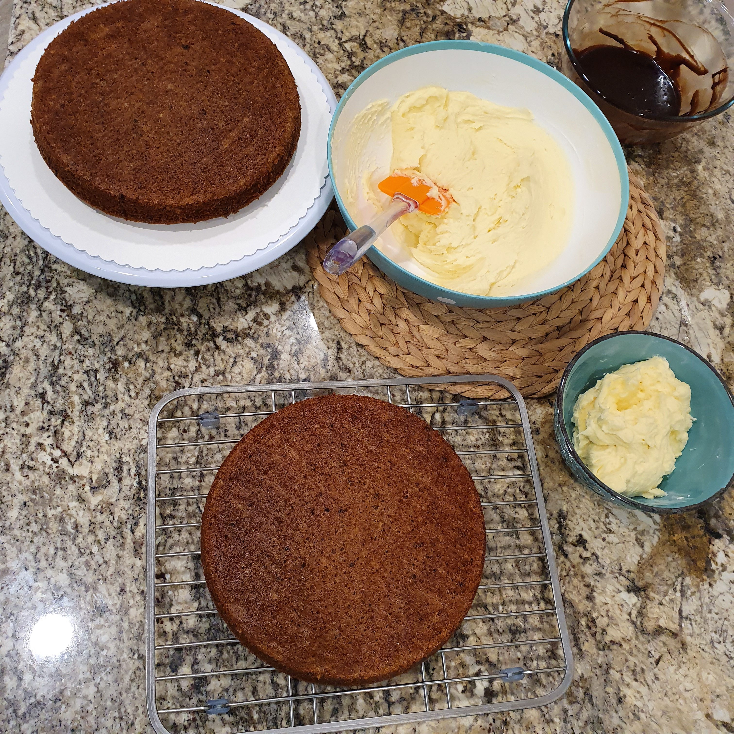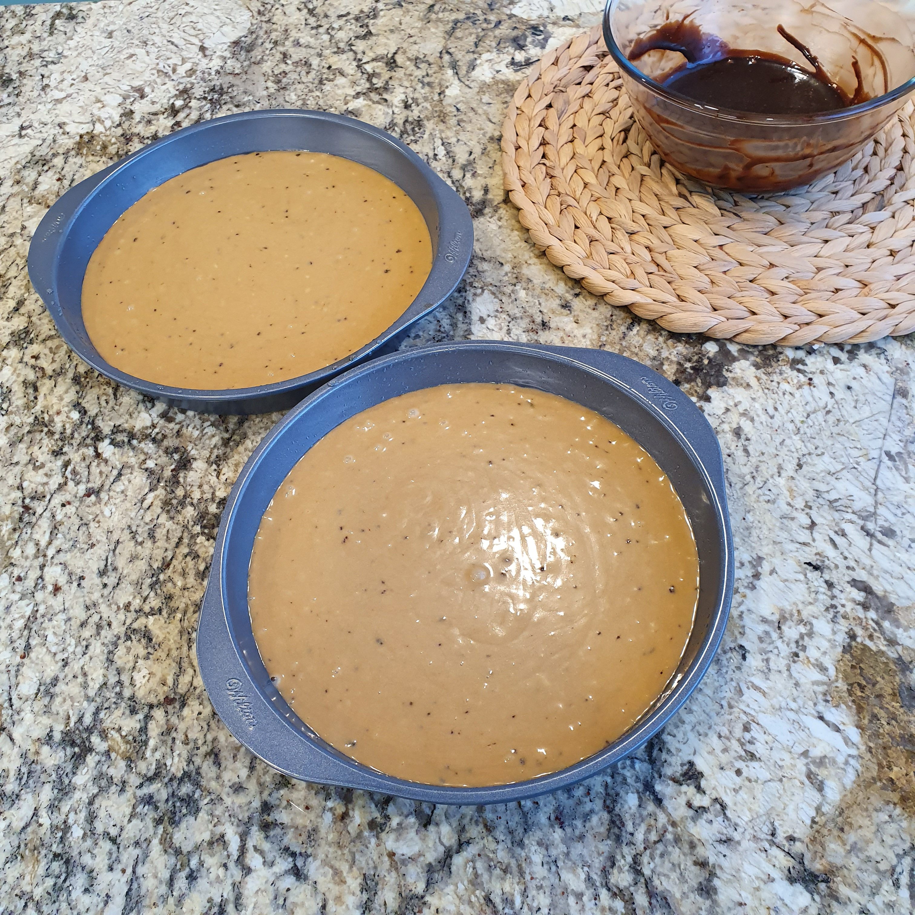 Подгответе две тави с диаметър 22 см като ги омазните и сложите хартия за печене на дъното. Включете фурната да загрее на 180 градуса. Разбийте до бяло захарта и яйцата. Добавете постепенно сметаната, олиото и студеното кафе. Смесете брашното със солта, бакплувера, кафето и содата за хляб. Прибавете сухата към мократа смес и накрая добавете ванилията. Разпределете тестото в двете тави по равно.