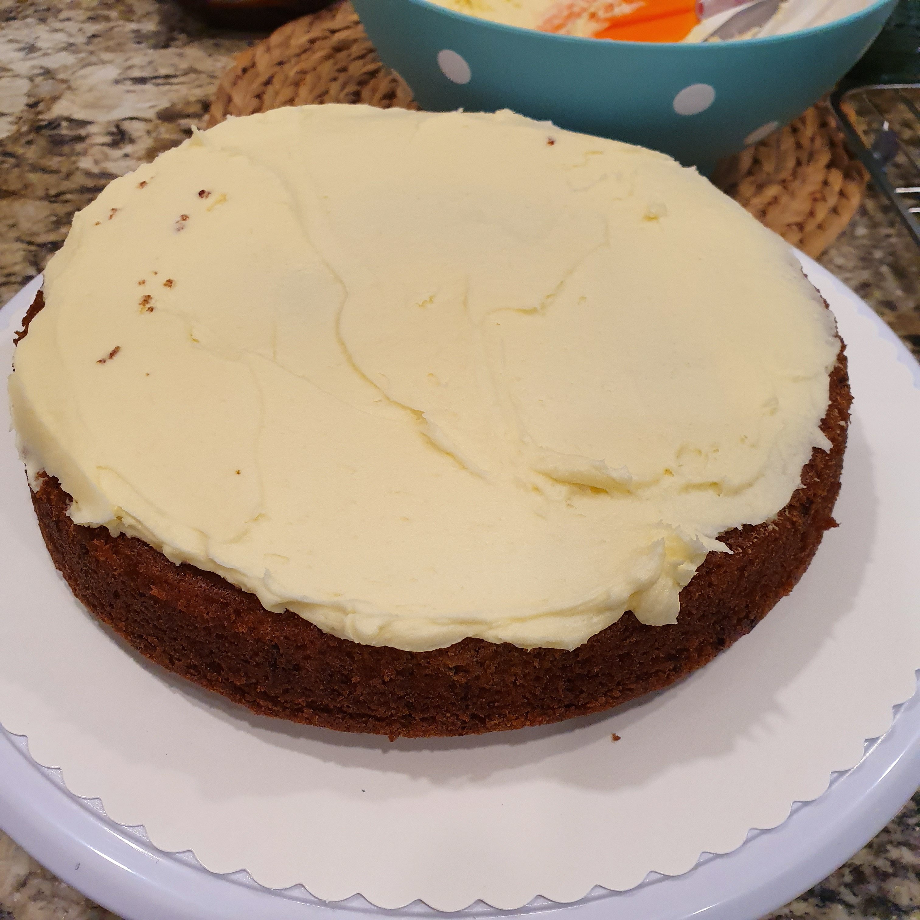 Отделете 1/3 от крема. Останалия разпределете между двата блата и измажете тортата отвсякъде. Оставете я за 10 минути в хладилника да се охлади.