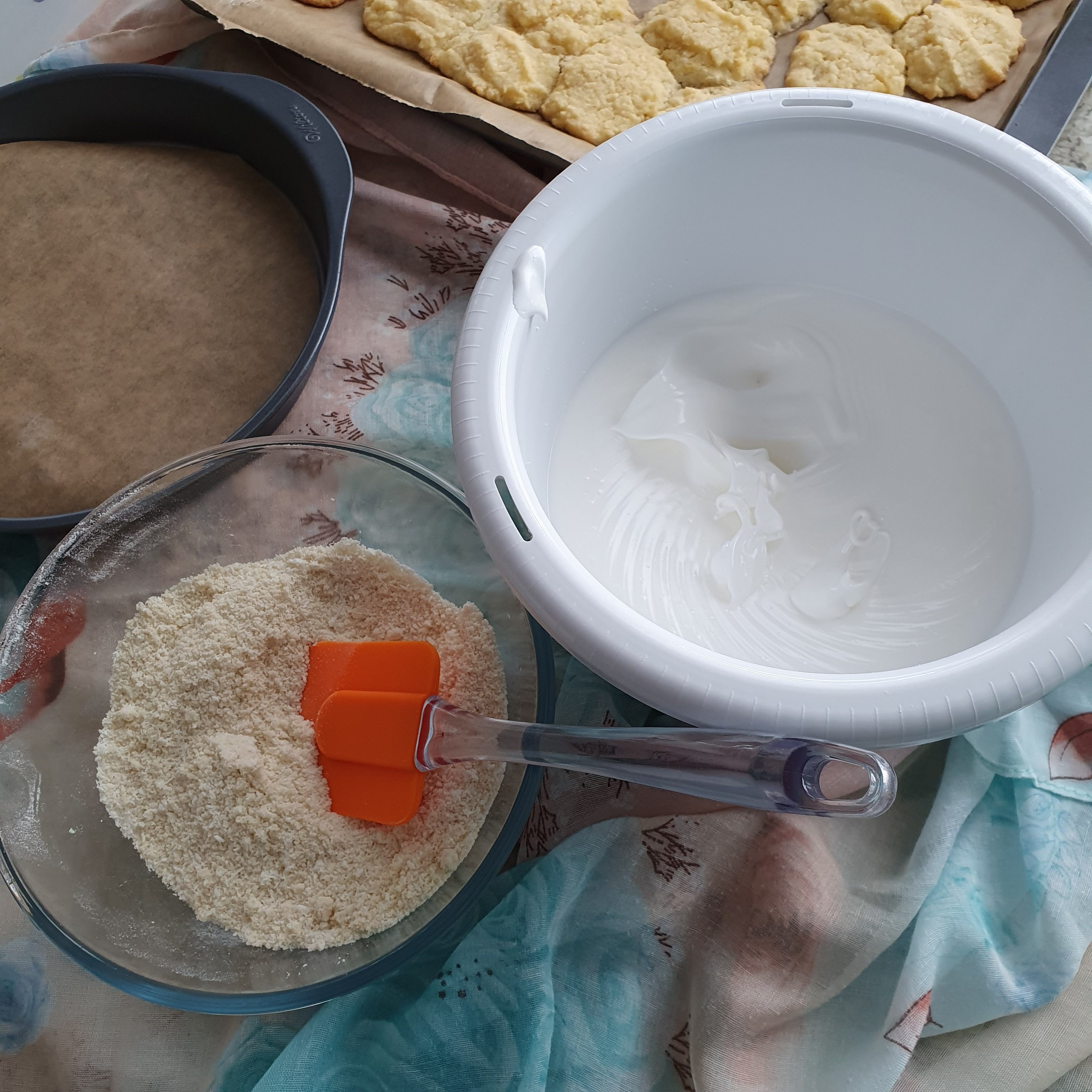 Започваме да композираме тортата. В основата поставяме белтъчния блат.