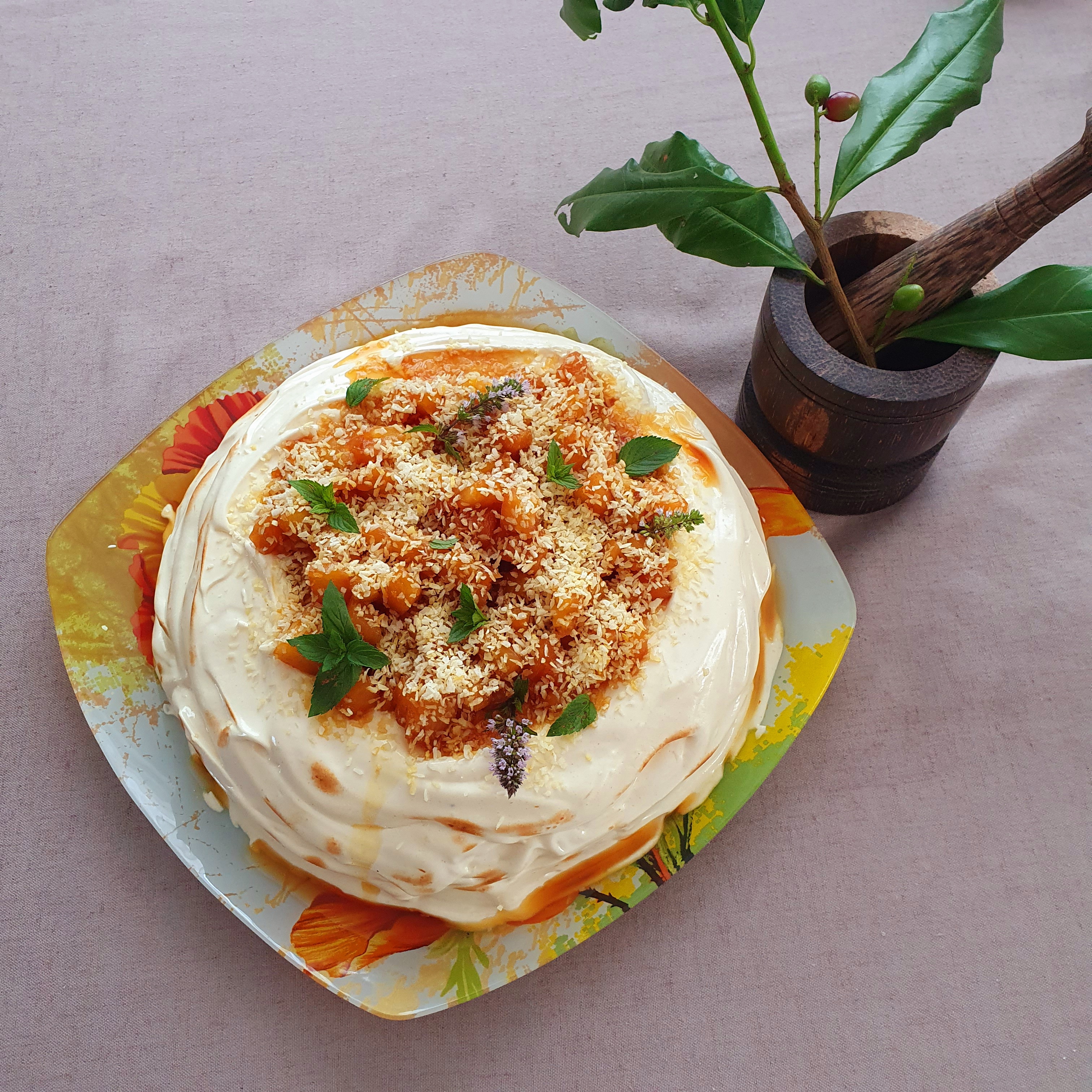 В купа смесете всички сухи съставки за основата на тортата. Разбийте яйцето с кокосовото мляко и олиото. След това смесете сухите и мокрите съставки. Намазнете тава за печене с диаметър 24 см и покрийте дъното с хартия за печене.