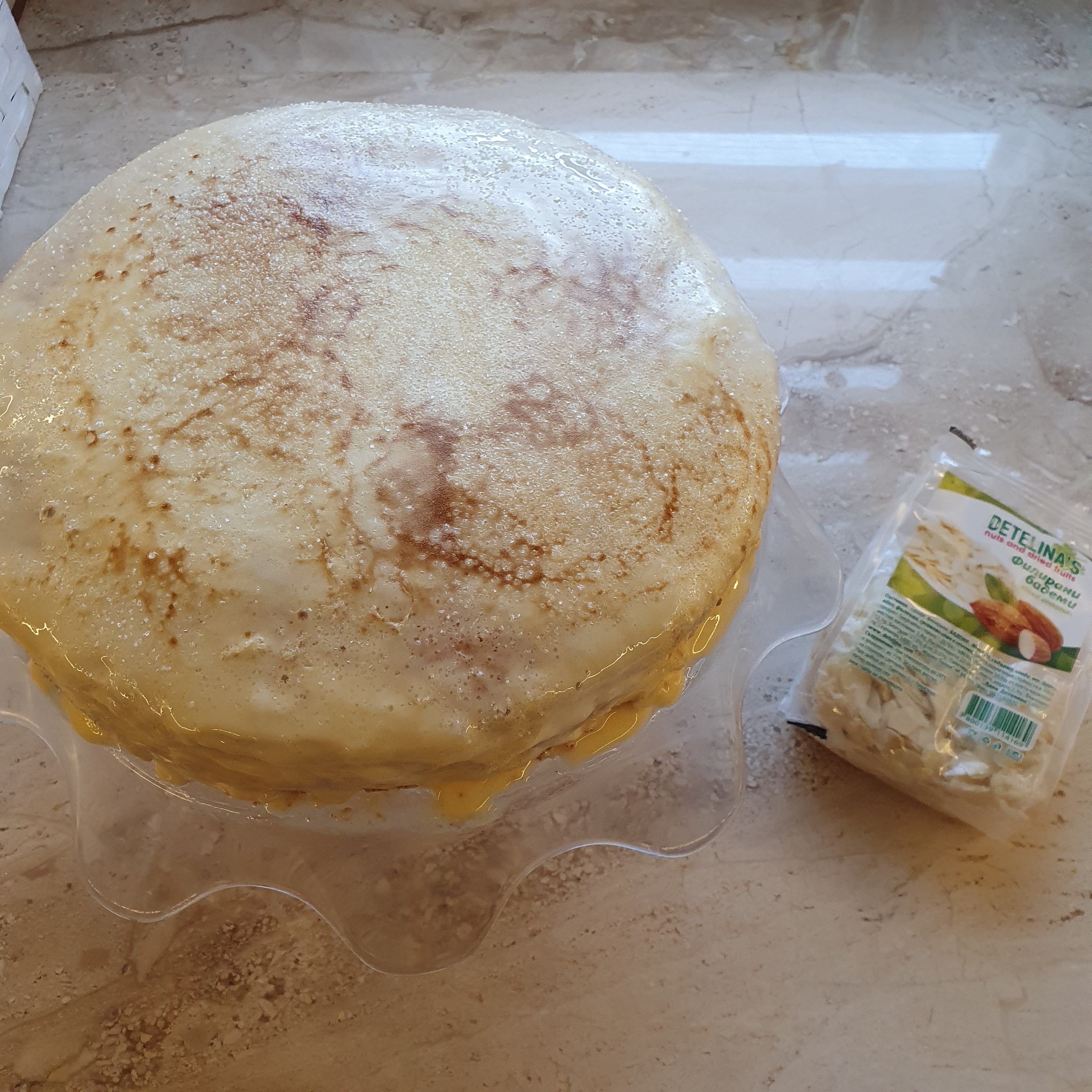 Сложете втория блат и повторете със сиропиране и част от сметаната. Последният трети блат сиропирайте по-малко. Измажете тортата със сметанов крем отвсякъде и оставете в хладилника.