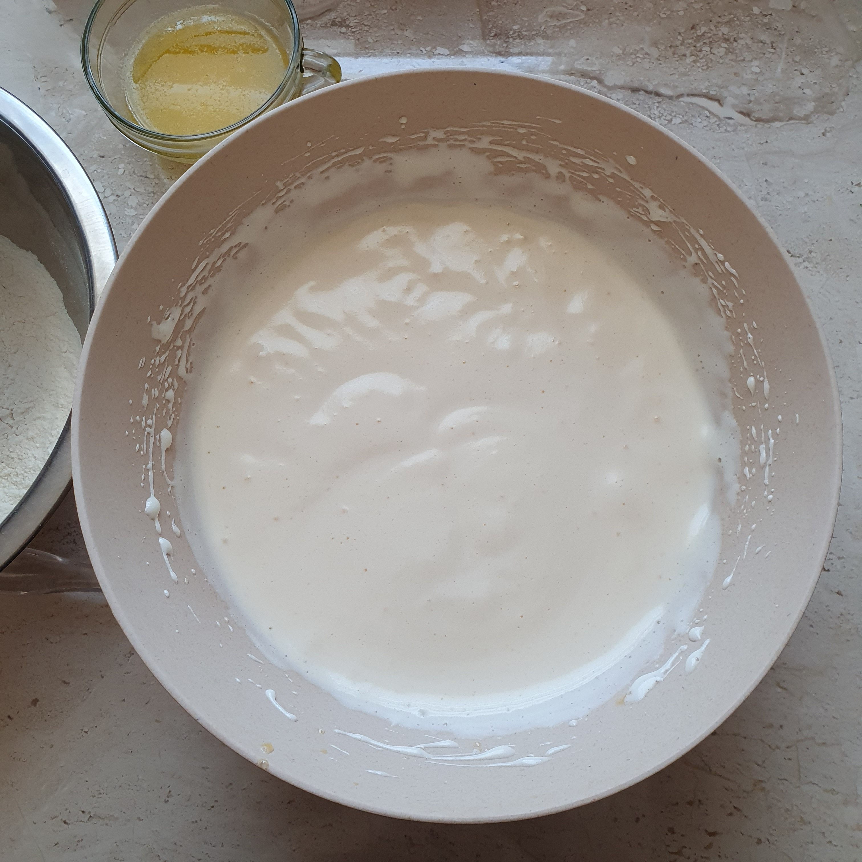 Разбийте яйцата със захарта и солта докато побелеят и удвоят обема си.