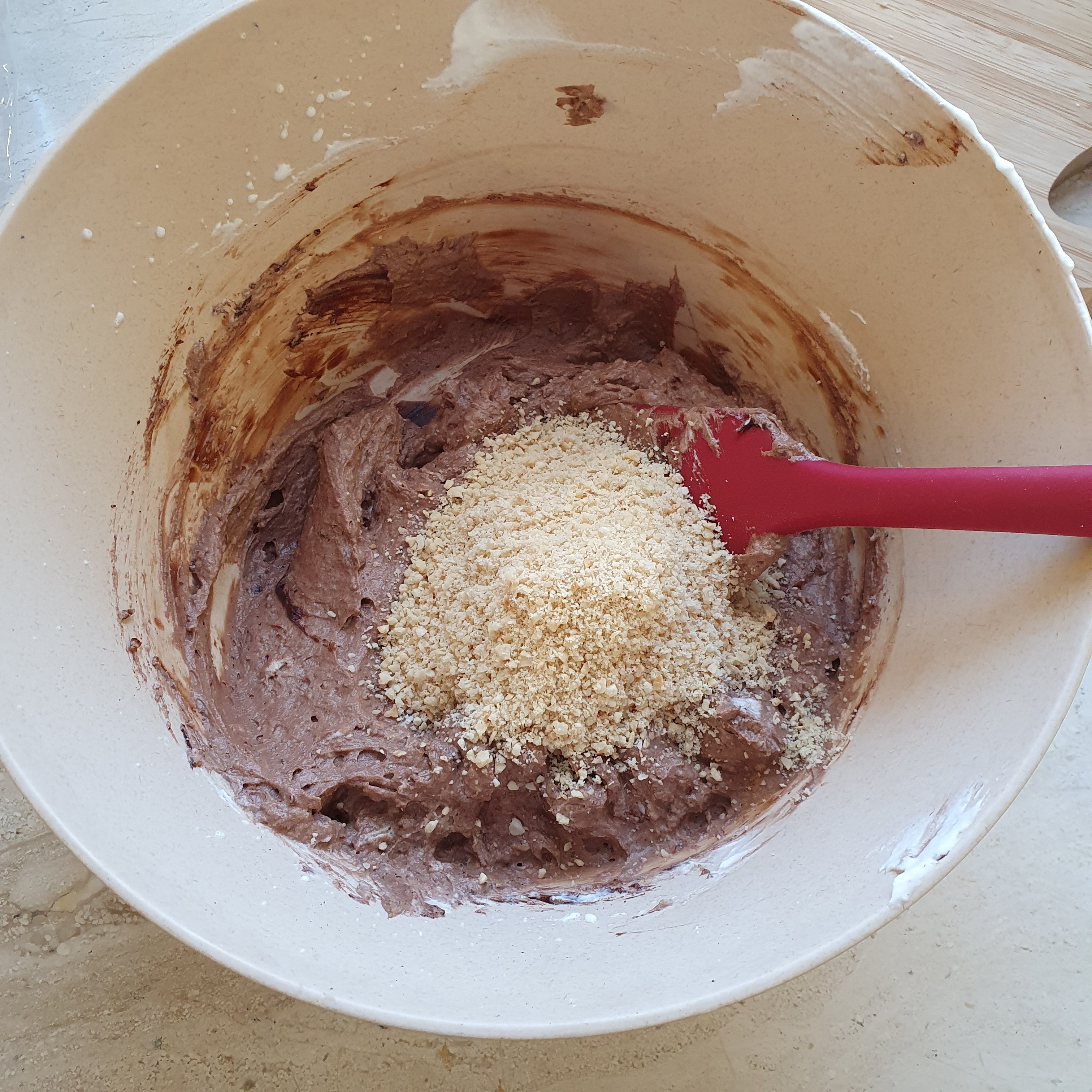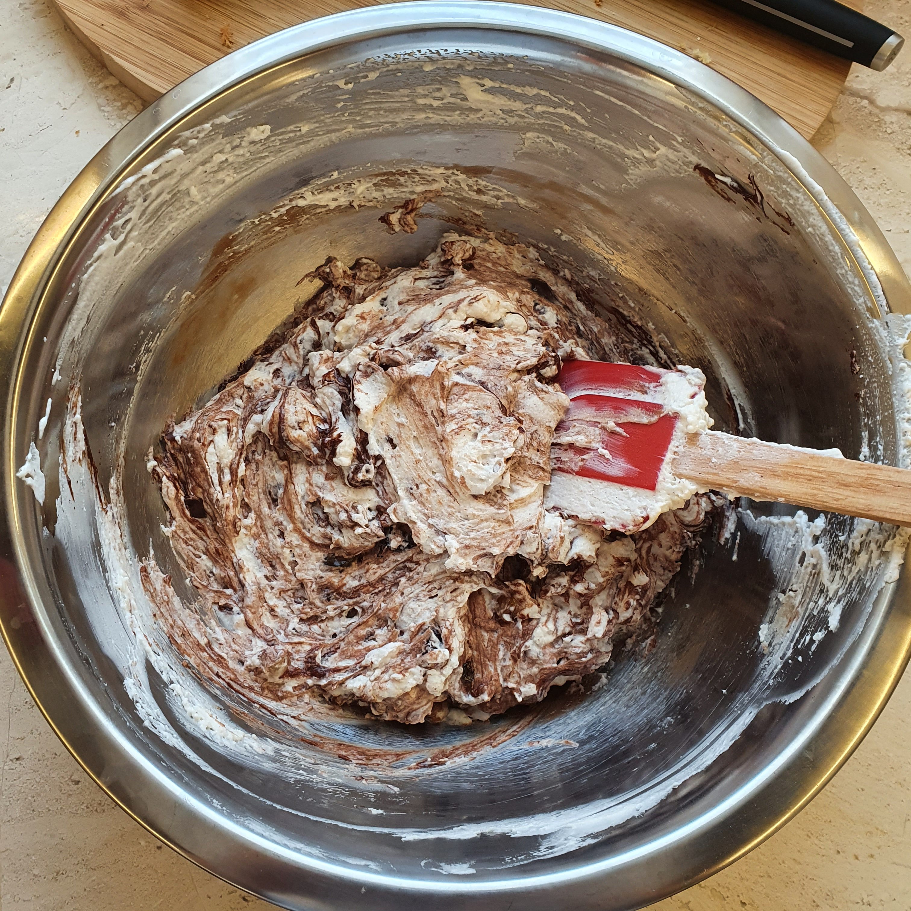 В рецептата ядките бяха в другата смес, но аз прецених, че тук ще им е по-добре. 😉 В другата смес добавяме 60 грама шоколад, портокаловите корички и черешите.