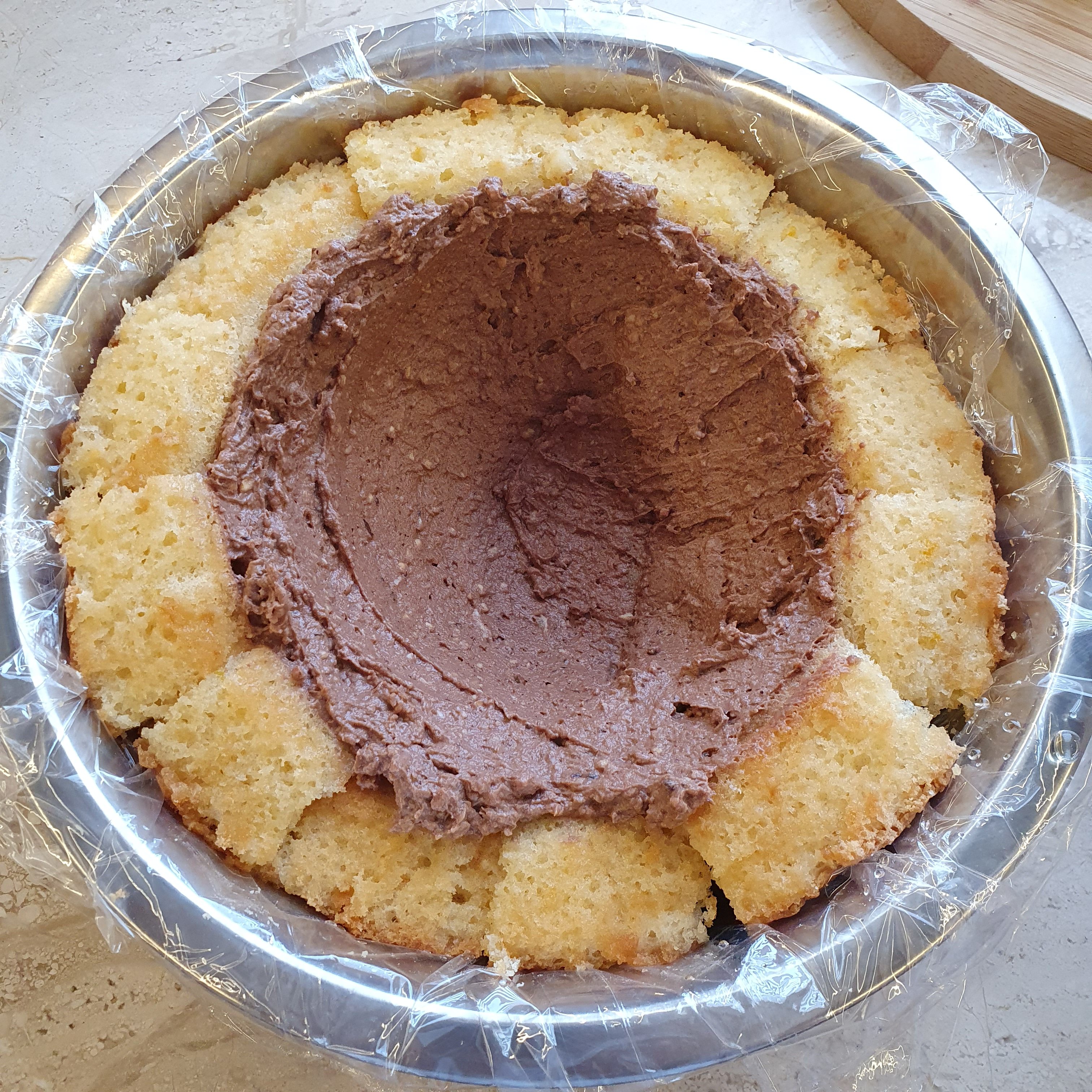 С четка и сироп навлажняваме блата. Изсипваме шоколадовия крем и оформяме кладенче. В него слагаме останалия крем.