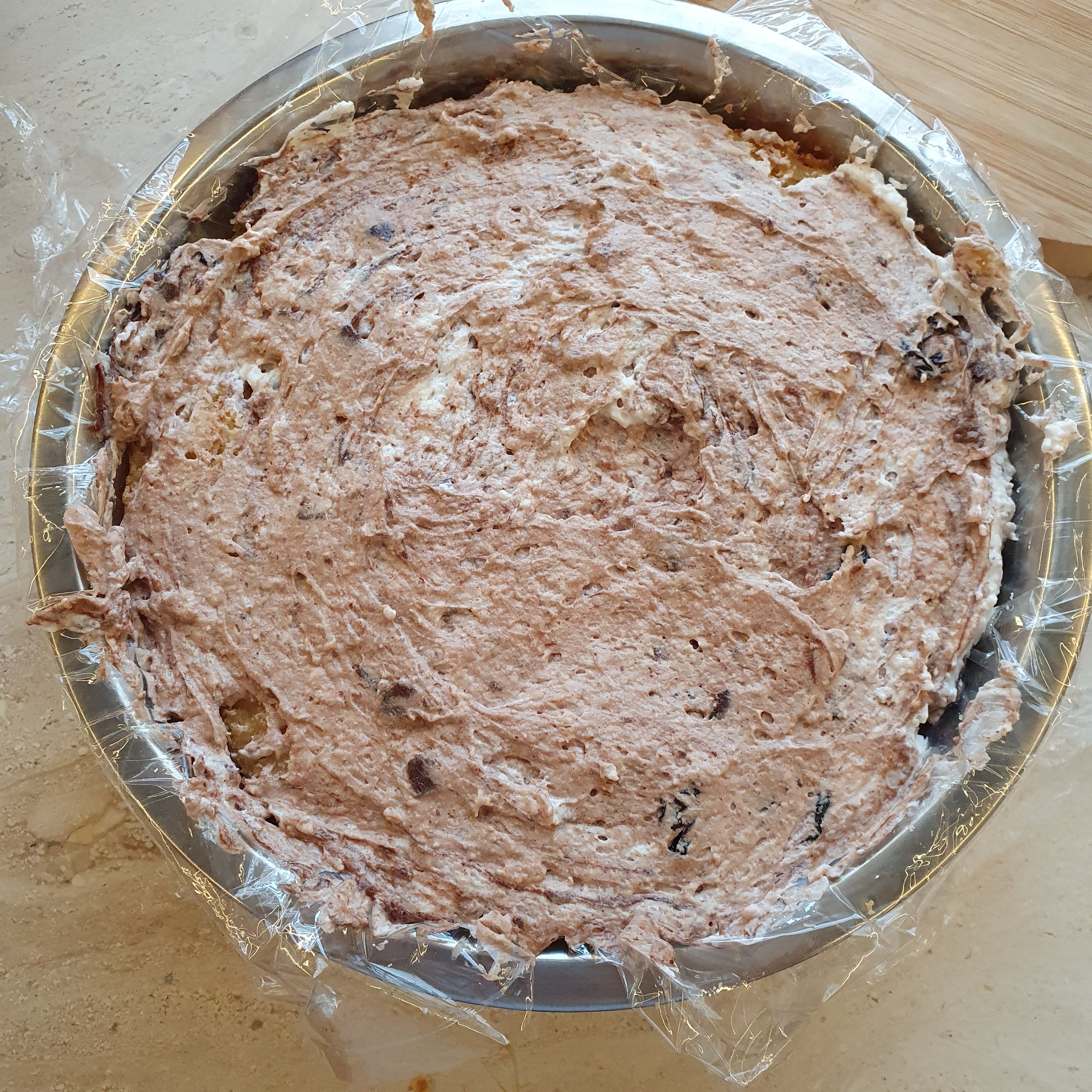Похлупваме с малкия блат и леко го навлажняваме със сироп. Покриваме го с фолиото и поставяме чиния, подложка отгоре и след това натискаме с някаква тежест, за да се оформи тортата. Оставяме в хладилника за няколко часа, а най-добре за цяла нощ.