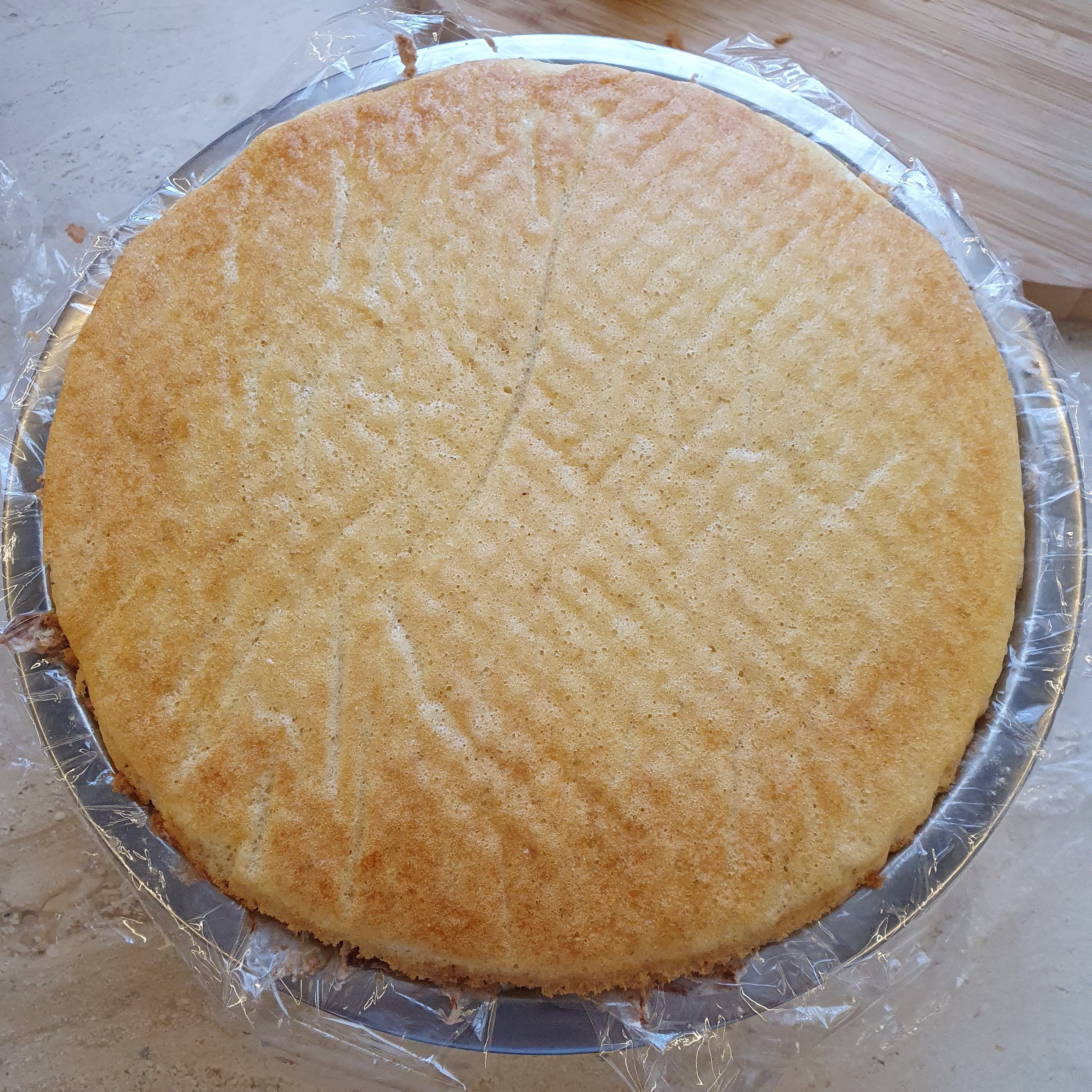 Махаме тежестта, отгръщаме фолиото и захлупваме с тортена чиния тортата. След това внимателно обръщаме, сваляме купата и фолиото и се молим тортата да не разпадне. 😀