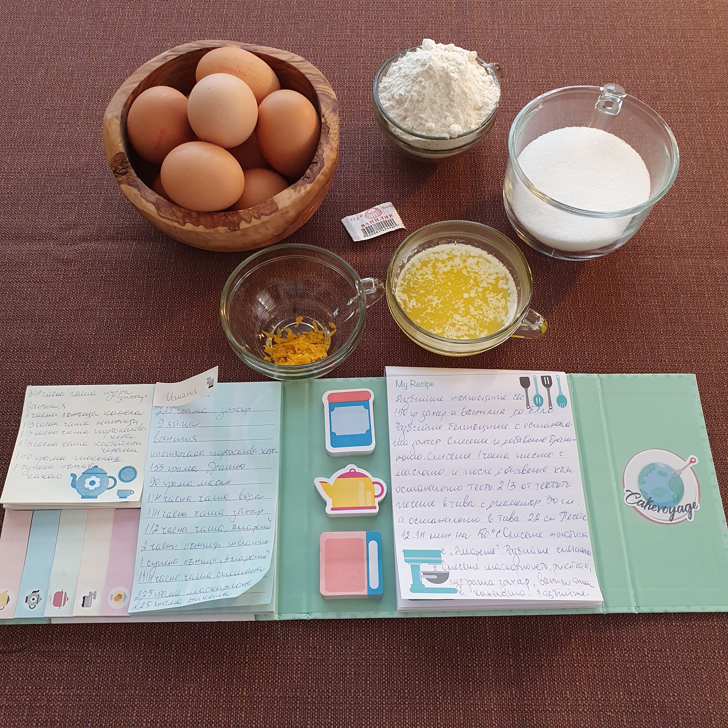 Разделете яйцата на белтъци и жълтъци. Белтъците разбийте със 75 грама захар на твърди връхчета. Разбийте отделно жълтъците с останалата захар, ванилията и настърганата портокалова кора. Изсипете сместа с жълтъците в белтъчната смес и разбъркайте внимателно с шпатула до хомогенност. Леко добавете пресятото брашно и внимателно бъркайте докато стане еднородна смес. Отделете една чаша от сместа и я смесете с маслото. След това я прибавете към останалата смес.