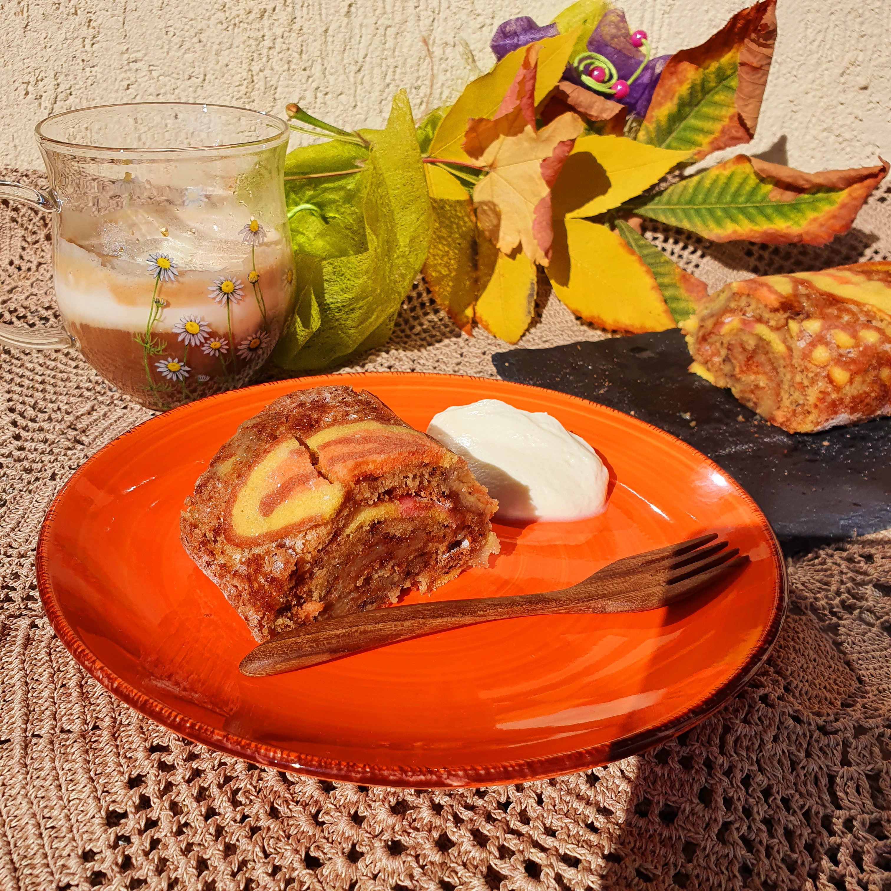Рулото торта се получи чудесно на вкус. Хем е нежно и пухкаво, хем има и някаква хрупкавост на целувка. Ако имах повече сладко от банани щях да сложа, но и това количество беше достатъчно, за да е сочно рулото. Може да направите и крем за пълнеж с крема сирене, сметана, маскарпоне… Всичките те ще пасват на блата като вкус. Ако пък добавите коледни подправки – канела, джинджифил и пюре от тиква вместо от банани и ето ви коледен сладкиш. За първи път правя руло. Има още какво да се желае за перфектен резултат, но със сигурност ще опитам отново – и да рисувам по-добре и да експериментирам с вкусовете. 🙂 Не е кой знае колко трудно и с повече опит би могло да се постигне много повече като презентация. Направих една грешка – нарисувах твърде големи листа и то в края на блата. При навиването леко се счупиха и това влошава вида, но следващият път ще знам.