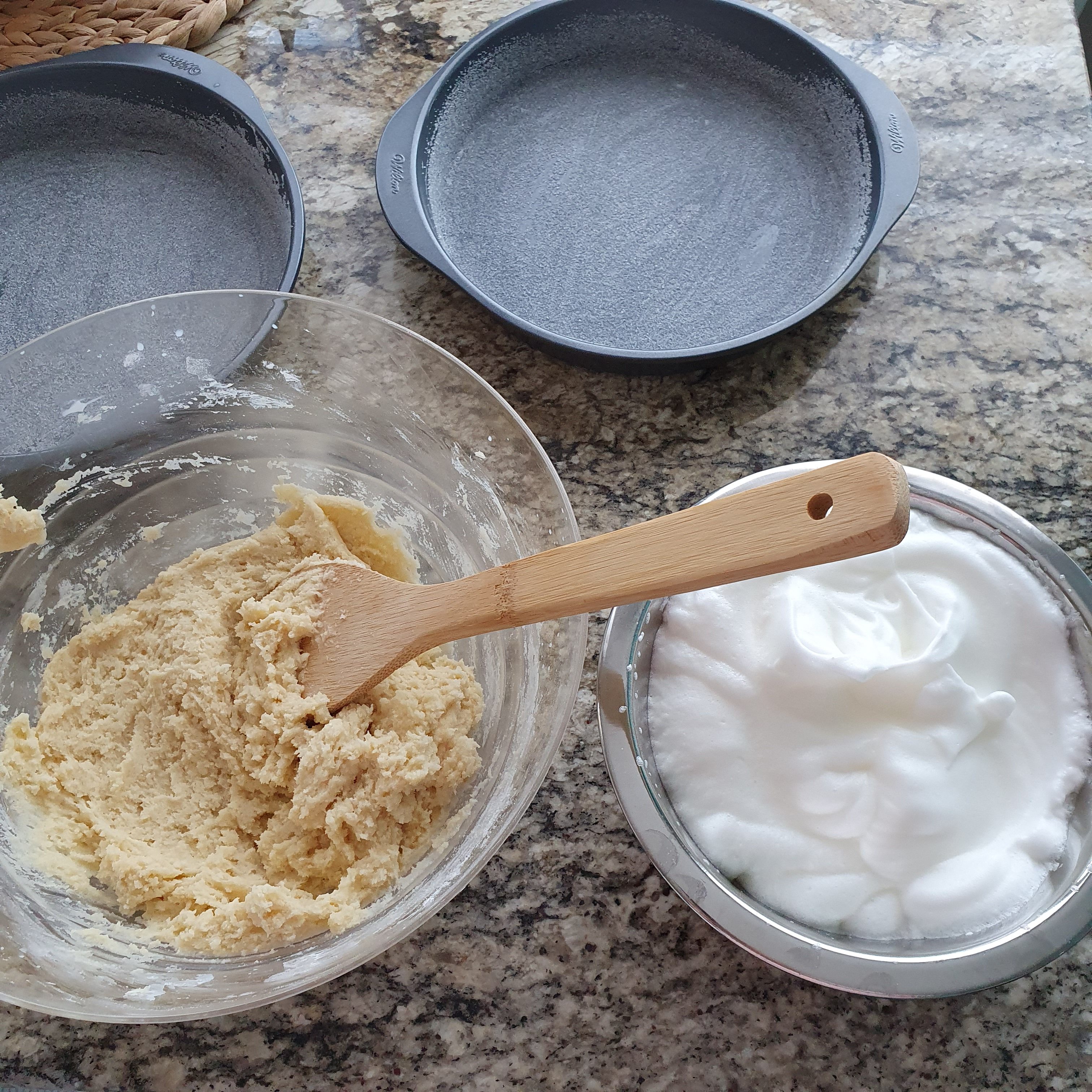 Подгответе две тави с диаметър 20 см като ги намазните с масло и поръсите със захар. Разделете сместа поравно и печете в предварително загрята на 180 градуса фурна за 20-30 минути. Извадете двата блата да се охладят и след това ги извадете от тавите.