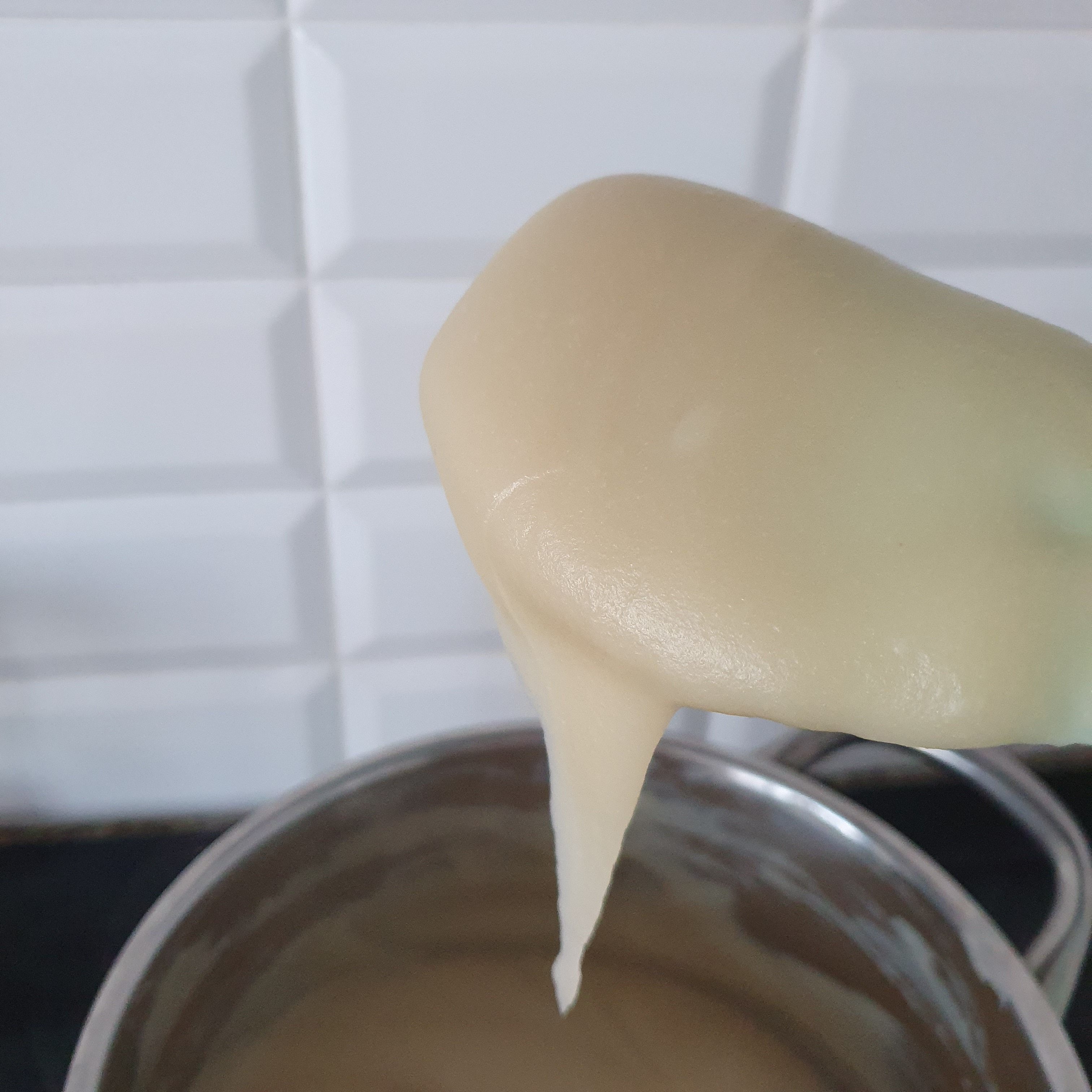 Добавих захарта и върнах на котлона да се свари и сгъсти. Тук е тънкия момент в приготвянето. Трябва да се вари на средна до ниска температура като се бърка непрекъснато. Отнема около 45 минути. Накрая сместа трябва да е така гъста, че да пада от лъжицата, но и някакво количество да се задържа по нея. Не знам дали обясних ясно, но трябва да изглежда приблизително така :