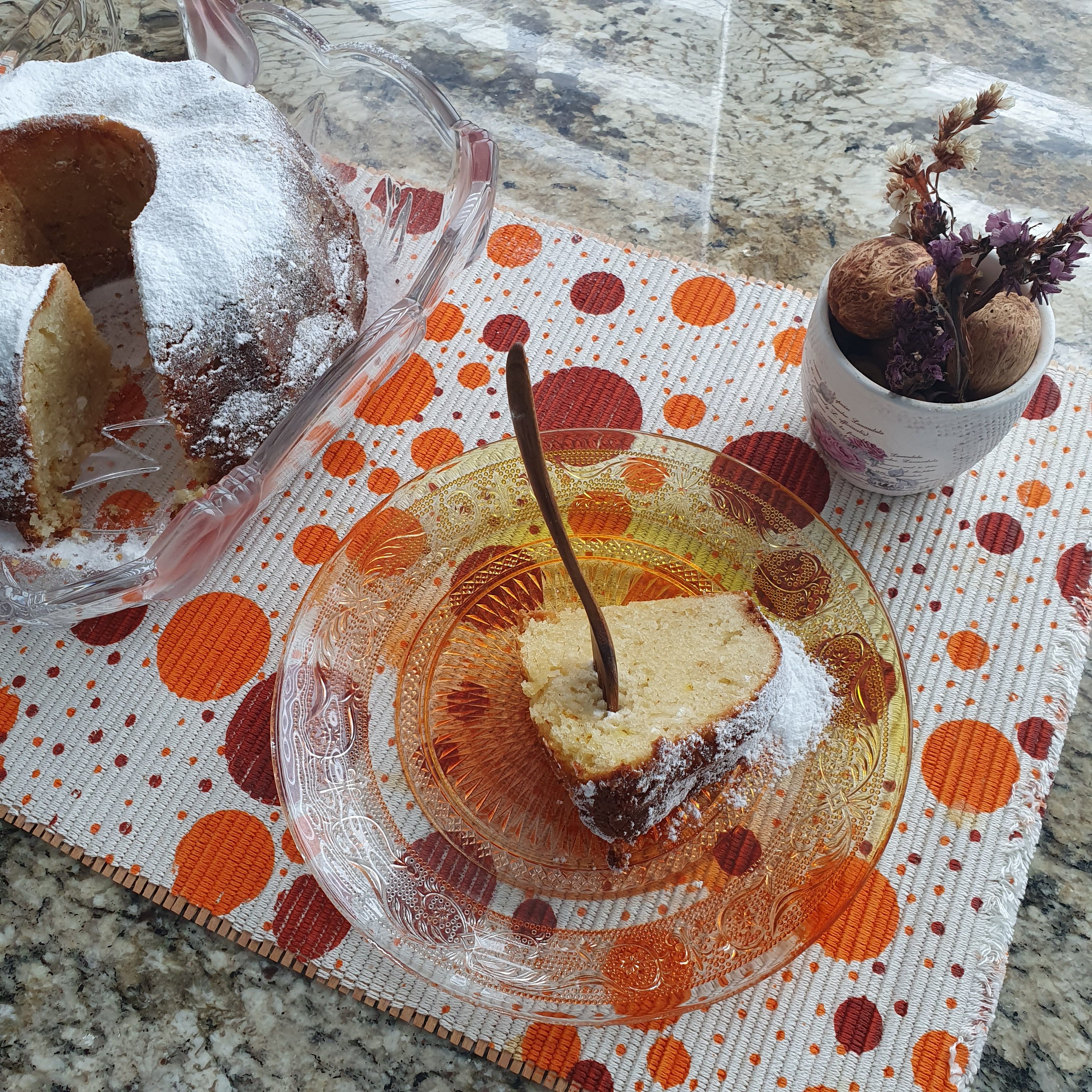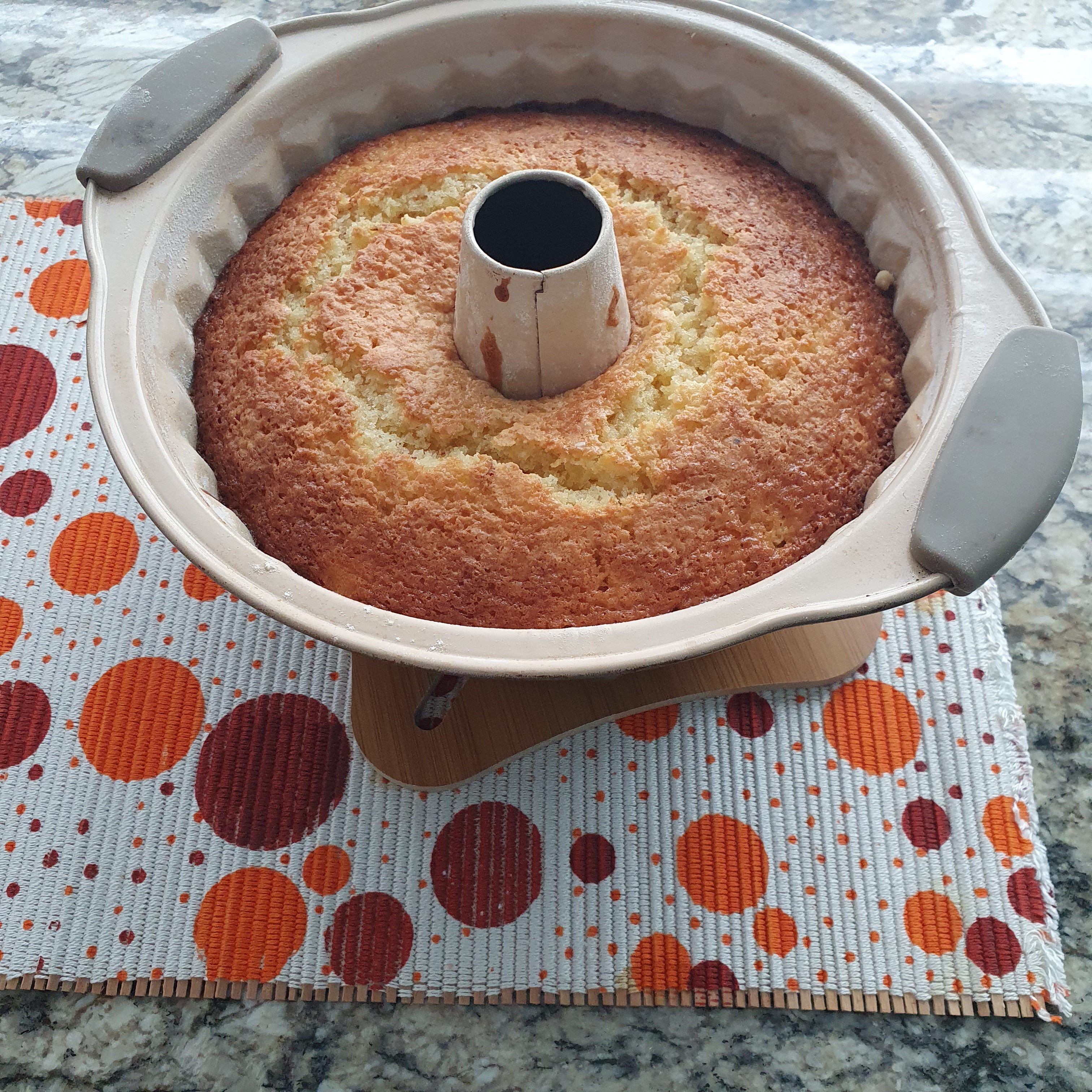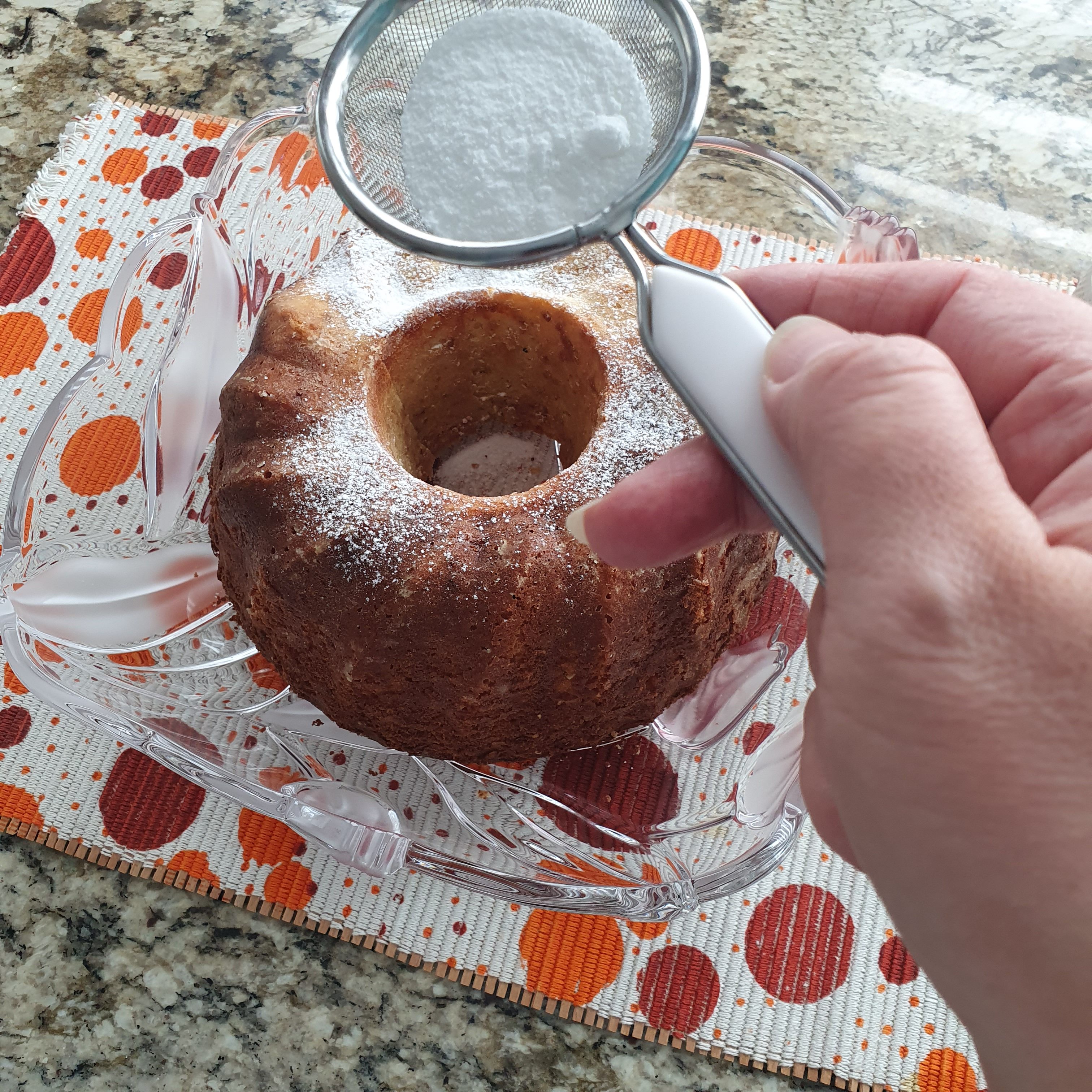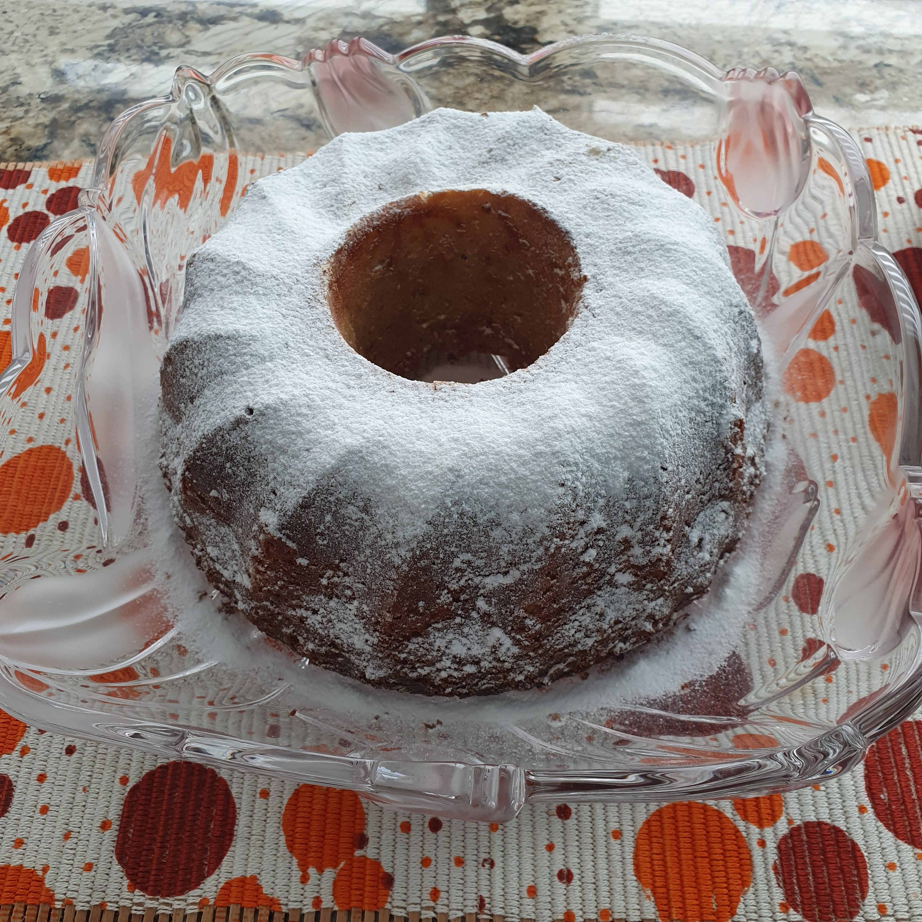 Охладете, а след това внимателно обърнете формата върху чиния за сервиране. Стискайте палци да стане лесно. Аз всеки път го правя. 😀 Поръсете с пудра захар.