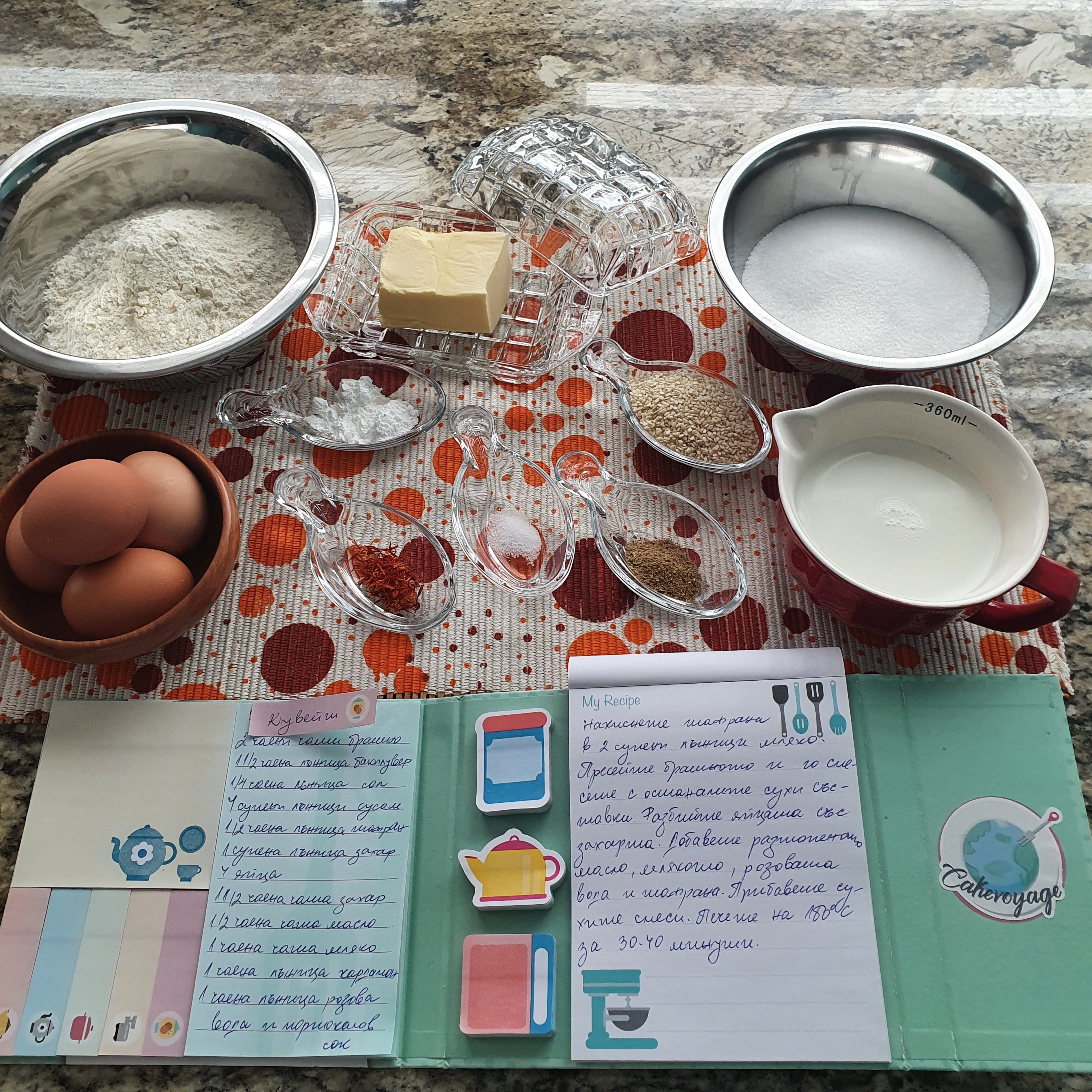 Знаете ли, ако не бяха няколкото специфични подправки това е най-обикновен кекс. 🙂 Но ароматът на шафран, кардамон и розова вода ме накараха да се размечтая за топлината и уханието на арабските държави. 🙂 Още повече, че днес е един намръщен, зимен и твърде снежен мартенски ден. Не съм била в Кувейт, но бих отишла. Арабските страни са страхотни за кулинарен туризъм. Храната им е позната у нас поради исторически причини, но и не съвсем. Всяка страна си има своята специфика и вкус. И освен това много искам да съм на някое топло място сега. Омръзна ми вече от тази изолация, зима и липса на перспектива да пътувам както го правех преди. Знам, че сега не е времето, но не пречи да си кажа, че ми липсва. Дано скоро нещата се променят. Дано скоро станем нормални. Дано…