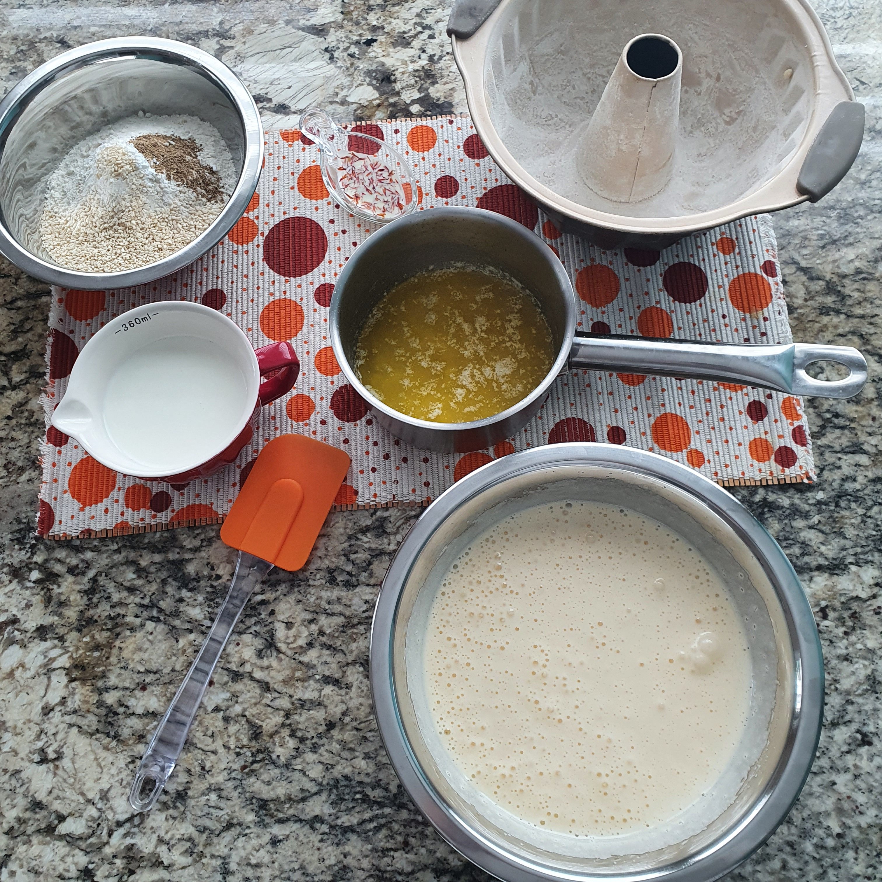Накиснете шафрана в две супени лъжици прясно мляко. Запечете леко в тиган сусама. Разтопете маслото и леко охладете. Пресейте брашното заедно с всички сухи съставки. Разбийте до увеличаване на обема и побеляване яйцата със захарта. Добавете прясното мляко, шафрана и разтопеното и охладено масло. Накрая смесете със сухите съставки до хомогенност.