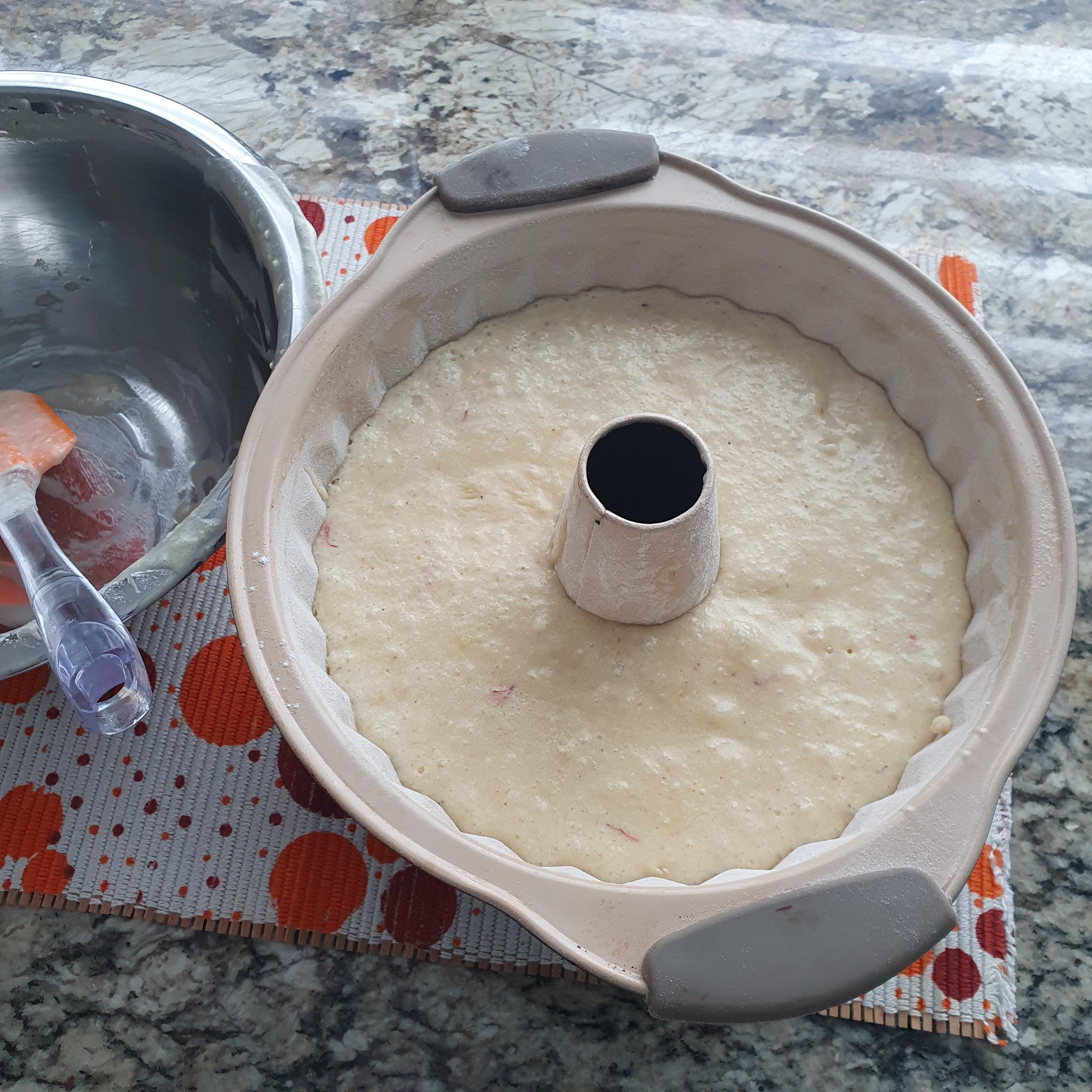 Намазнете и посипете с брашно форма за кекс и изсипете сместа.