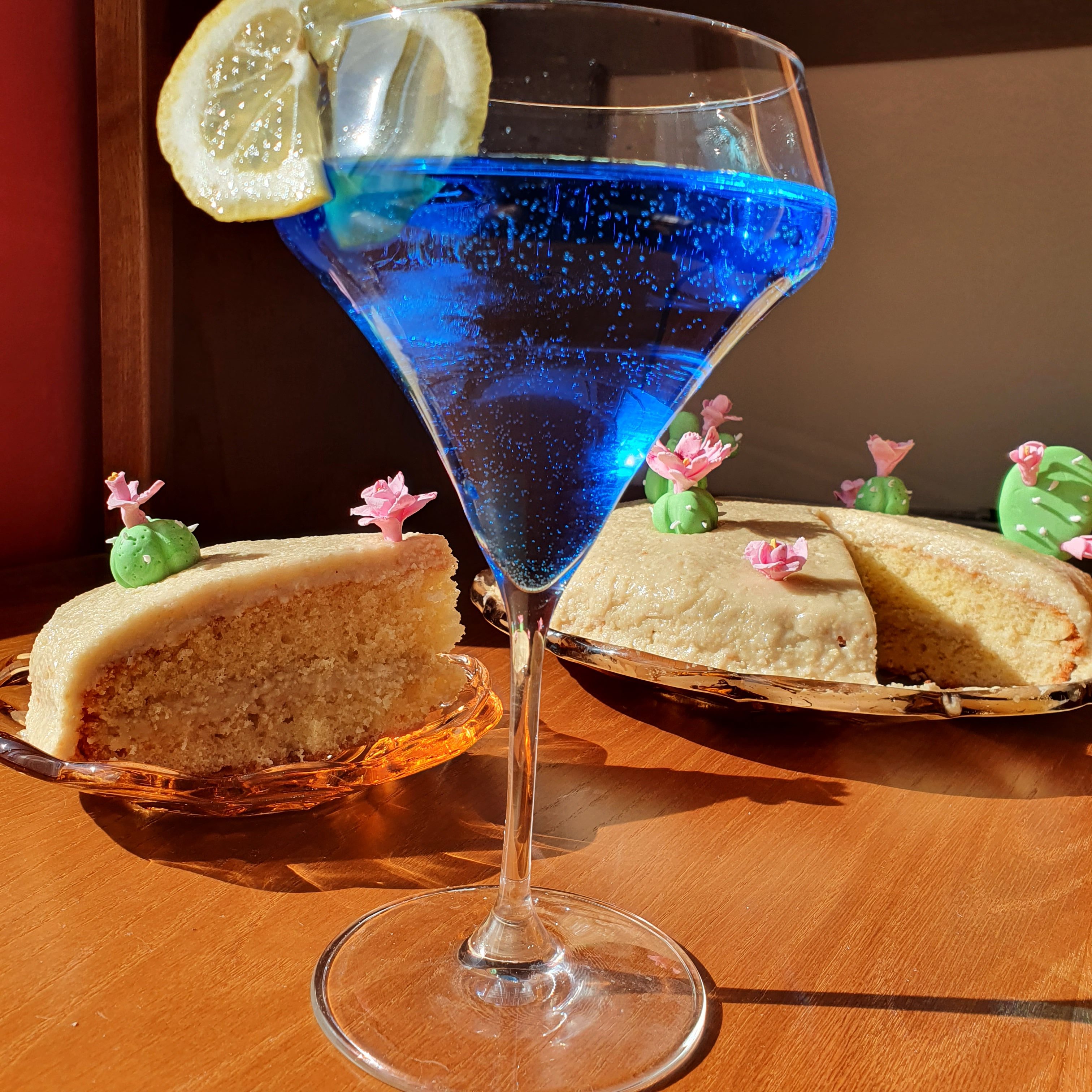 Не може да имам наличен ликьор “Кюрасао” в шкафа с питиета и да не си направя един коктейл в прекрасния слънчев ден. Вярно, не съм на Карибите, но пък настроението е добро и имам карибска торта. 😉 Коктейлът е “Оазис” и се прави като в шейкър се смесят 50 мл синьо “Кюрасао” , 50 мл джин, лед и газирана вода. Всички съставки се размесват енергично и се изсипват в чаша. Гарнира се с резен лимон. Може да сложите черешка, чадърче…каквото сметнете за подходящо за повече настроение.
