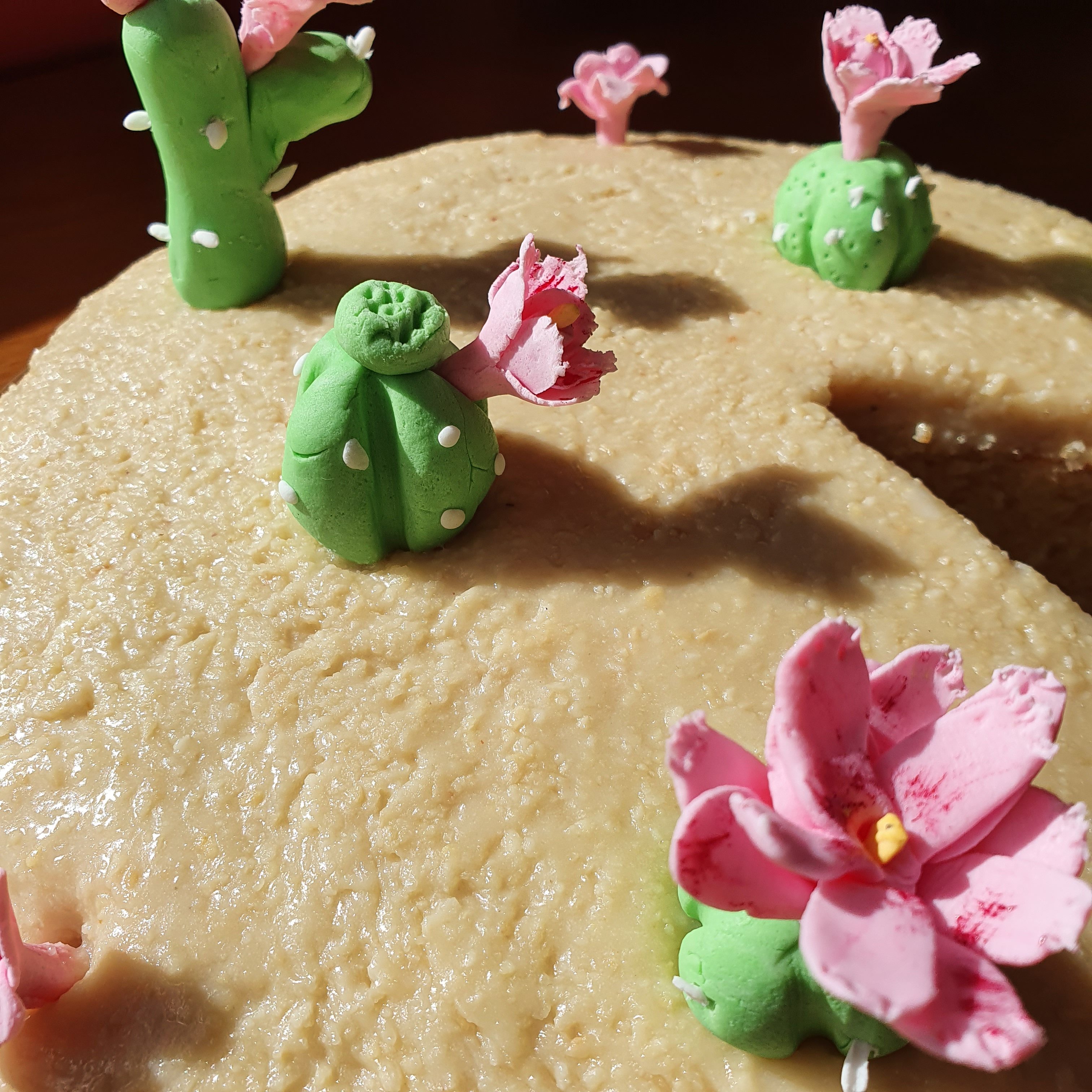 Върху тортата традиционно се слага украса от захаросани череши и ядки кашу. Аз, обаче, си купих гъмпейст и нямах никакво търпение да го ползвам по-нататък. Реших да направя цветя за тортата, които да са типични за Кюрасао. Оказа се, че там цветята са предимно върху кактуси и затова на тортата ми кацнаха няколко кактуса. 😀