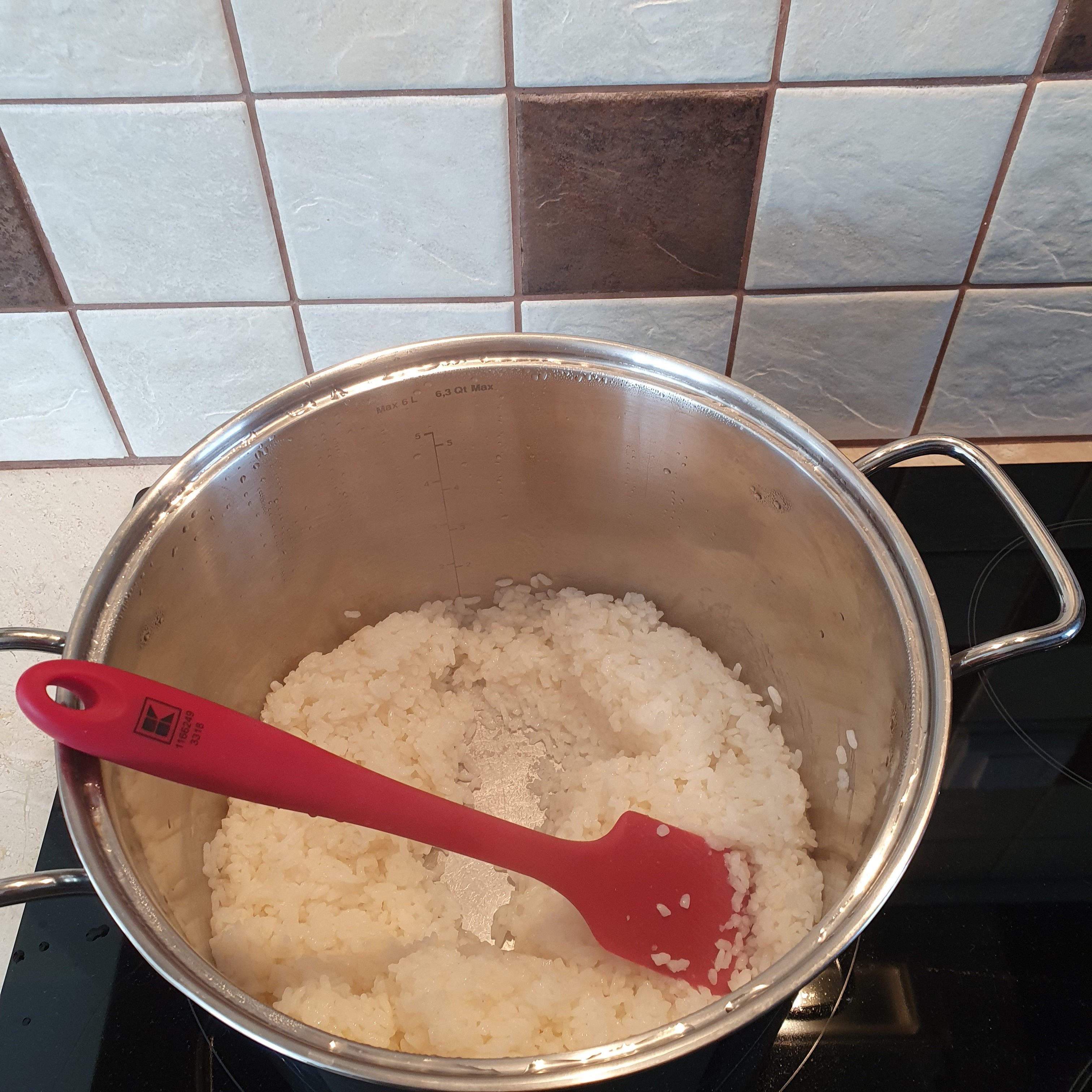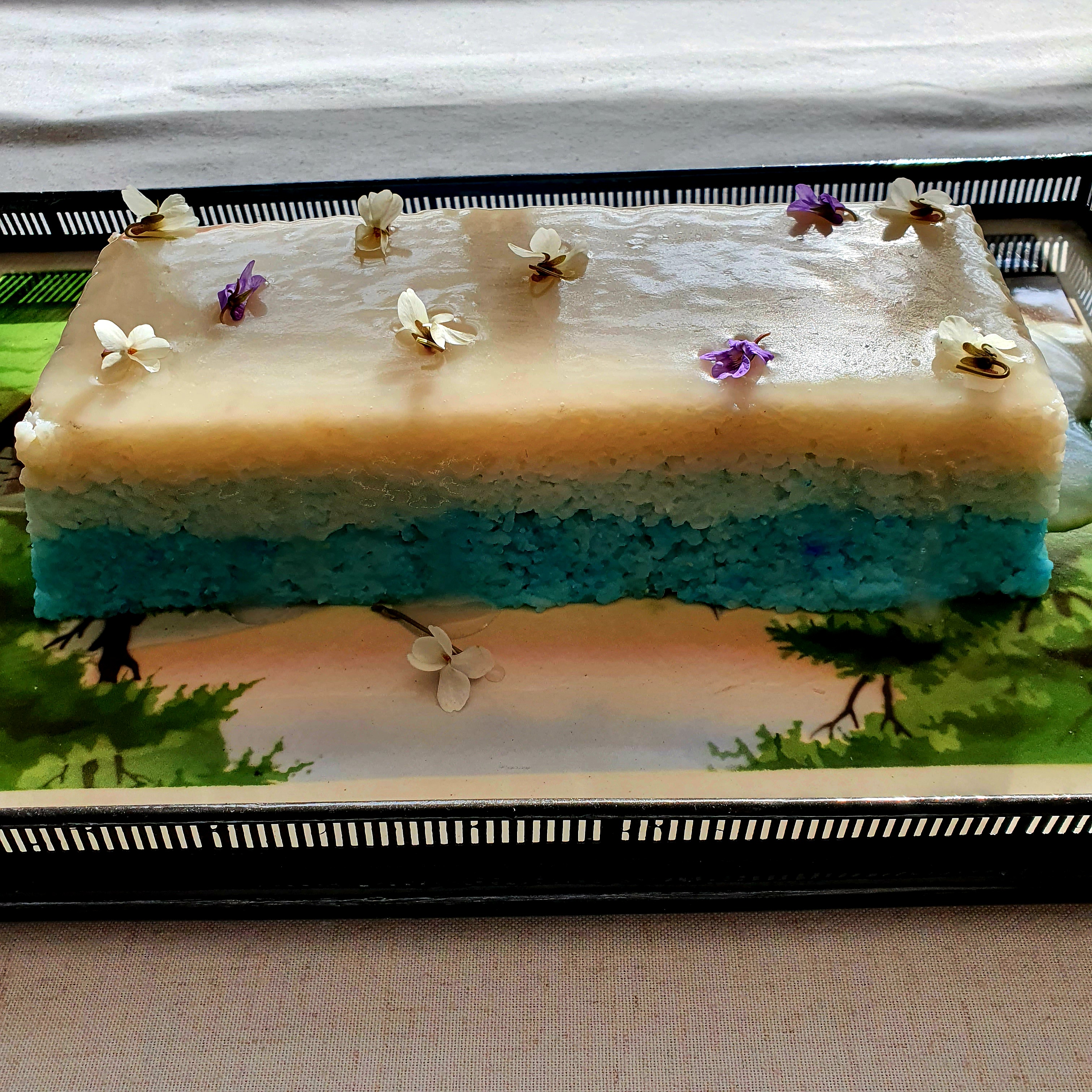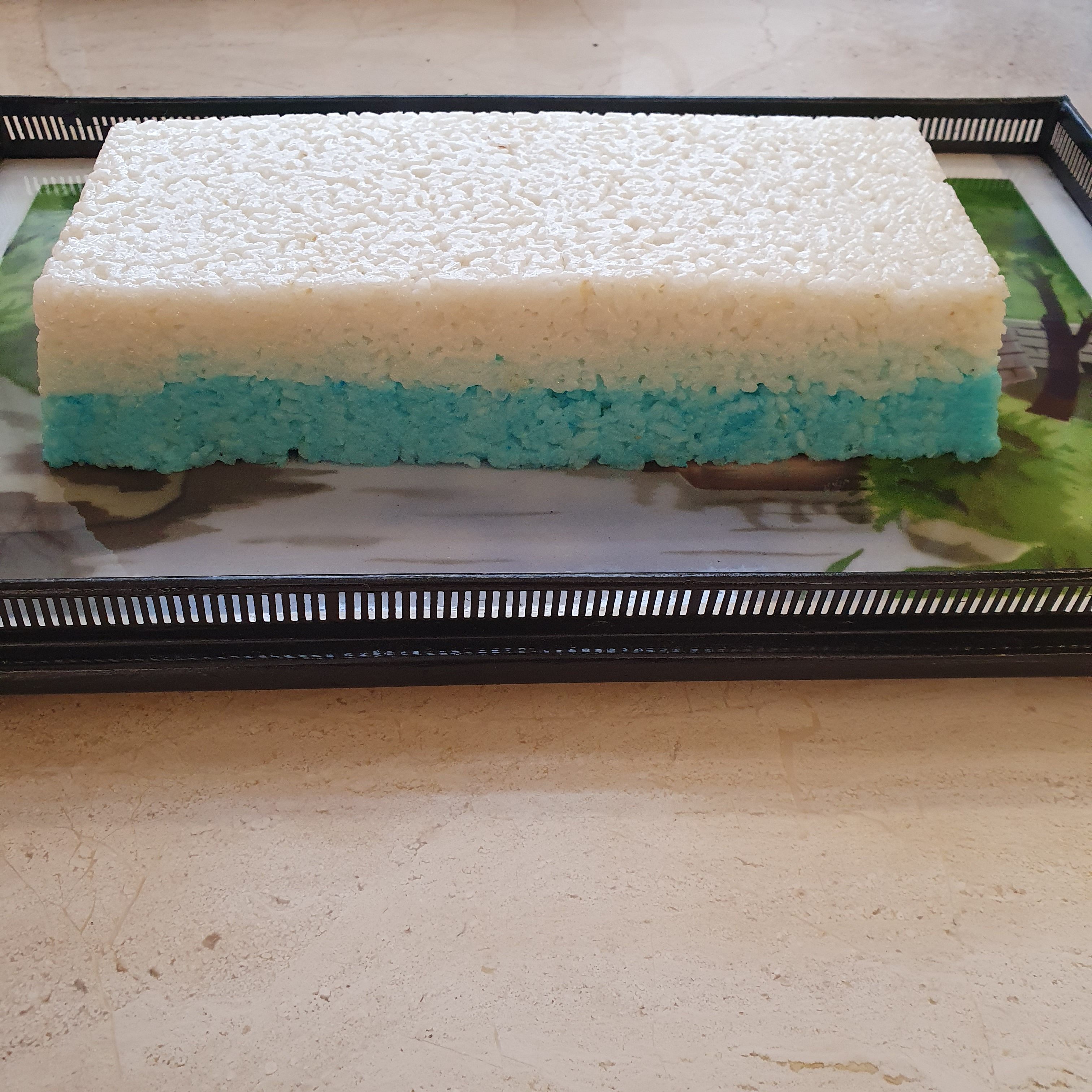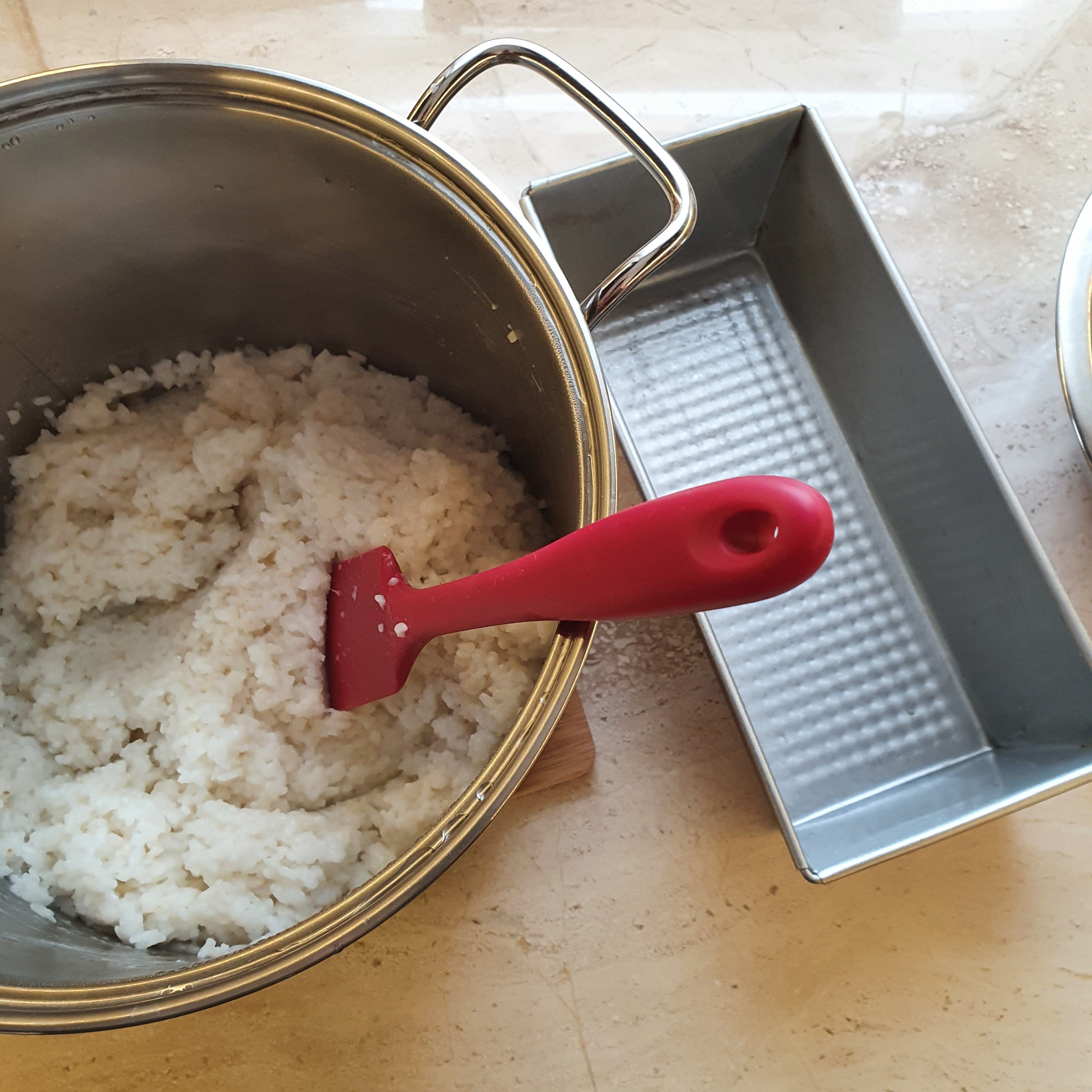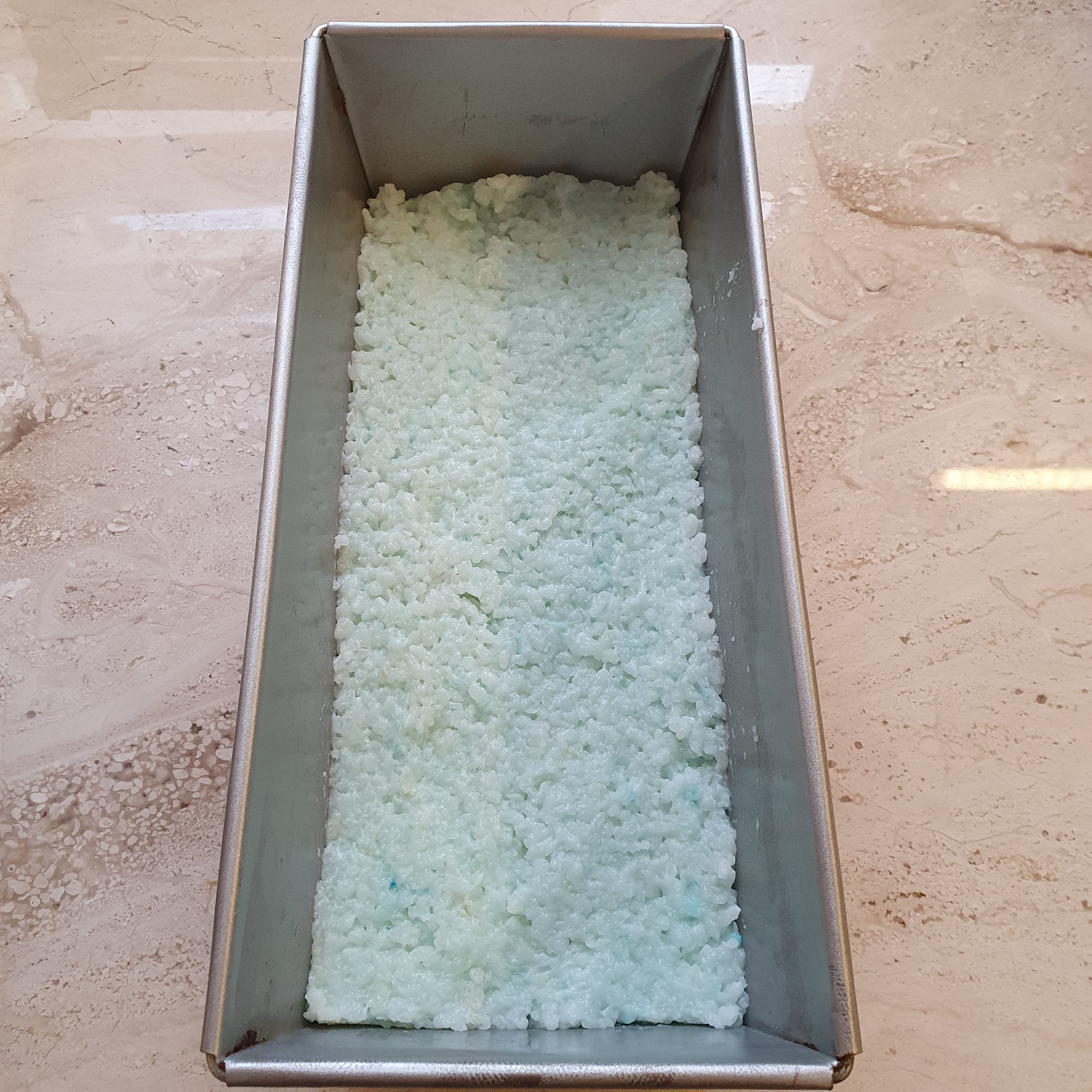 След това по оригиалната рецепта трябва да се добавят няколко капки пандан в 1/3 от сместа с ориза. Аз добавих малко боя. Изсипваме сместа във формата и заглаждаме внимателно, за да не нарушим долния пласт.