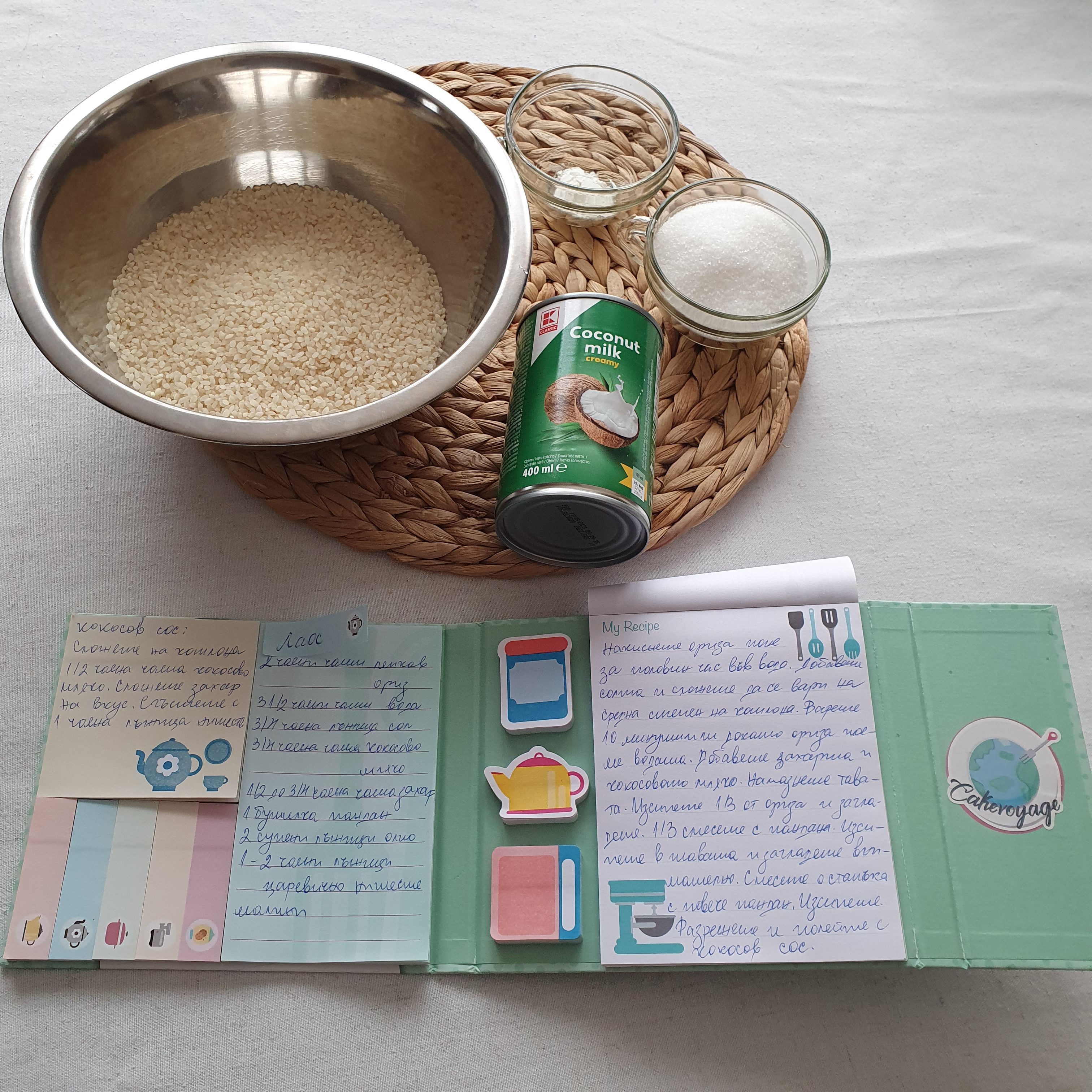 Както можете да предположите торти няма! Това, което избрах да направя се нарича “Sticky rice cake with coconut and pandan”. Може да се пише cake, но си е някаква вариация на мляко с ориз по нашенски само дето млякото е кокосово, а оризът лепкав. Някакви дребни детайли. 🙂 Ето какво е необходимо като продукти: