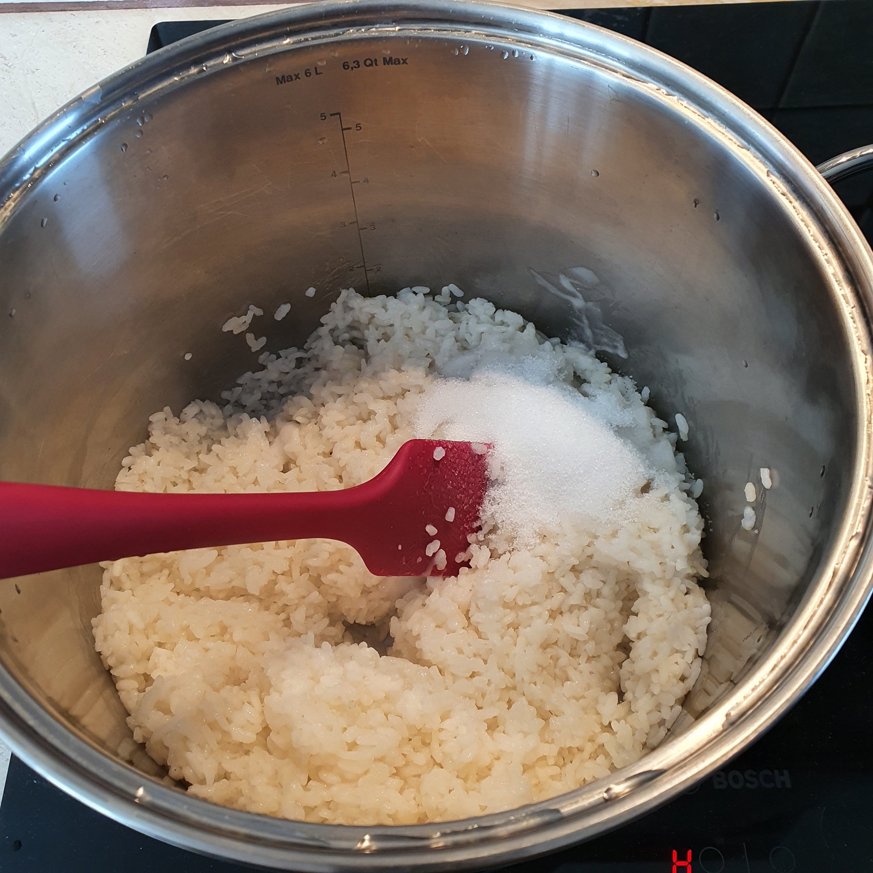 След това добавете 1/4 чаена чаша кокосово мляко и захарта. Разбъркайте добре да се поеме от ориза.