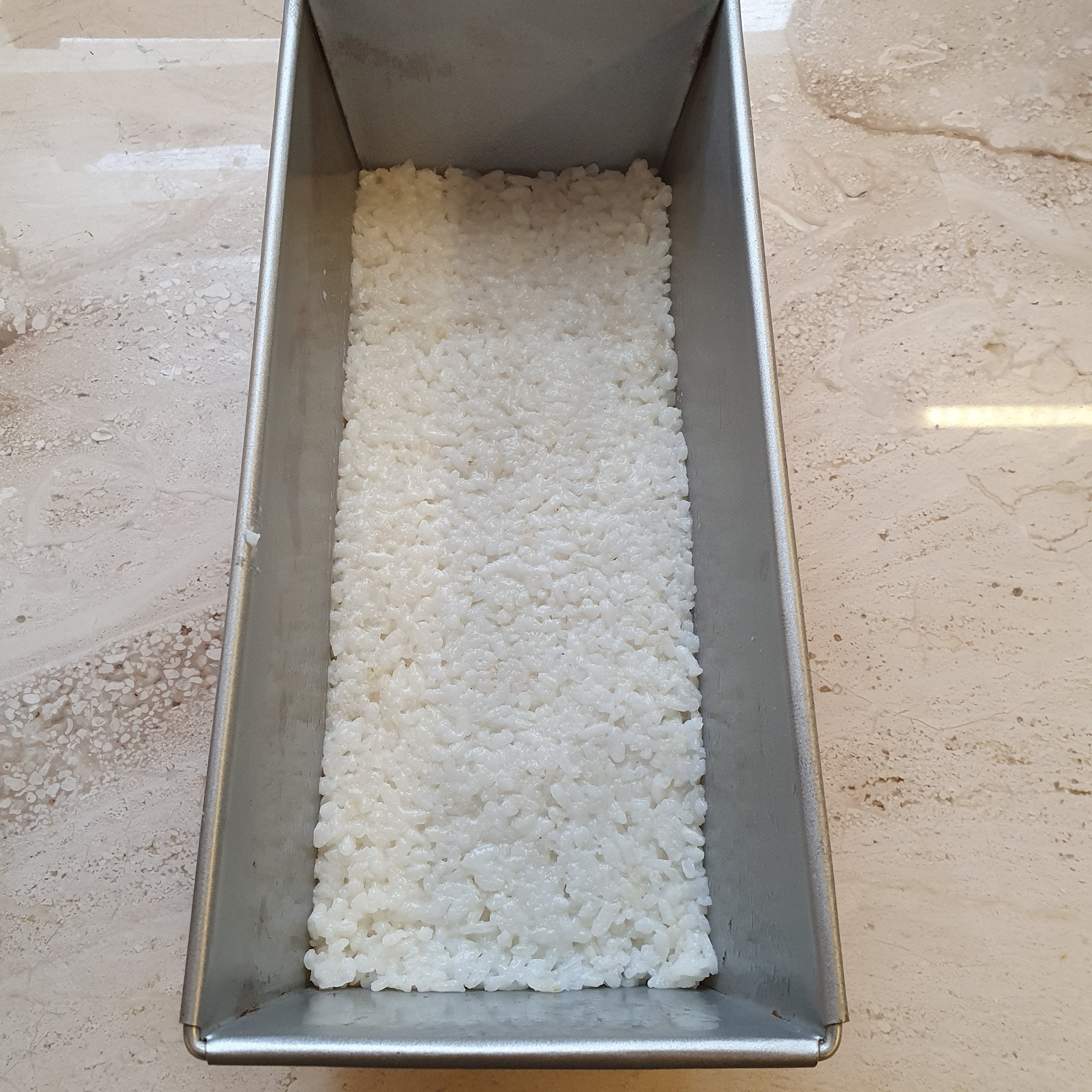 Намаслете форма за торта/кекс с олиото. На дъното сипете 1/3 от ориза и внимателно заравнете и загладете.