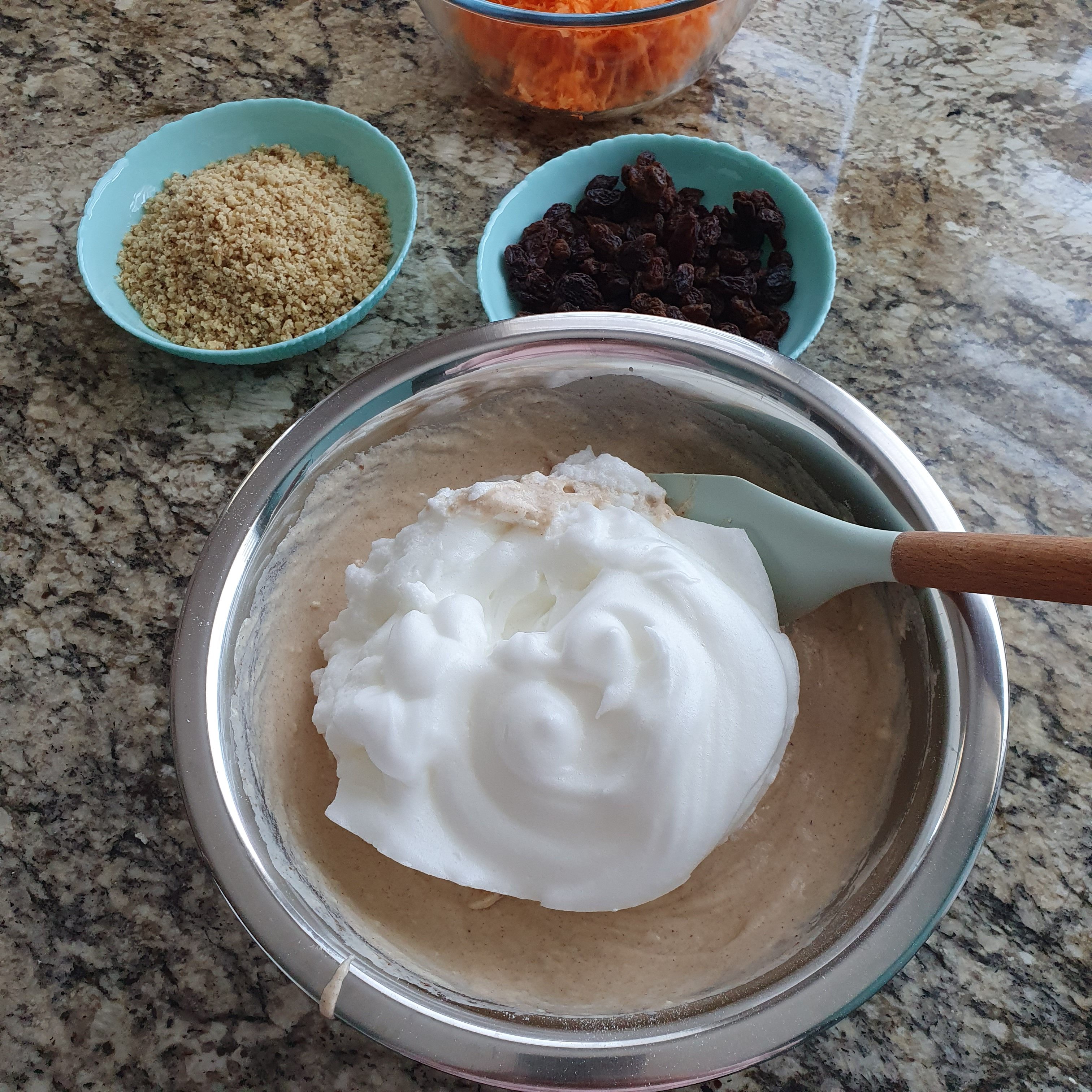 Разбийте белтъците до меки връхчета и внимателно ги добавете в сместа. Разбърквайте внимятелно с шпатула отдолу нагоре докато всичко се смеси.