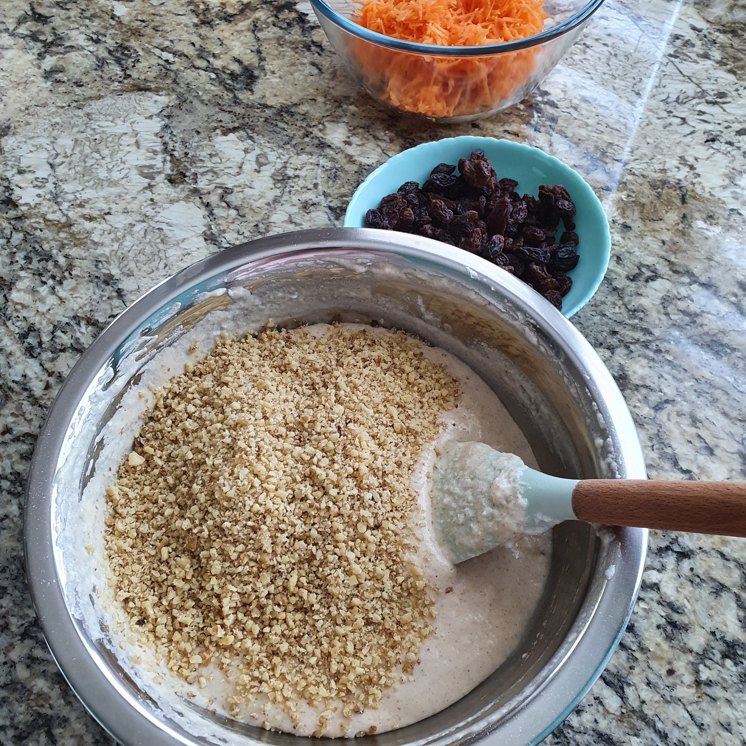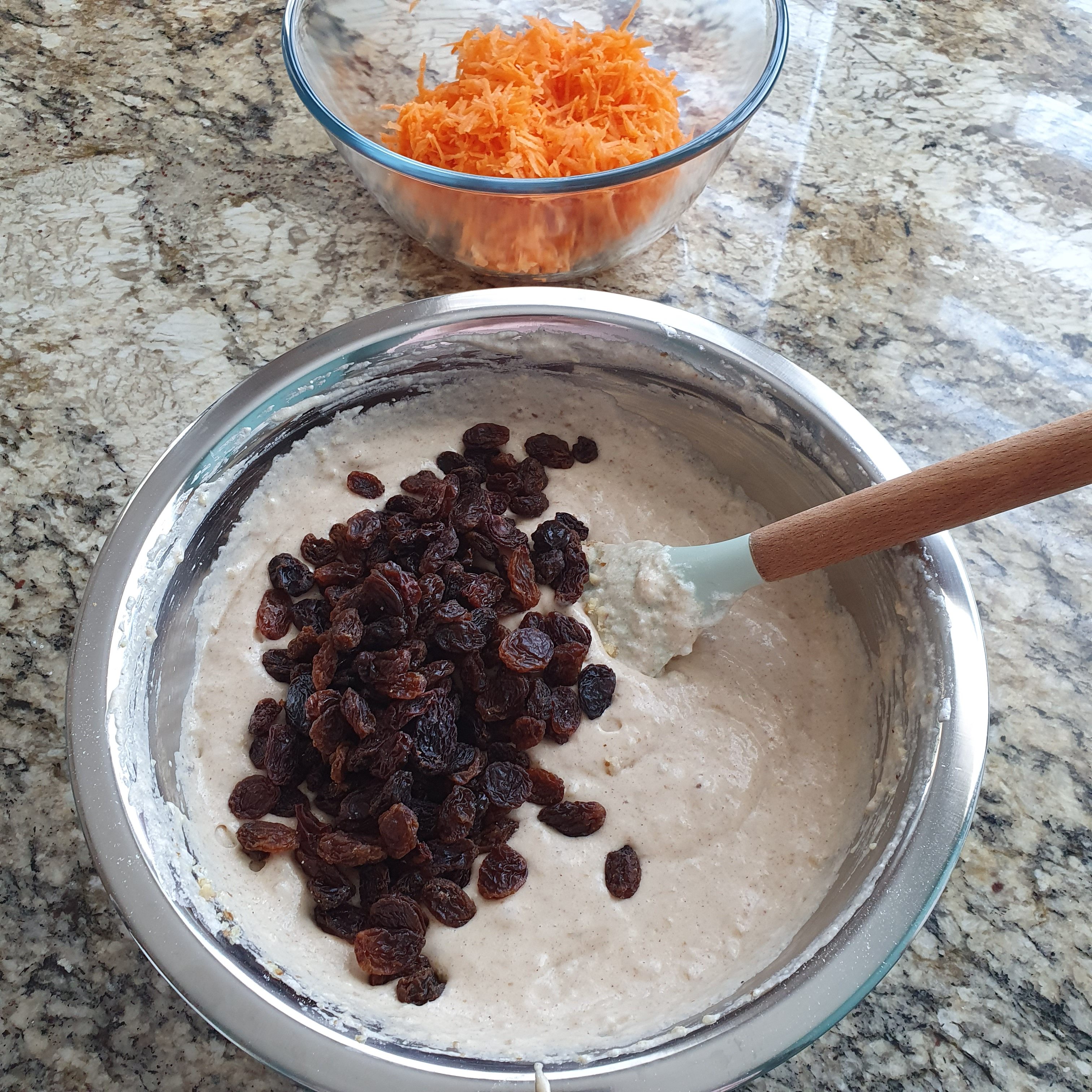 Добавете и стафидите и внимателно ги смесете с останалото.