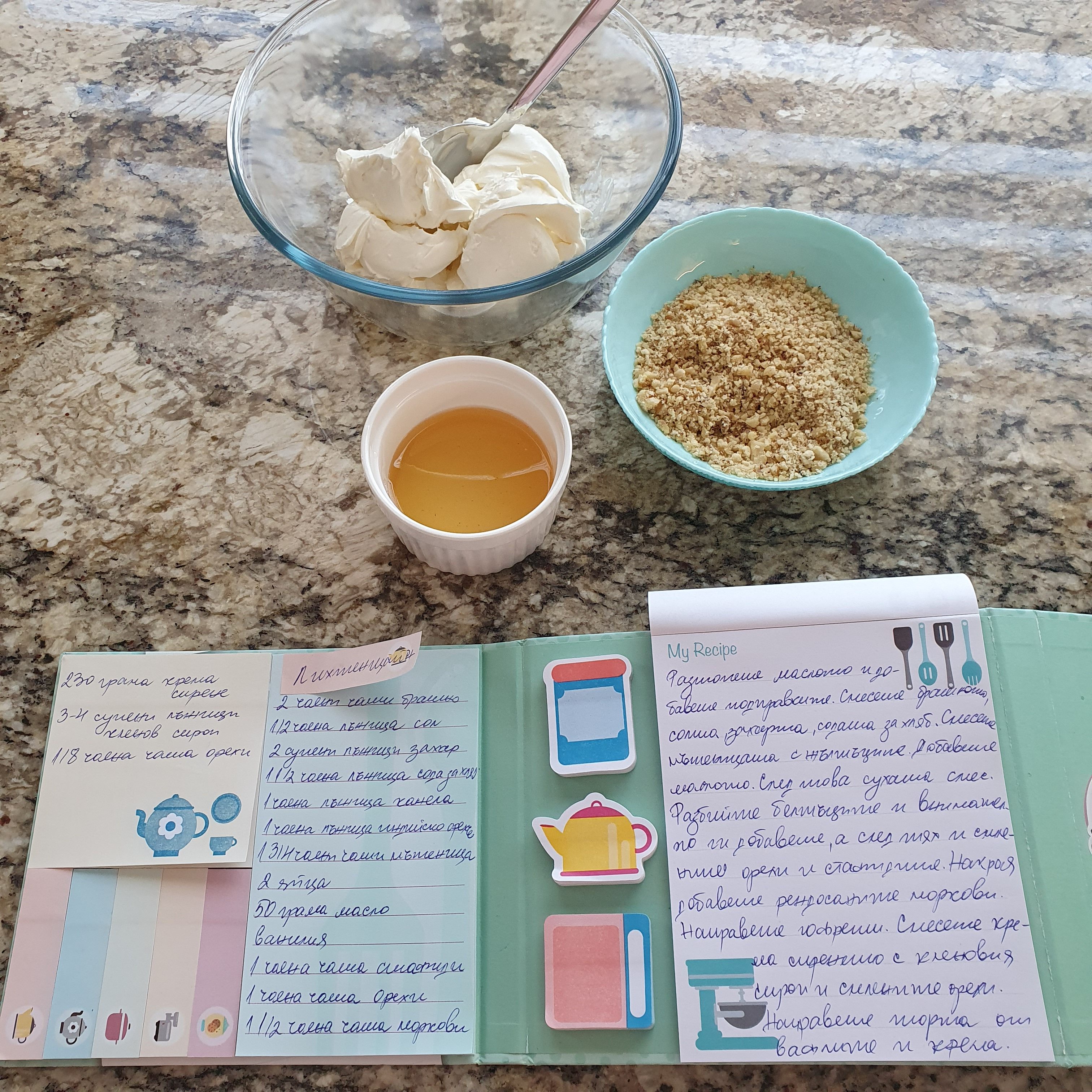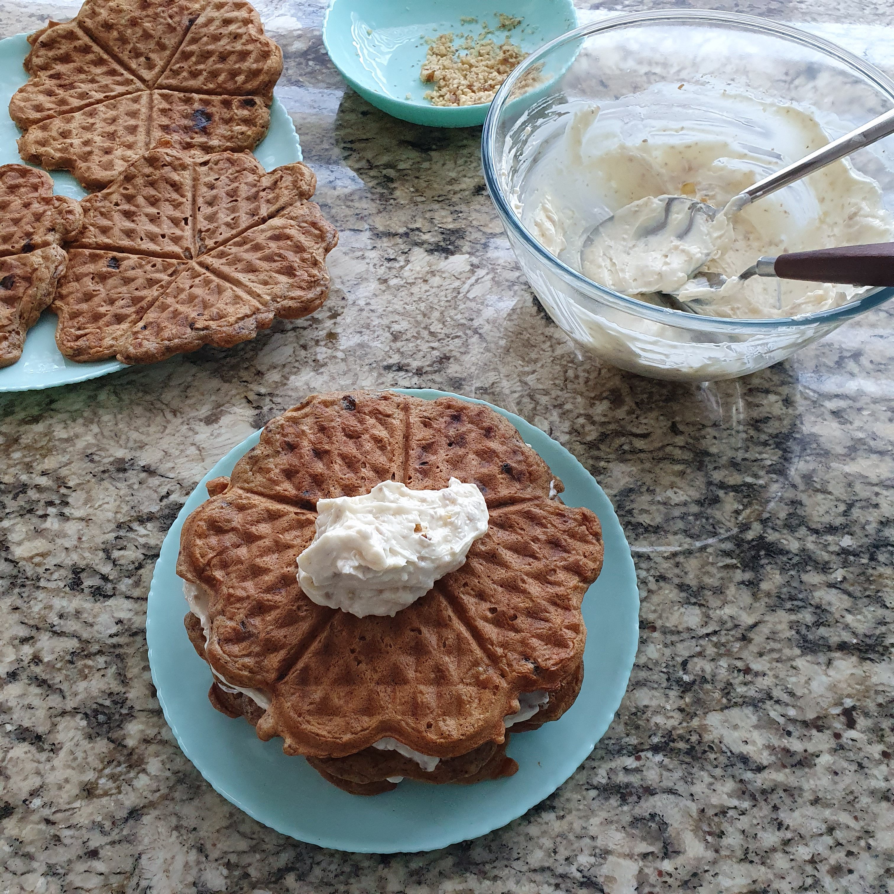 Дори и да не са със съвсем правилна форма не се тревожете. Тортата не е необходимо да е с идеално правилна форма. Докато леко изстиват гофретите направете крема. Той е възможно най-лесен за приготвяне. Разбъркайте всички съставки с лъжица докато се смесят. Аз оставих малко количество смлени орехи за украса.