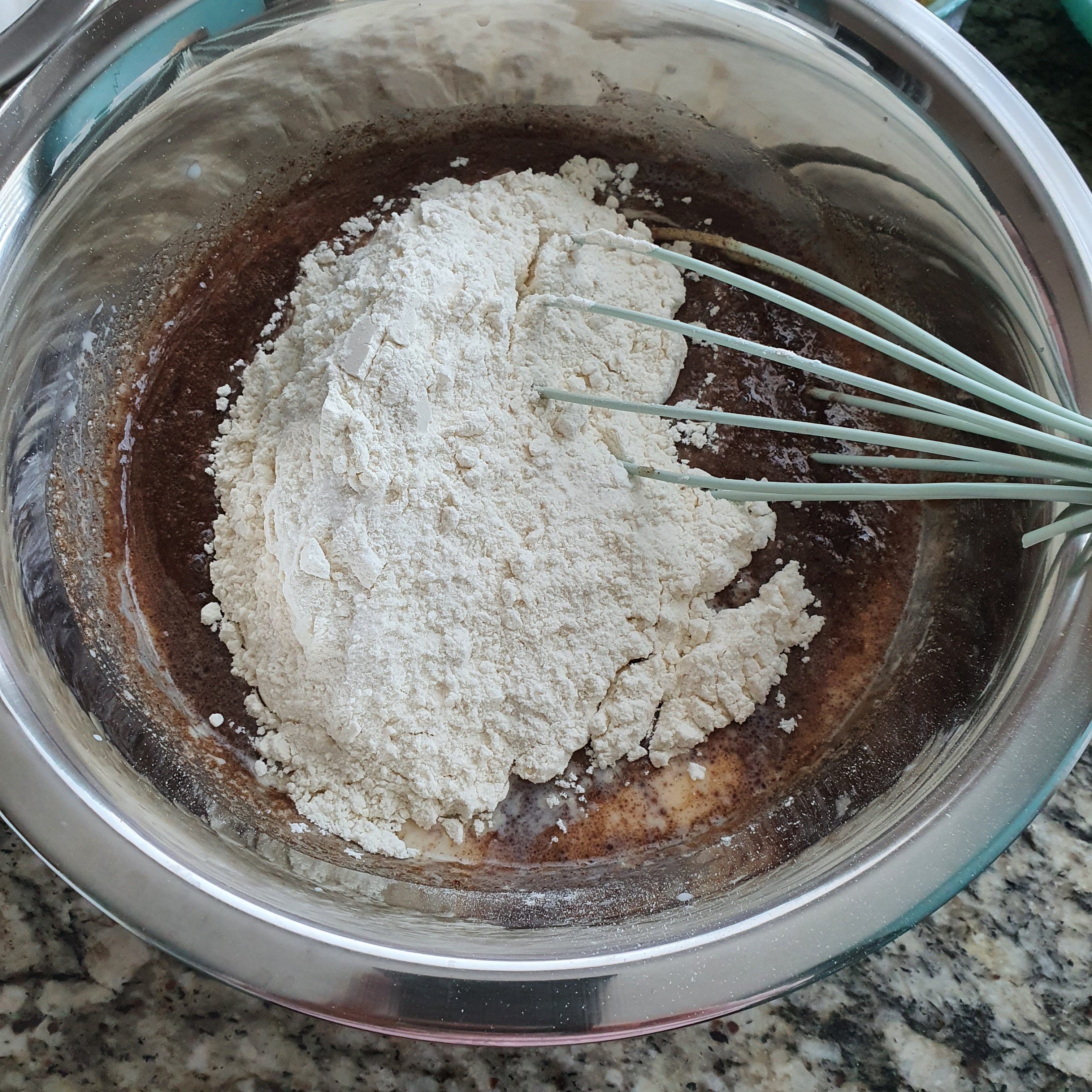 Смесете брашното, солта, захарта, содата за хляб и ванилията и ги добавете към яйчено-маслената смес.