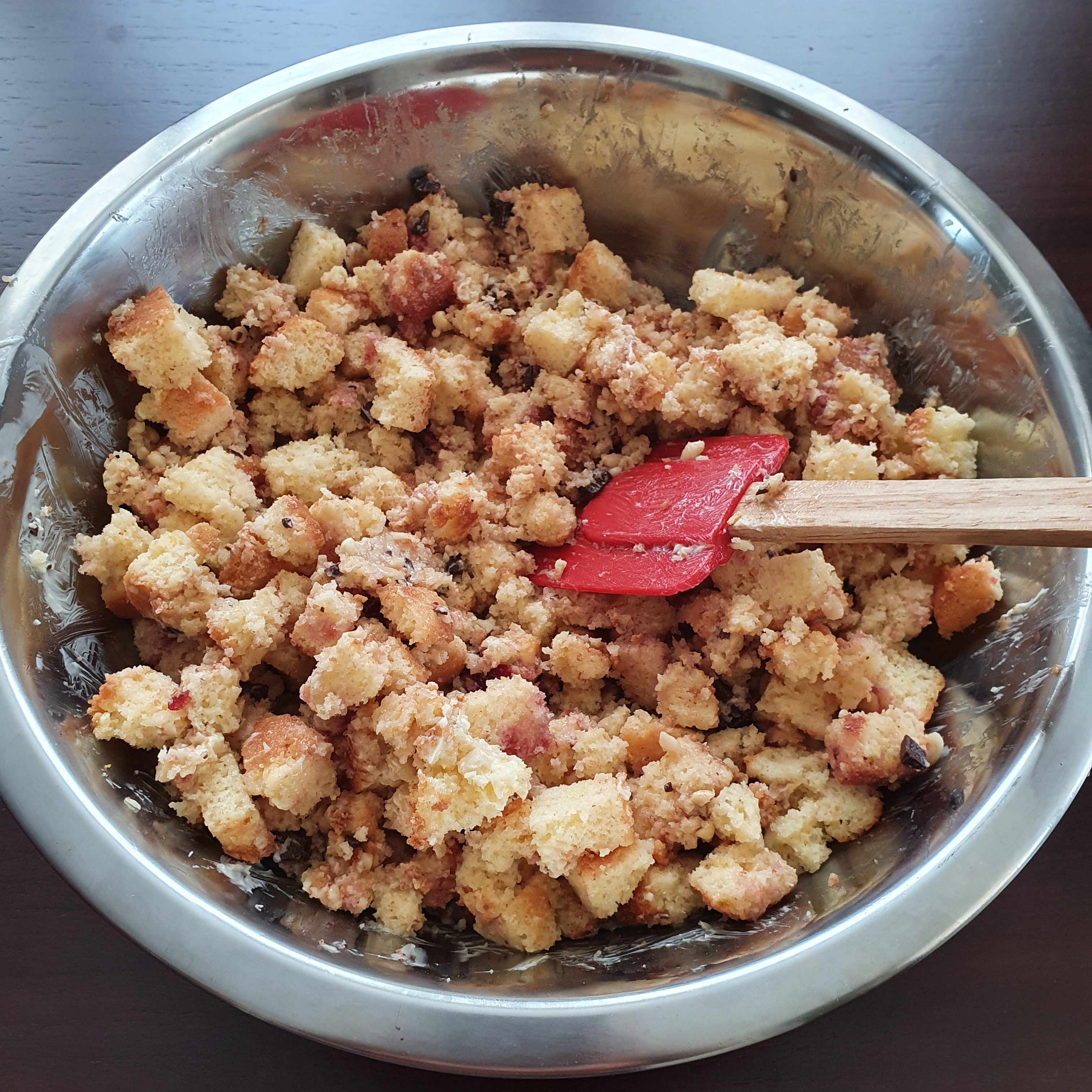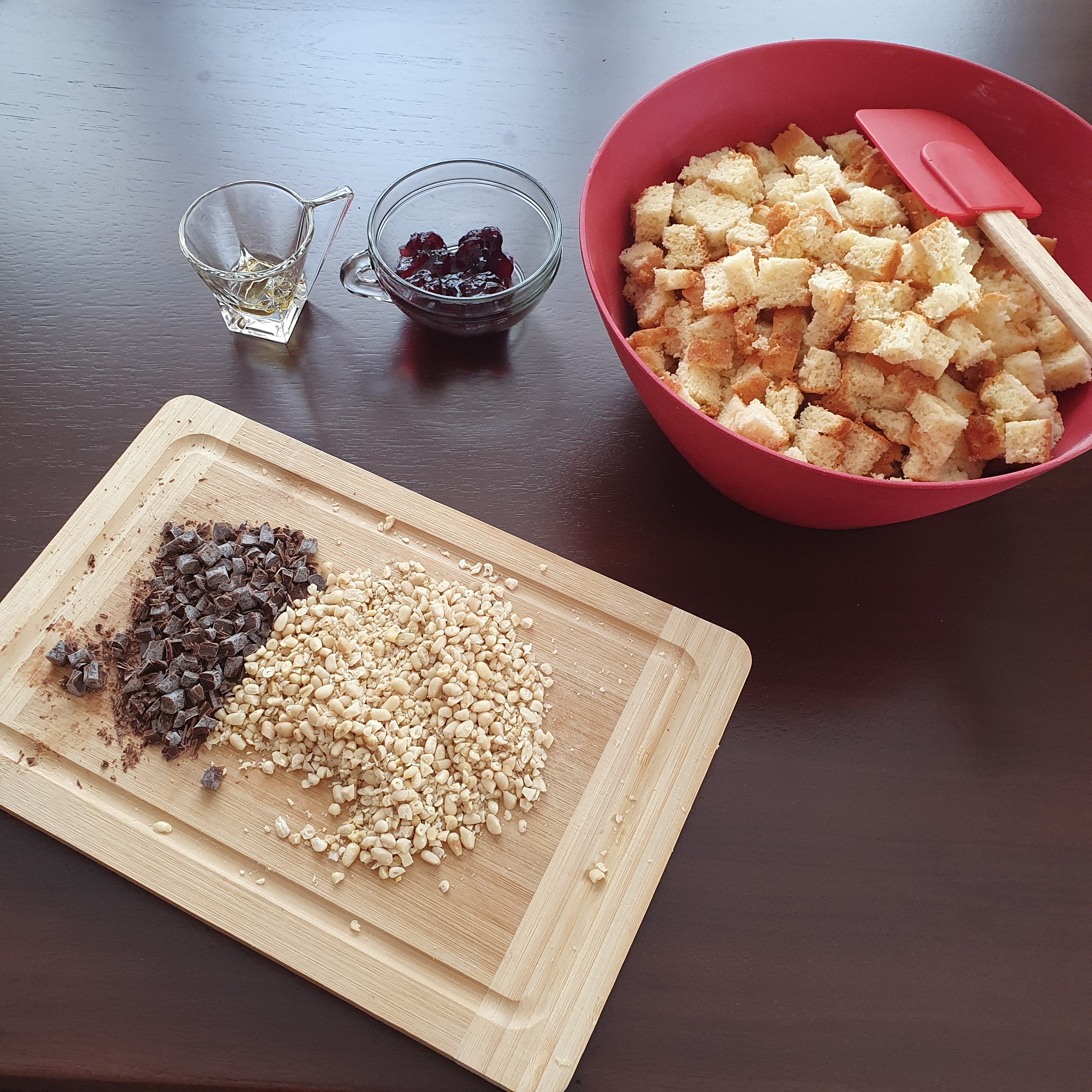 След като блатът изстине напълно го нарежете на малки кубчета. Полейте го с уискито. Добавете нарязаните кедрови ядки, шоколадовия чипс и коктейлните череши. Тъй като не успях да си намеря такива (напоследък все по-трудно намирам) ги замених с вишни от сладко. Според мен от това пострада леко хрупкавостта, но се вписа добре като вкус.