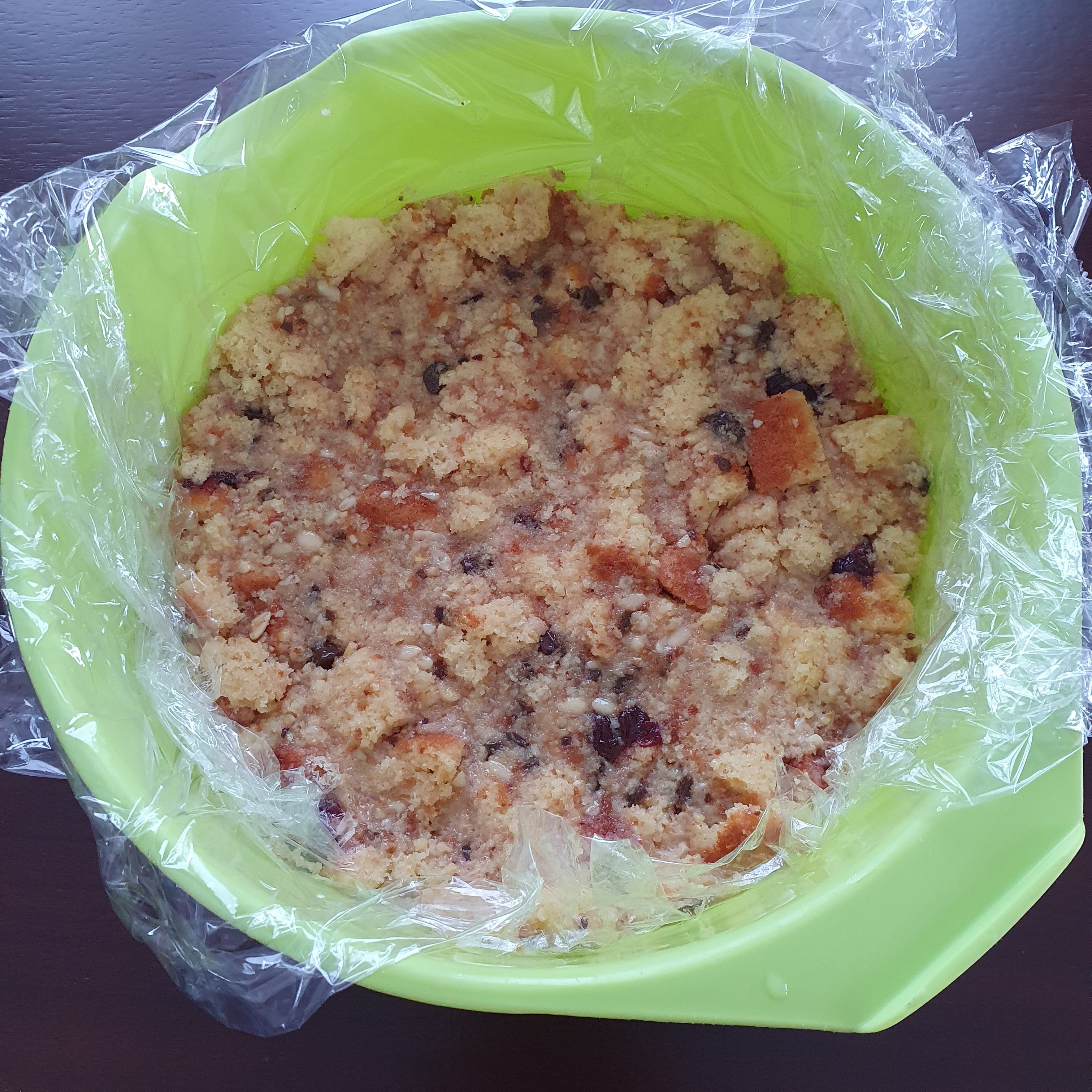 Застелете купа с фолио засвежосъхранение и изсипете сместа. Леко притиснете, за да се оформи като полуокръжност.