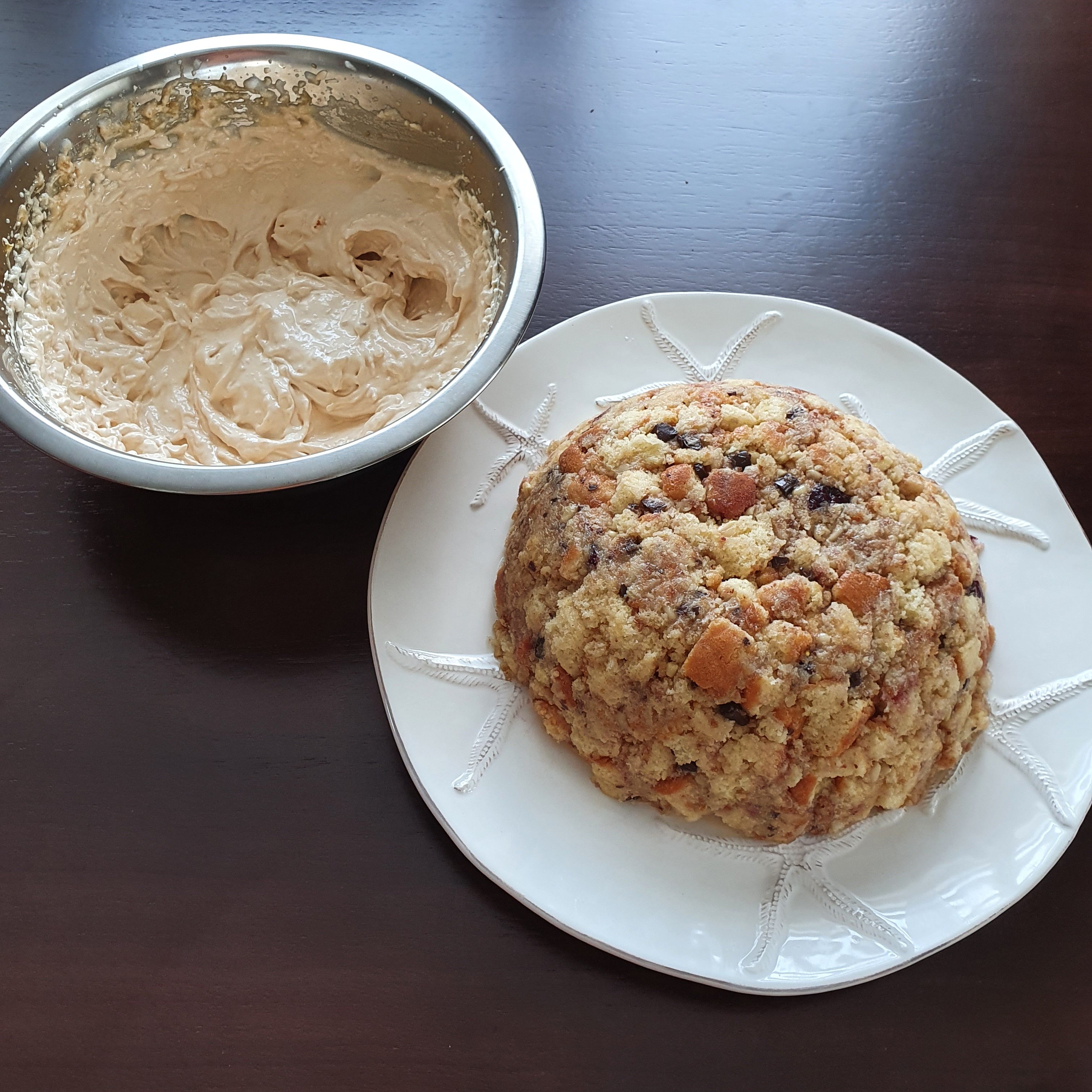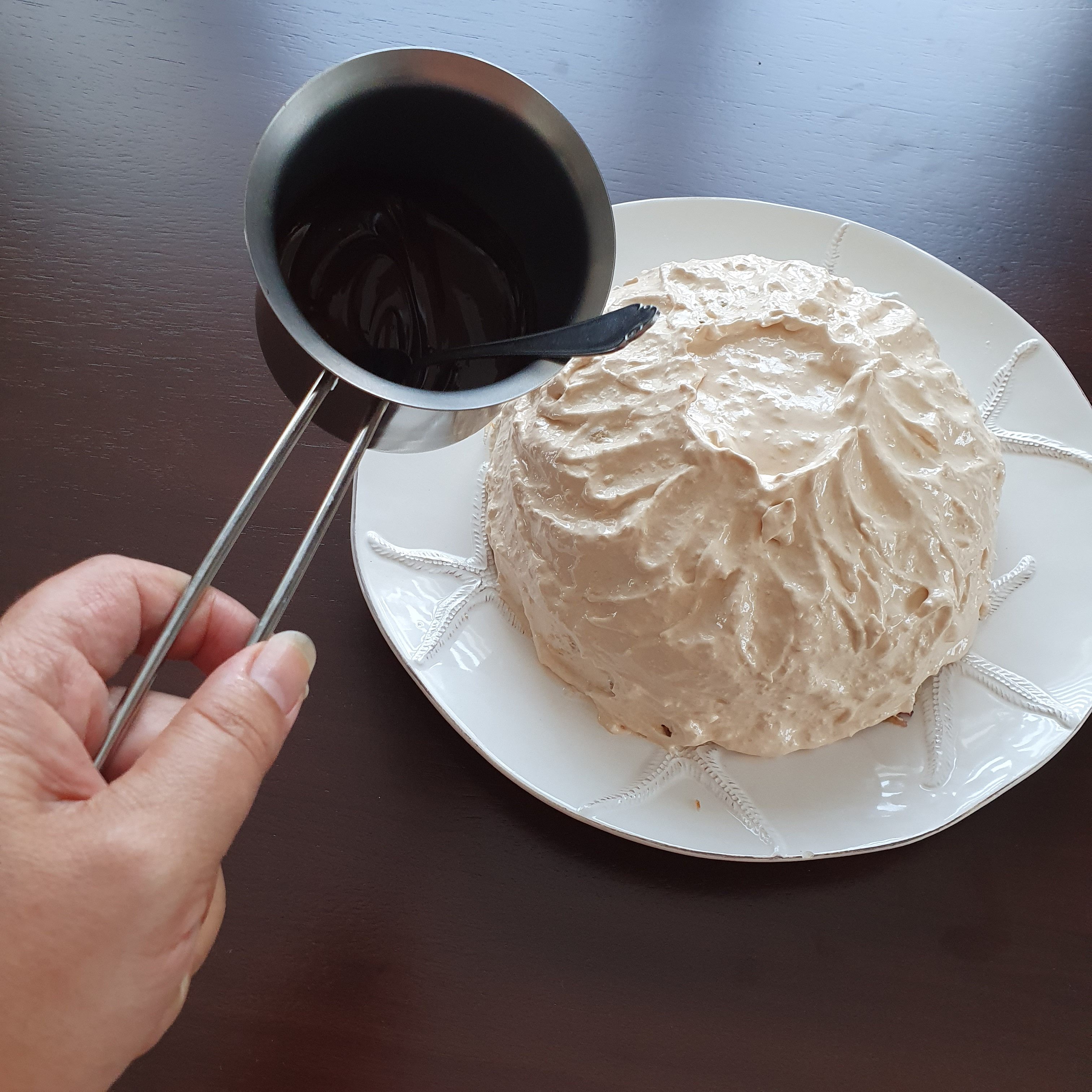 Или аз не успях да се справя с мултитаскинга или новият ми термометър не мери вярно, или нещо не съм го използвала добре. Факт е, че сиропът леко стана на карамел, което не беше идеята. Все пак реших да опитам да видя какво ще стане, защото много пъти съм правила истински сполучлив меренг и сега откъде да знам, може да направя откритие. 😀 Последователността е да изсипете на тънка струйка сиропа в белтъците като през това време миксерът работи на максимална скорост. Разбивате около 10-12 минути и меренгът е готов. Обръщате тортата върху чиния и я измазвате с меренга.