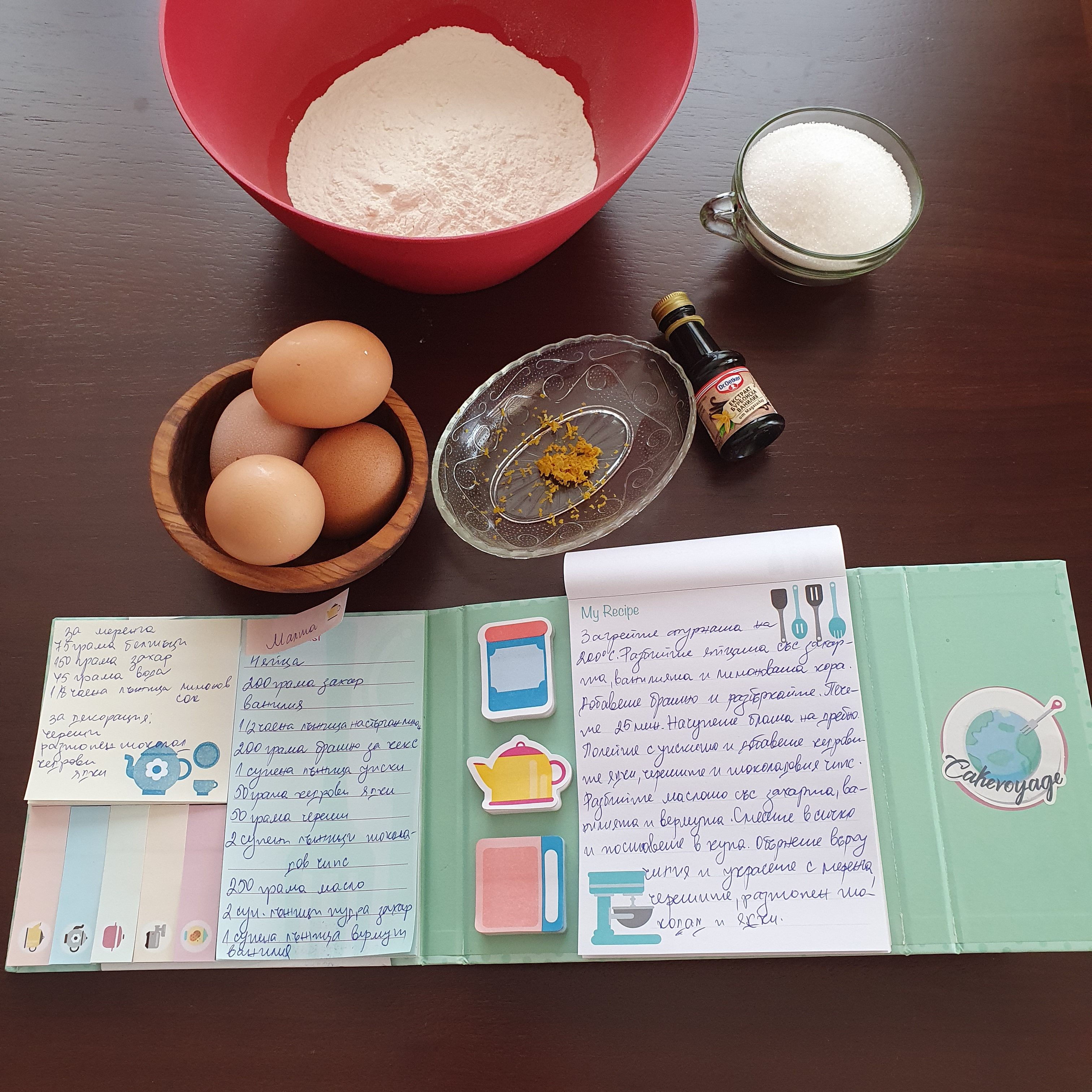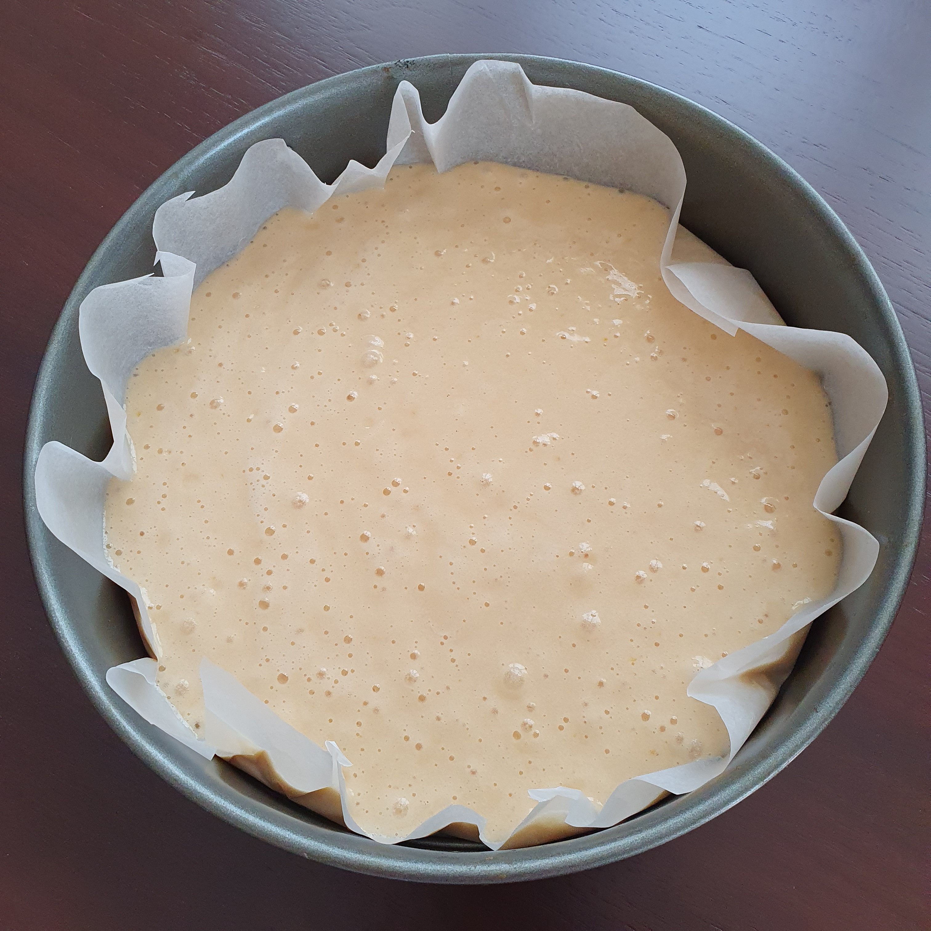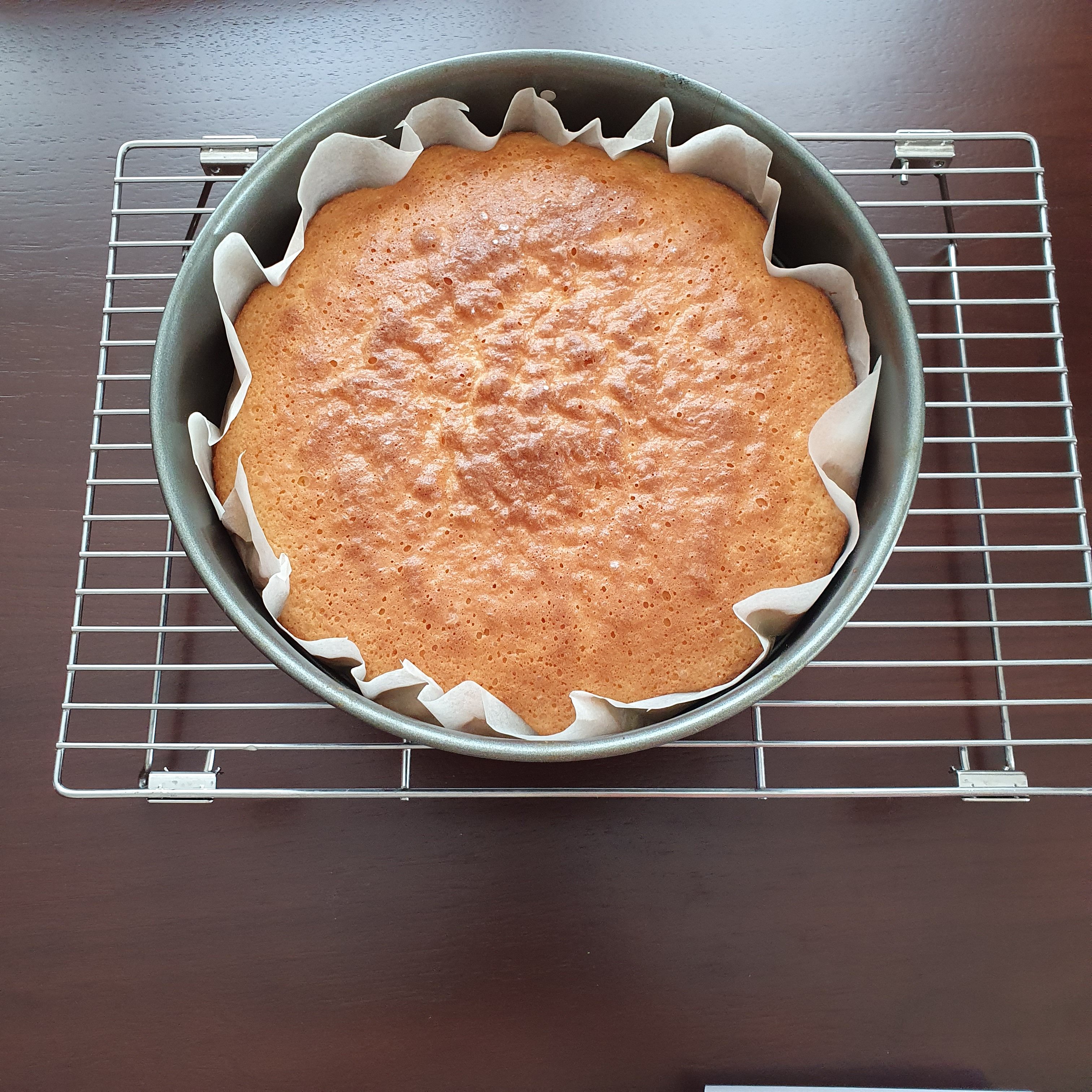 Загрейте фурната на 200 градуса. Разбийте яйцата и захарта. Добавете настъргана кора, ванилията и брашното и объркайте добре. Печете 25 минути или до готовност в тава намазана с масло. Аз реших да използвам хартия за печене за по-лесно, а и не търся перфектно оформен блат. 😉