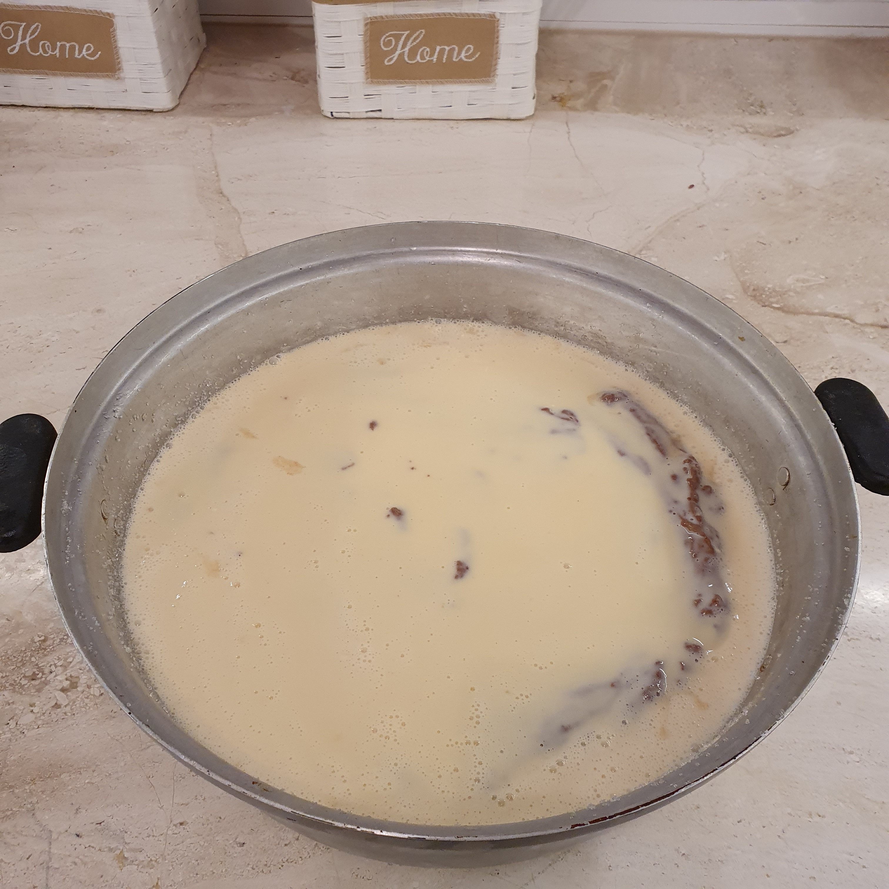 За жълтата смес първо разбийте яйцата. Добавете сметаната, кондензираното мляко, ванилията и брашното и разбийте до хомогенност. Внимателно изсипете сместа върху кафявата в тавата. И тук ще се учудите защо в тази последователност изсипваме, но нали трябва да има магия. 😀 По време на печенето жълтата смес ще отиде под кафявата и то без ваша намеса. Магия.