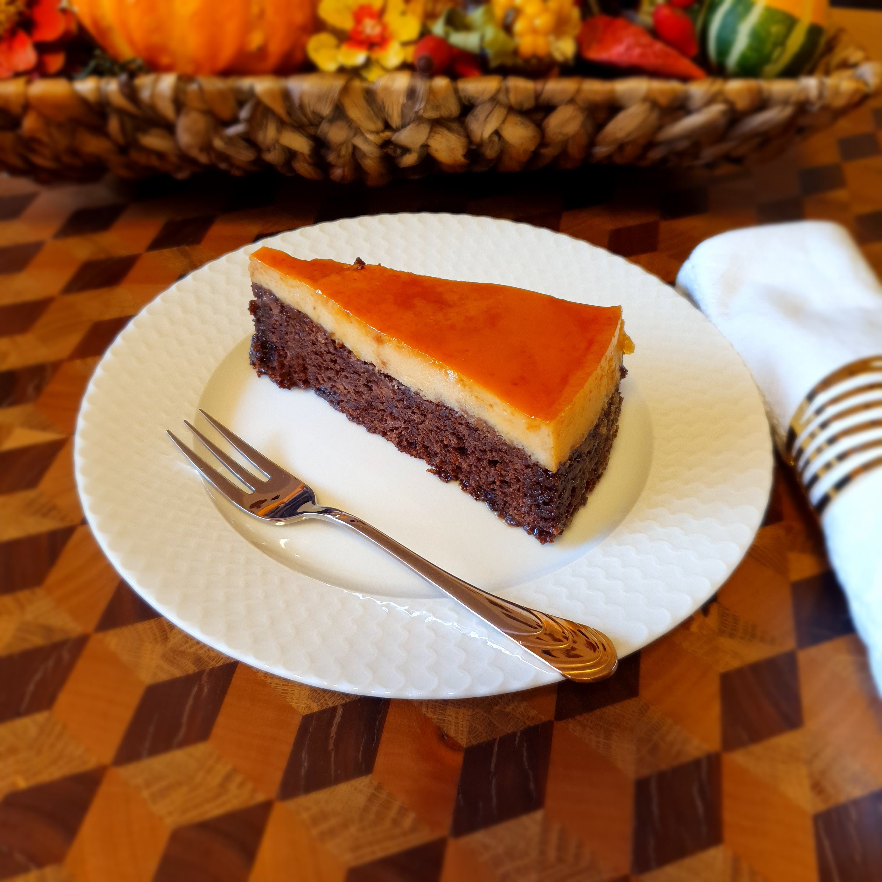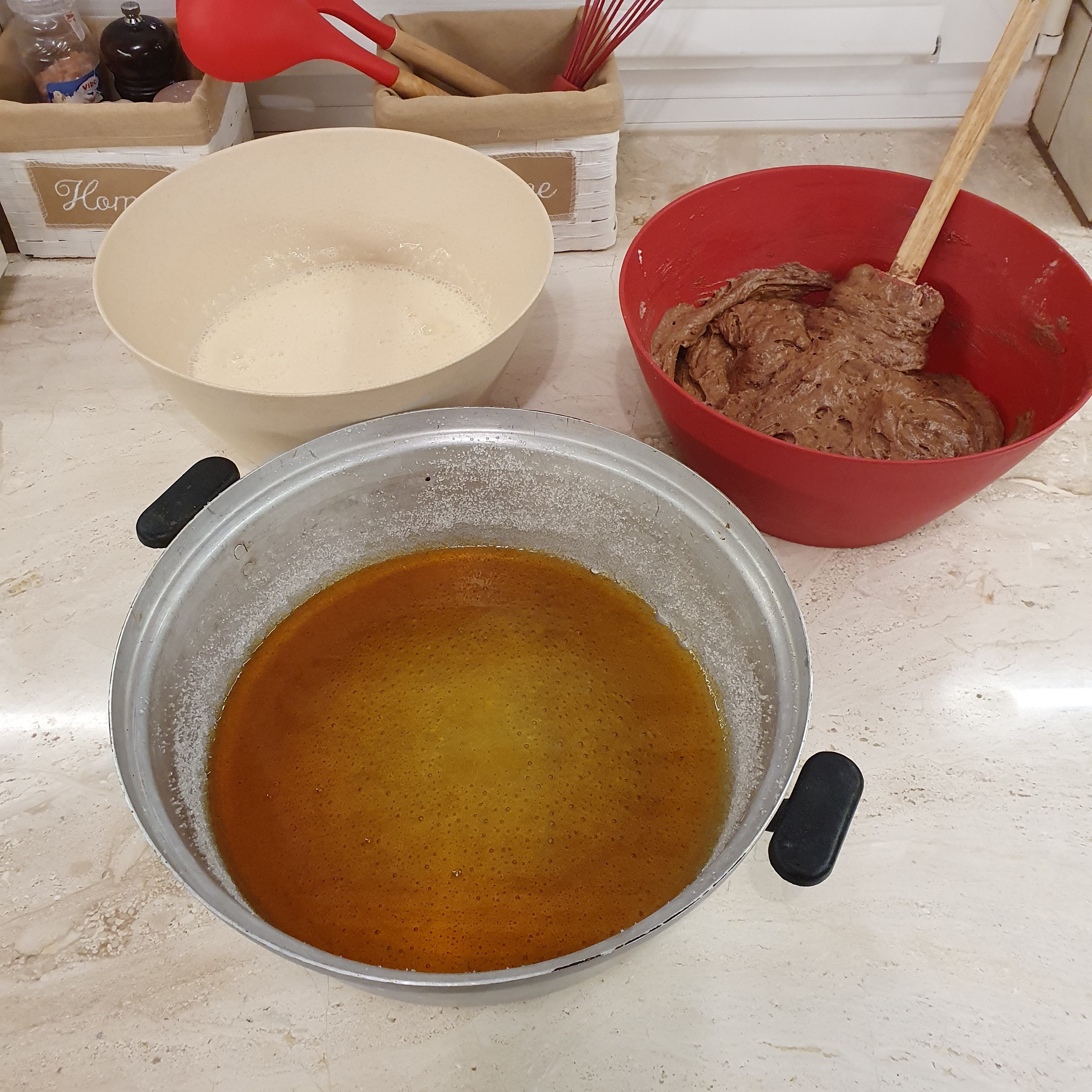Сладкишът много прилича на ‘арабския си братовчет'(реших да ги свържа някакси, 😉 ) КОДРИТ КАДИР, но с малки различия(естествено!): кремът при втория се приготвя с мляко( класически крем-карамел) и последователността на прибавяне на слоевете: първо крем, а след това по средата се налива кафявата смес. В крайна сметка резултатът е същият – магичен вид и вкус.